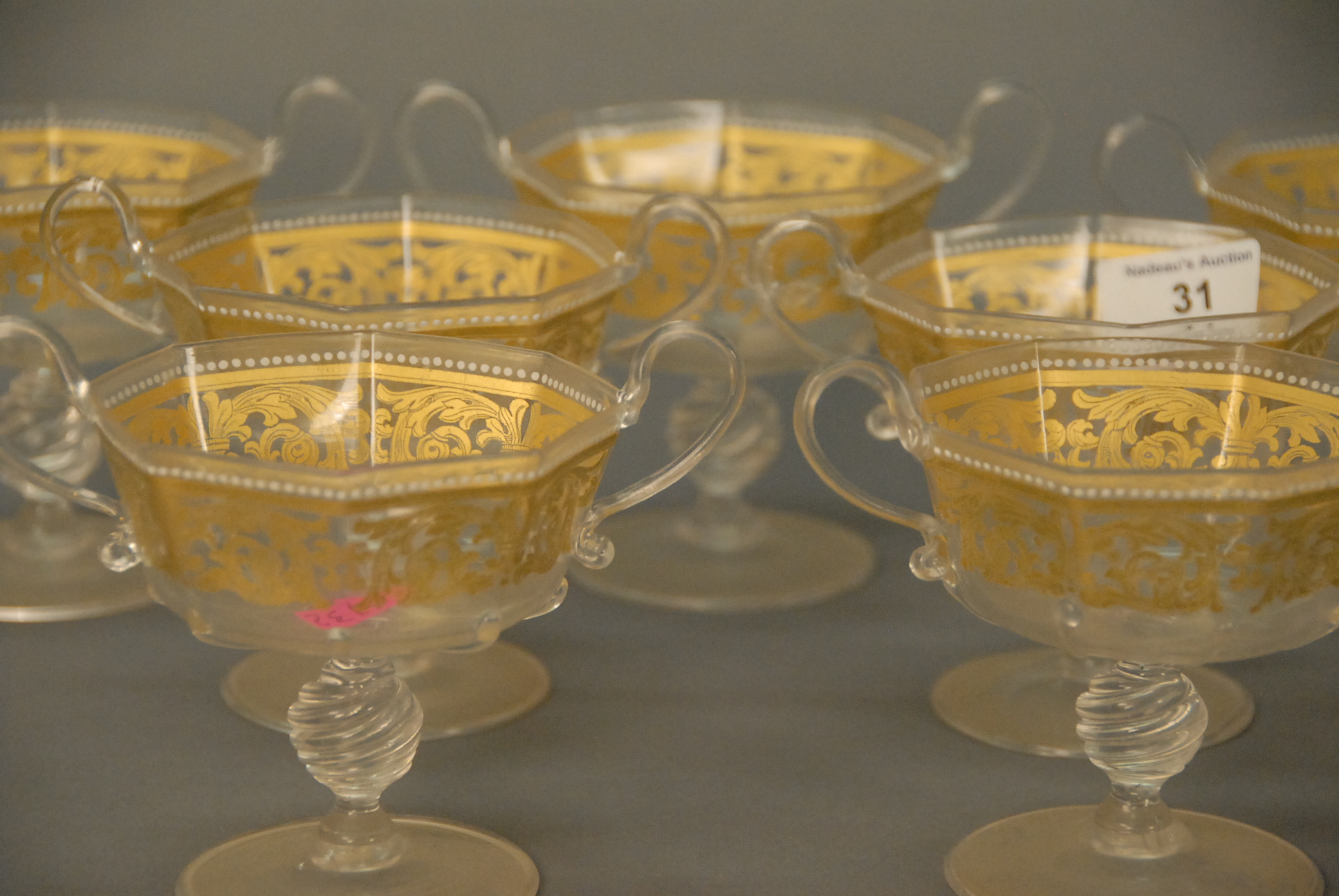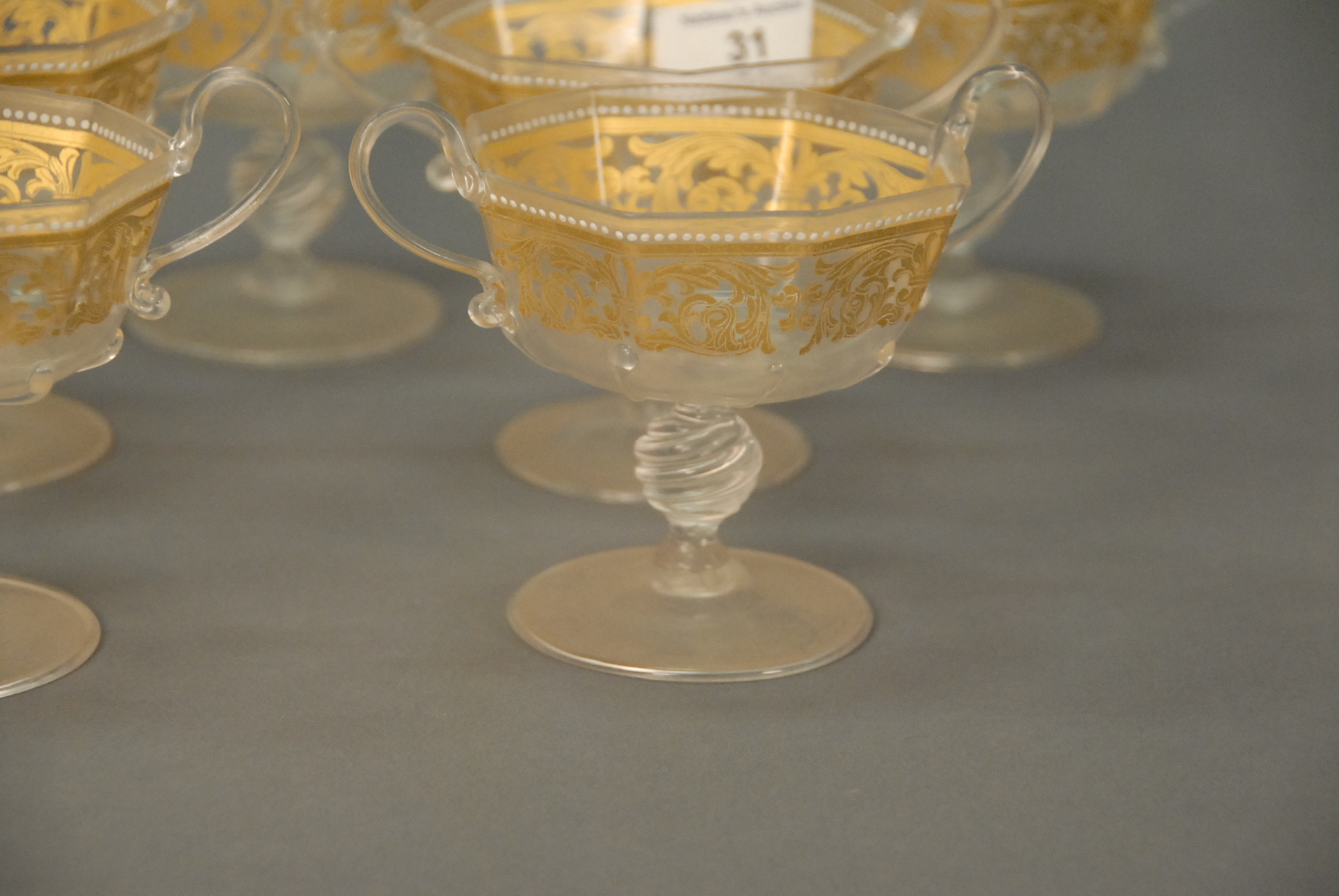Set of seven Venetian glass champagne stems with handles, ht. 4 1/2in.