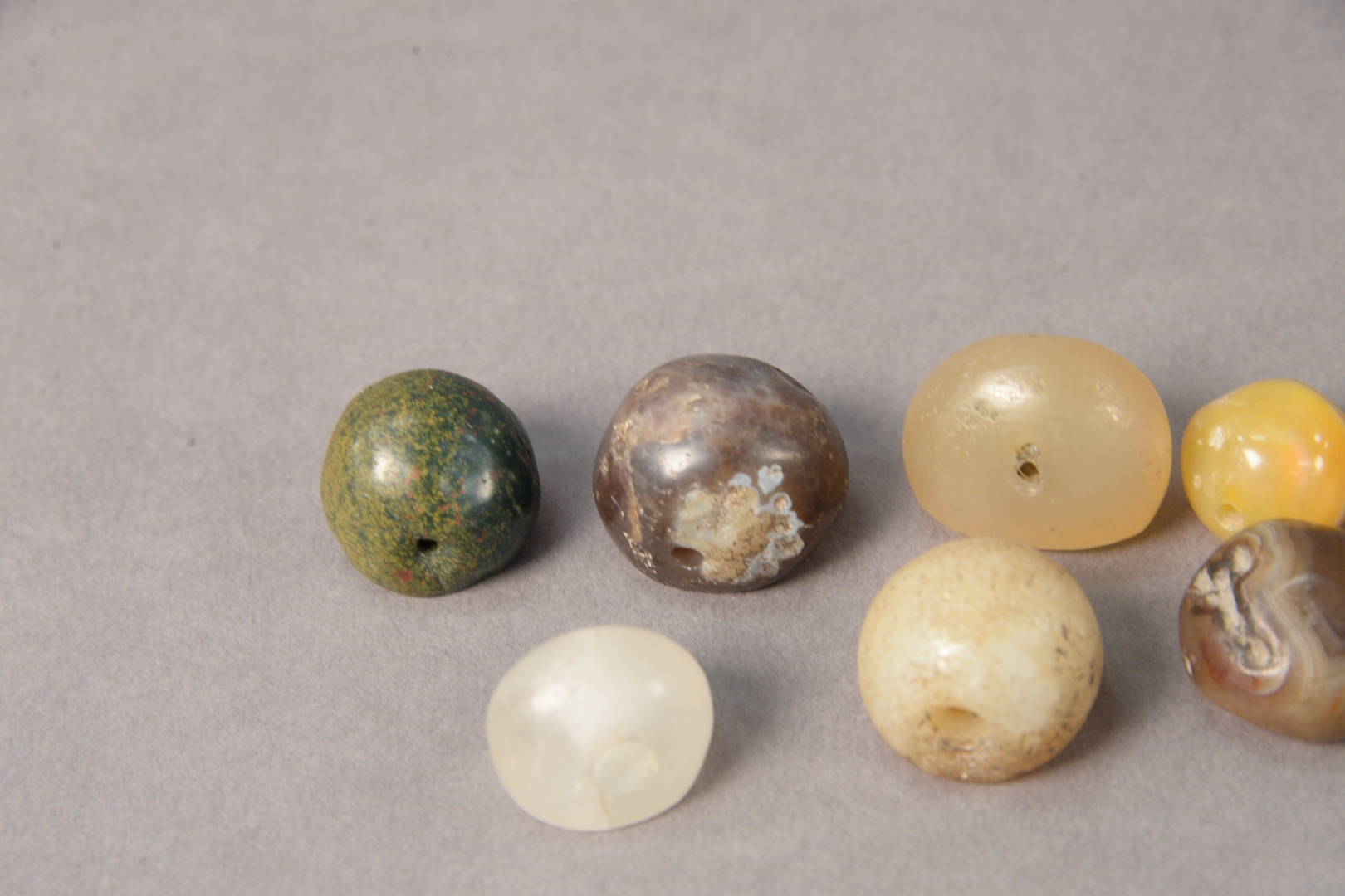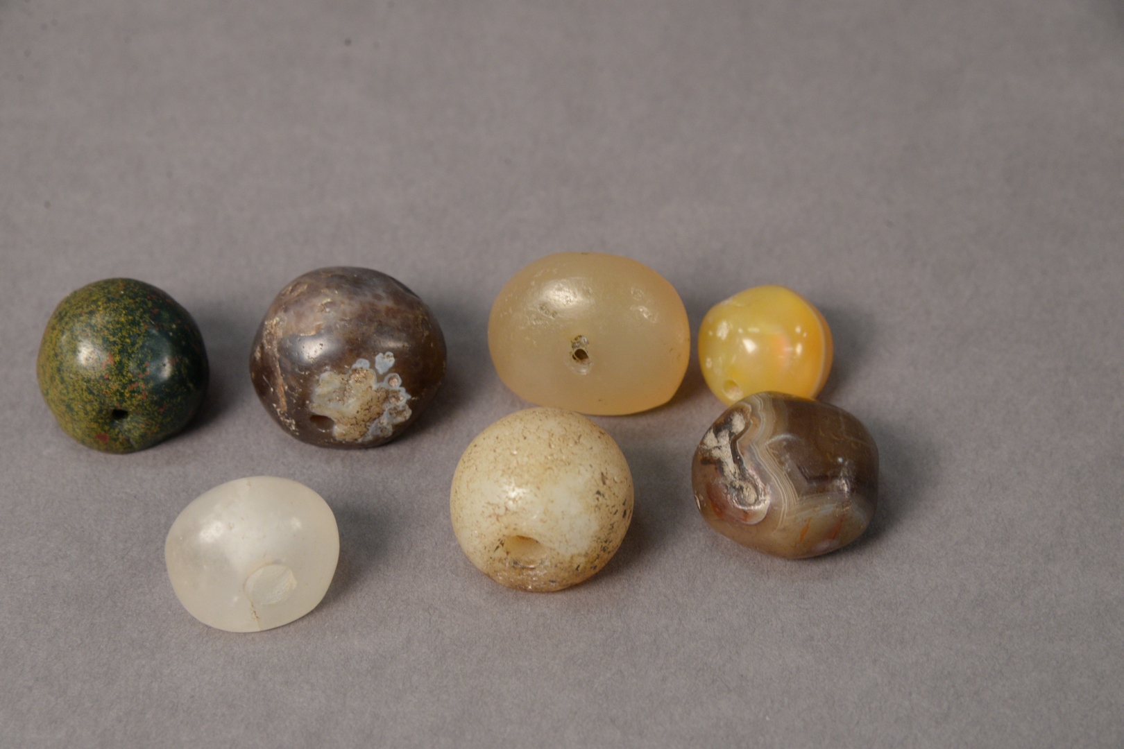 Lot 31: Seven Ancient Carved Stone Seals, having carved busts, eagle, lion, winged griffin and capricorn, approximately 1 inch each.