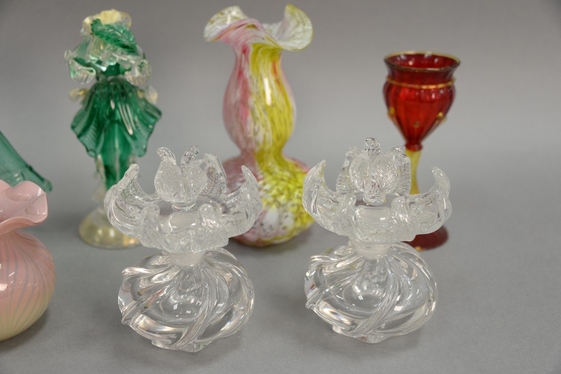 Seven piece art glass group to include a pair of Venetian glass figures as is, Venetian glass stem, Murano Burmese bud vase, pair of crystal perfumes, and an art glass vase. ht. 3 1/2in. to 8in.
