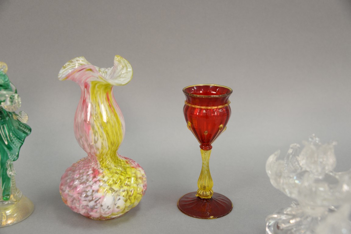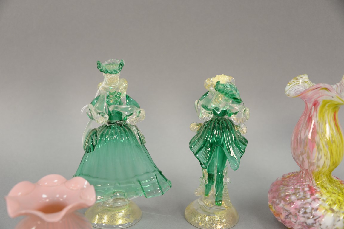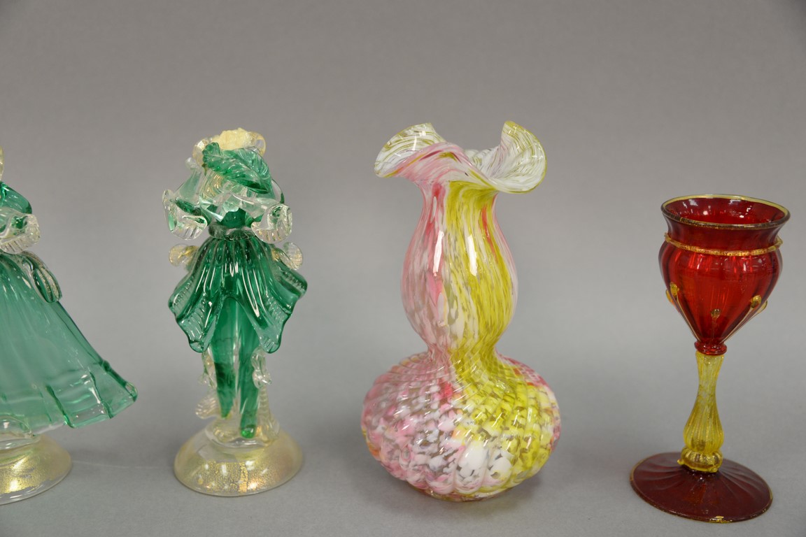Lot 31: Seven piece art glass group to include a pair of Venetian glass figures as is, Venetian glass stem, Murano Burmese bud vase, pair…
