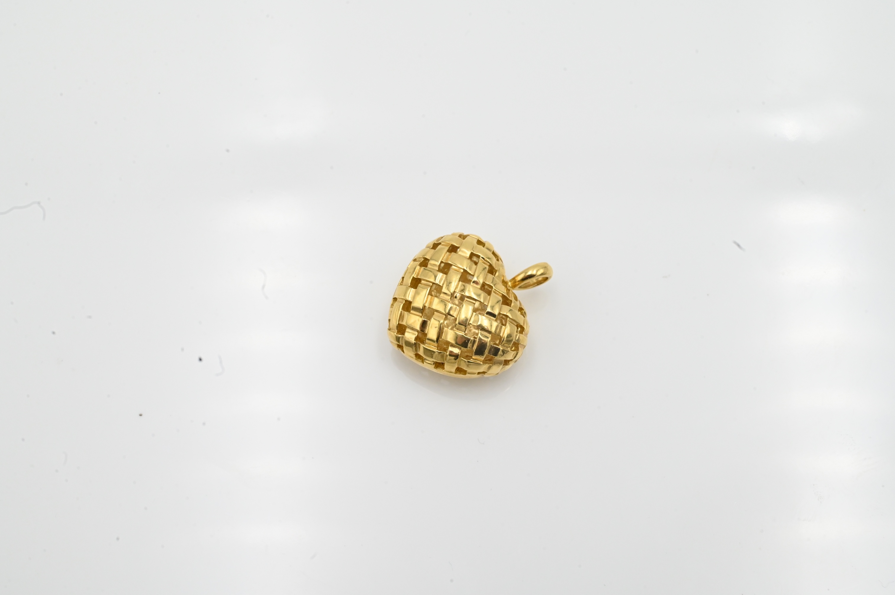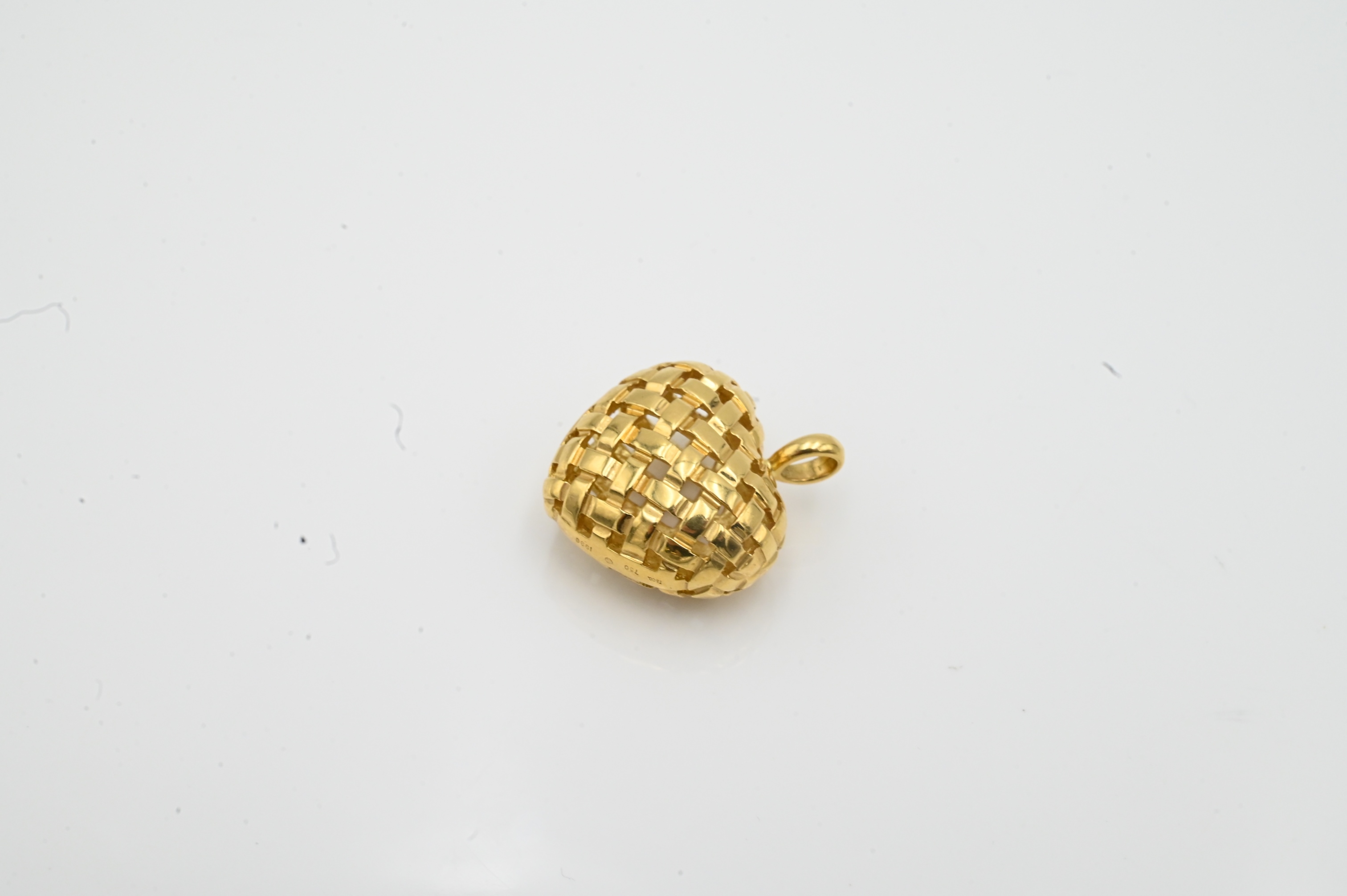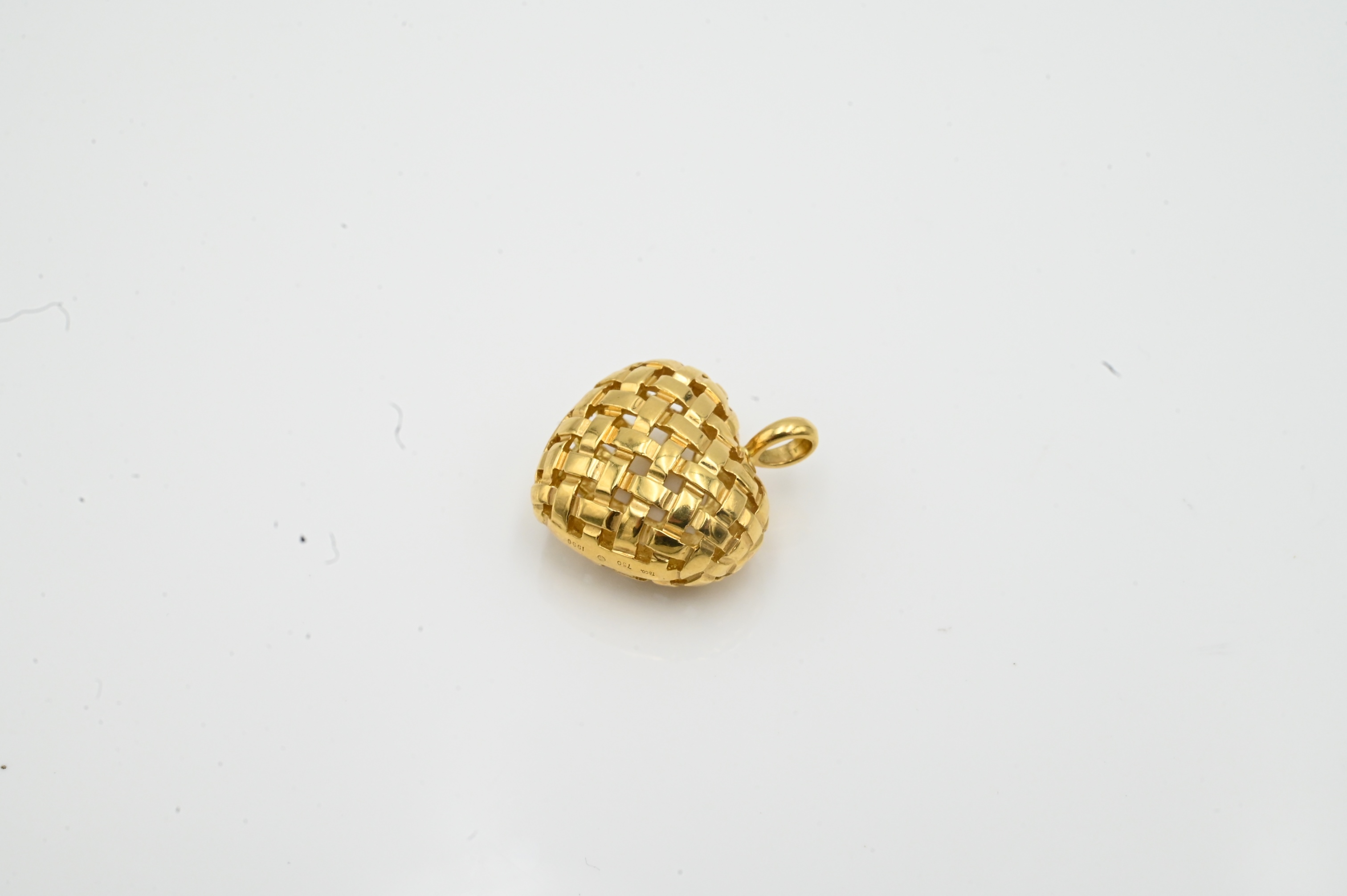 Tiffany & Company 18 Karat Yellow Gold Heart Pendant, having woven openwork design, 3/4″ x 1/2″, 11.9 grams.