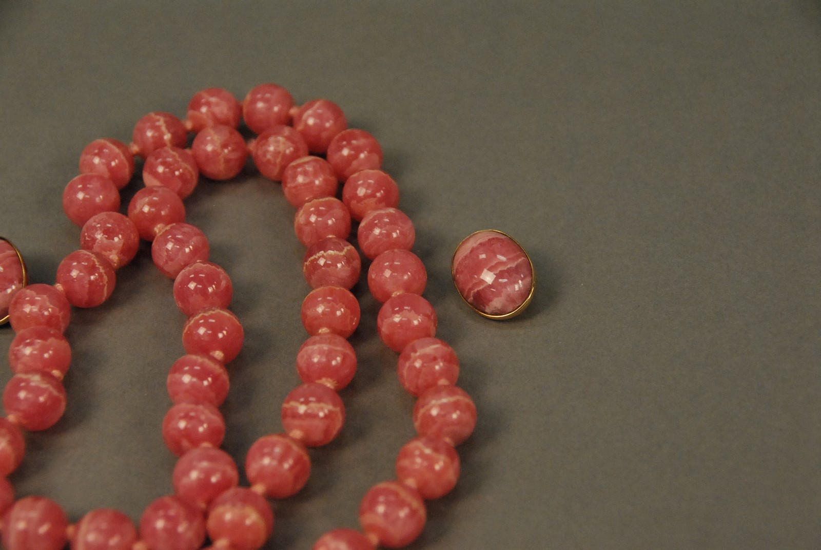 Two piece lot including pink stone bead necklace and matching earrings mounted in 14K gold. lg. 24 in. Provenance: Property from a Private Collection Sold for the Benefit of the Virginia Historical Society.