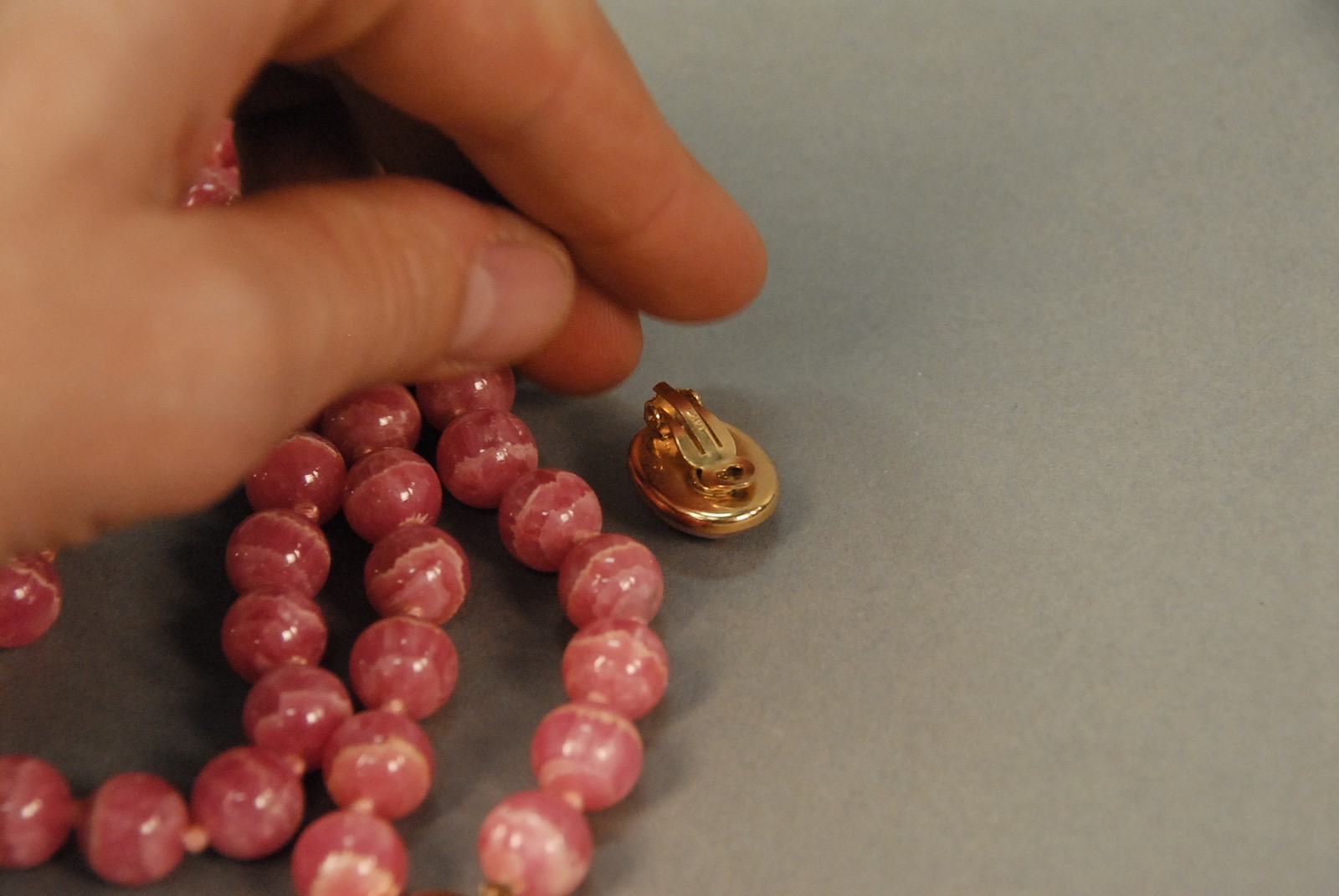 Lot 31: Two piece lot including pink stone bead necklace and matching earrings mounted in 14K gold. lg. 24 in. Provenance: Property from a Private Collection Sold for the Benefit of the Virginia Historical Society.