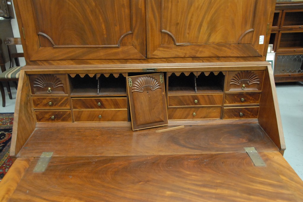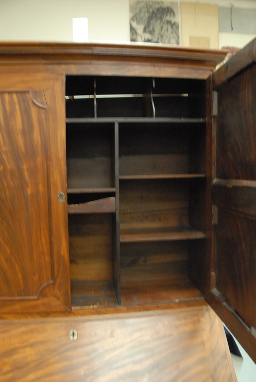 Chippendale mahogany secretary desk in two parts, upper section with bookcase top and two blind doors over lower section with slant lid over four drawers, interior with block and shell carving, the whole of figured mahogany, original brasses, 18th century probably Norwich, Connecticut no feet. ht. 84in. wd. 46in. dp. 22in. Provenance: originally in C.P. Hamlen’s office in Allis Howe Building of Norwich Free Academy.