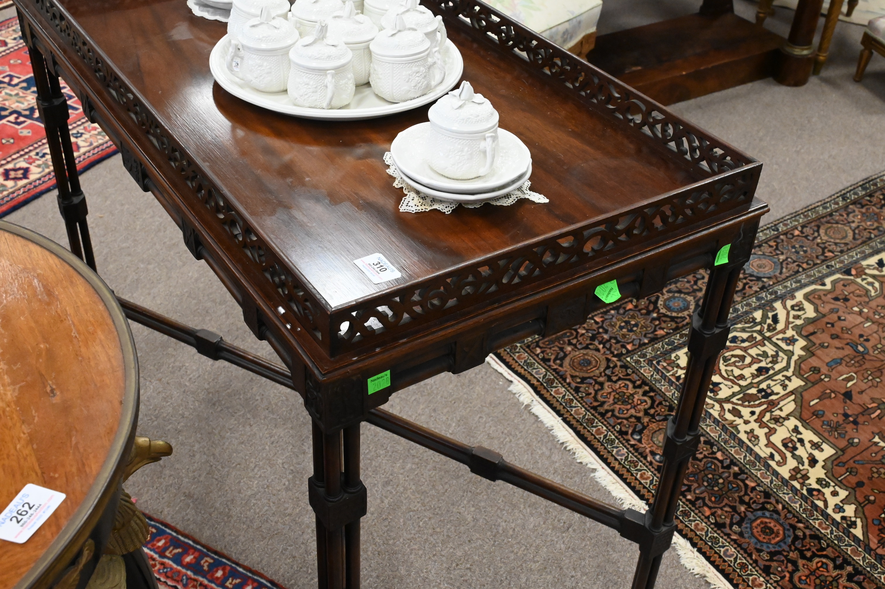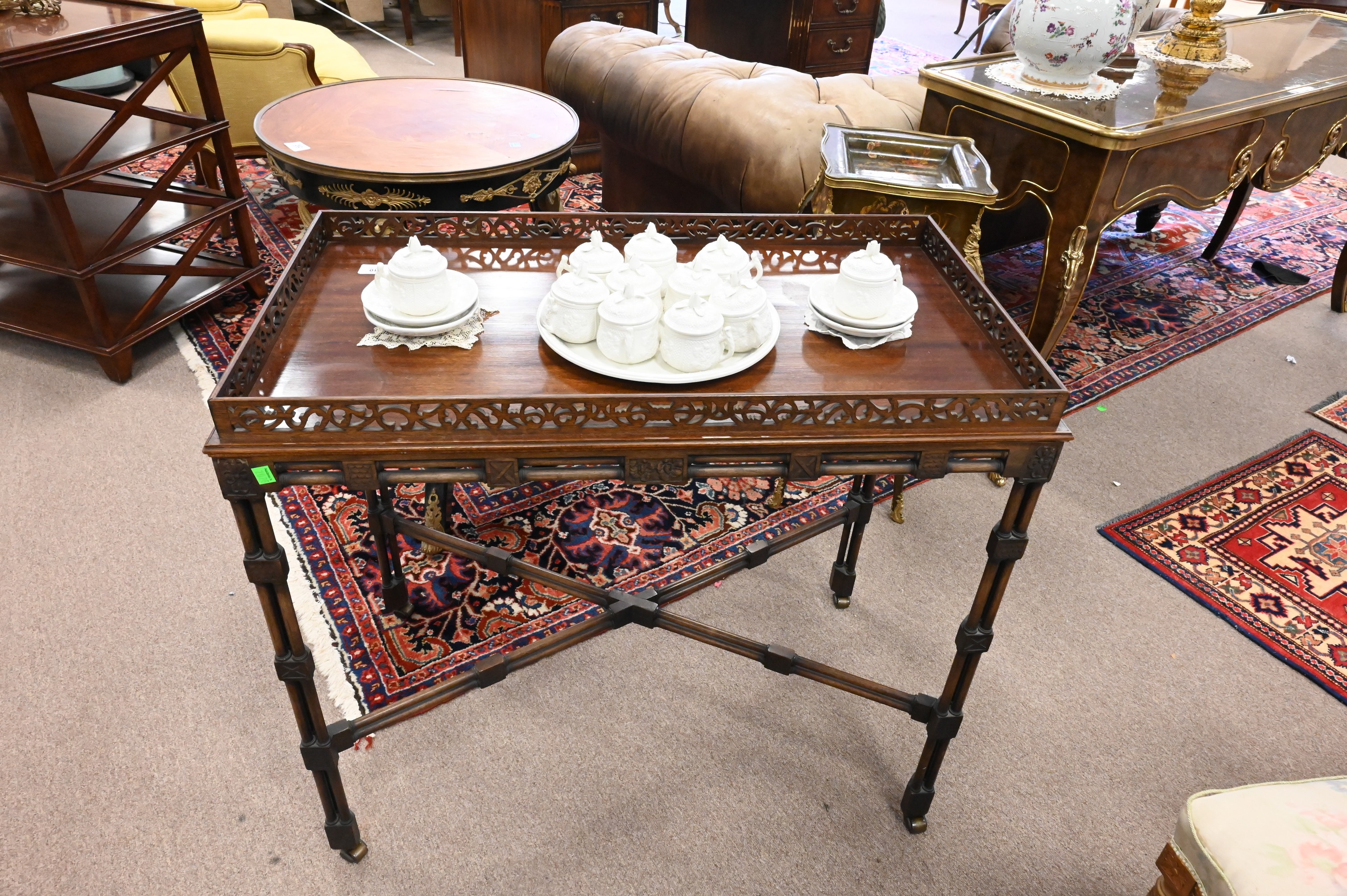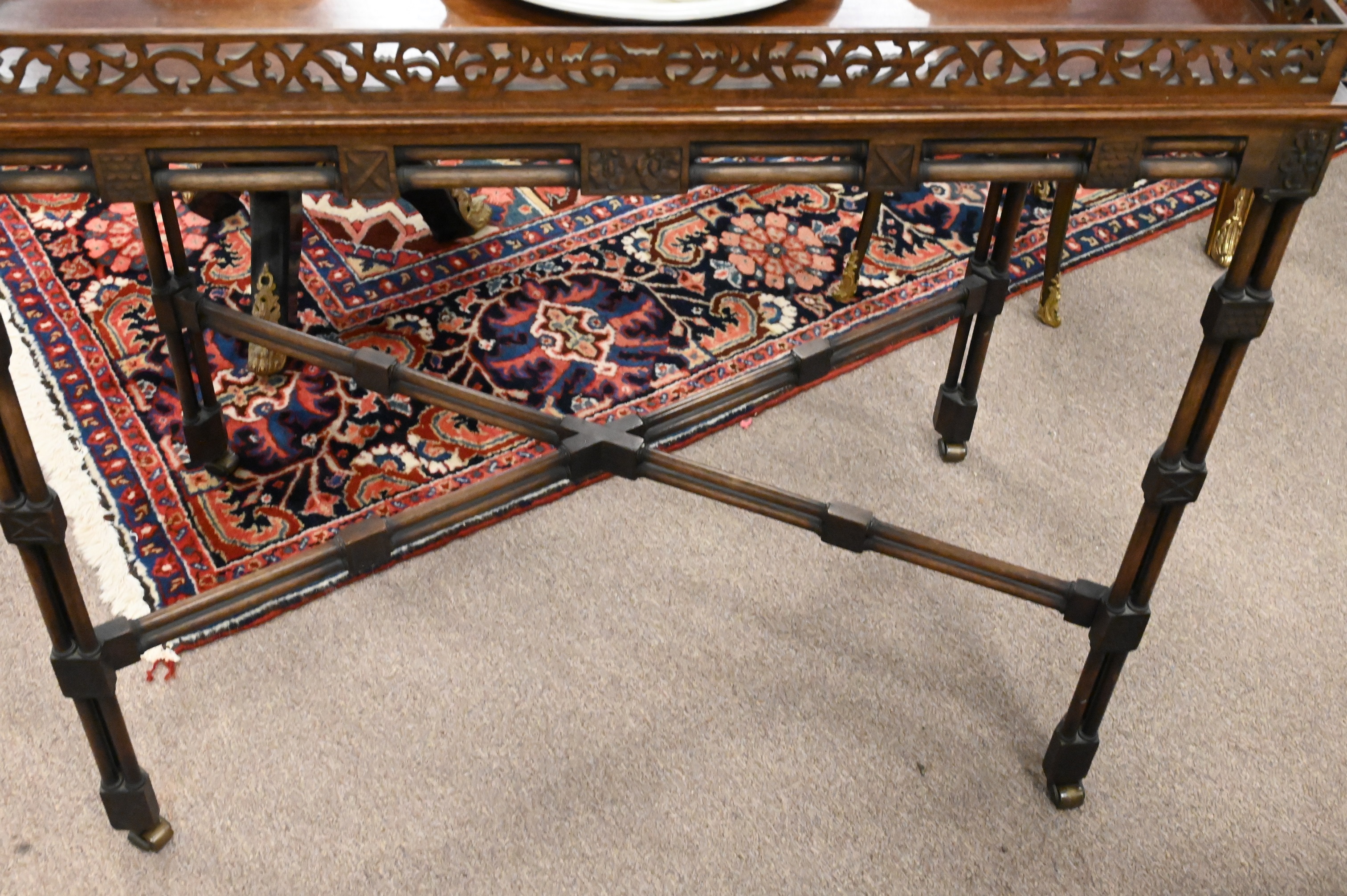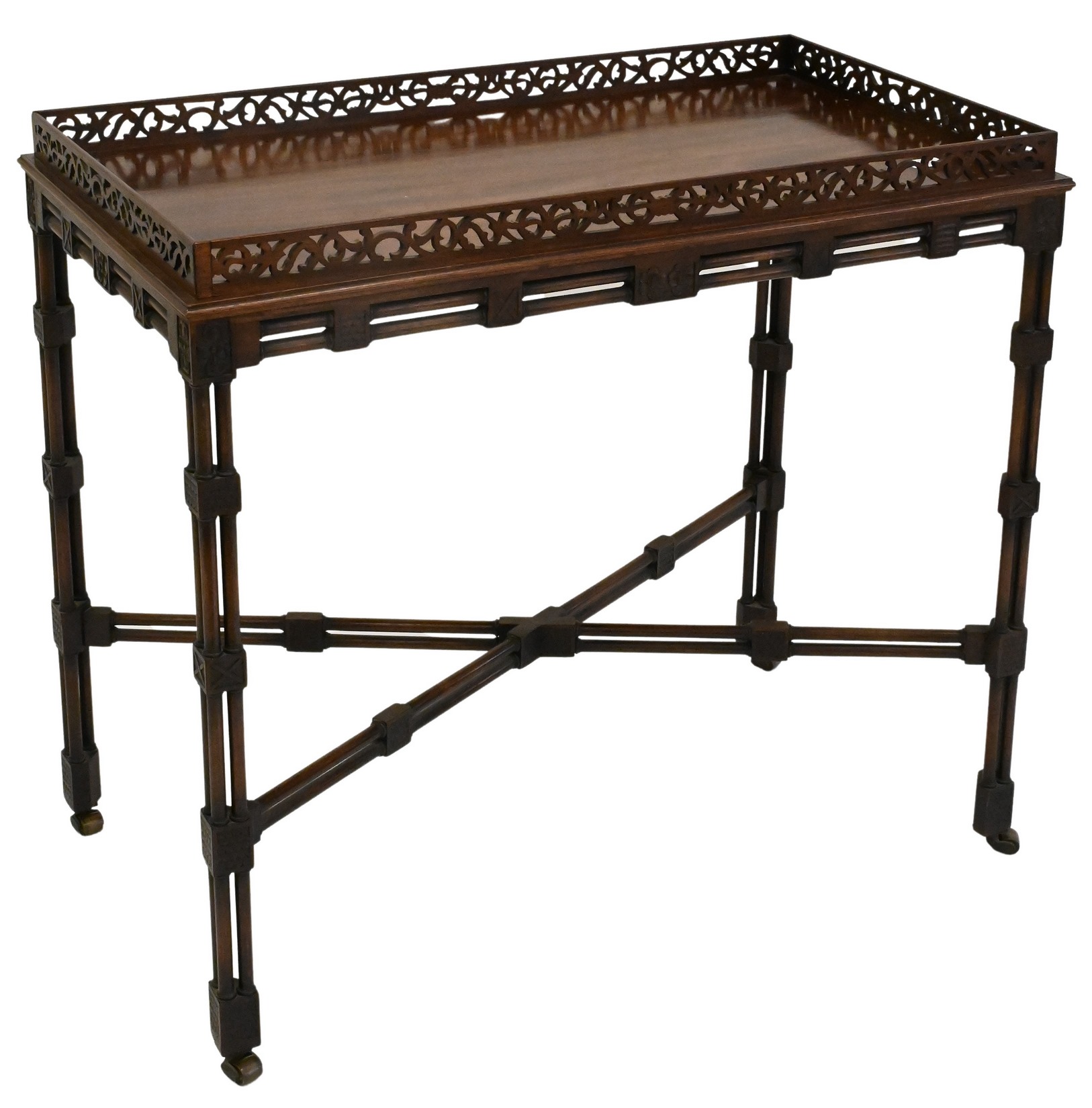 Chippendale Style Mahogany Table, with pierced gallery, height 30 1/2 inches, top 19″ x 34″, Provenance: Julius H Jacobson II a Fifth Avenue Estate.