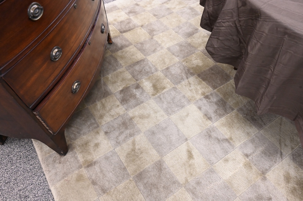 Contemporary Room Size Rug, two tone tan squares, 9′ 10″ x 14′.
