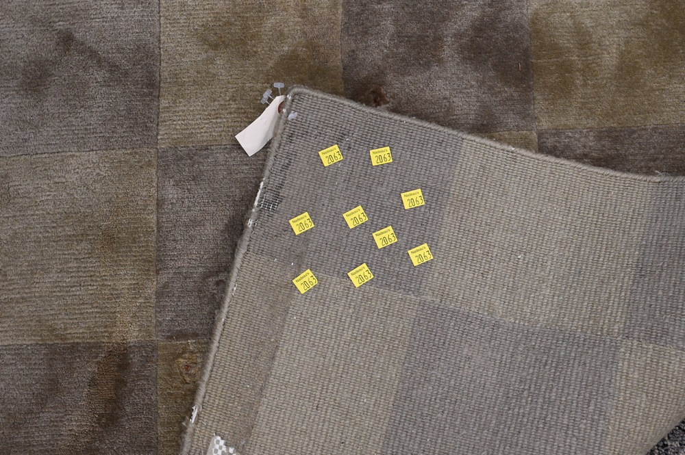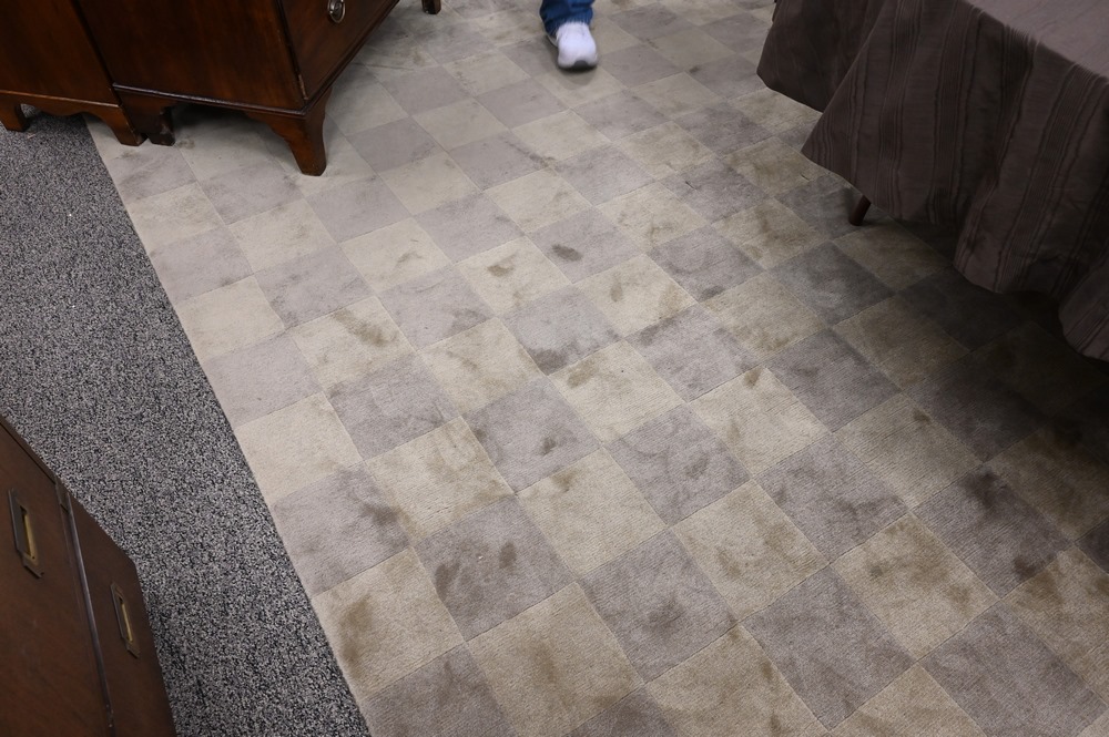 Lot 310: Contemporary Room Size Rug, two tone tan squares, 9′ 10″ x 14′.