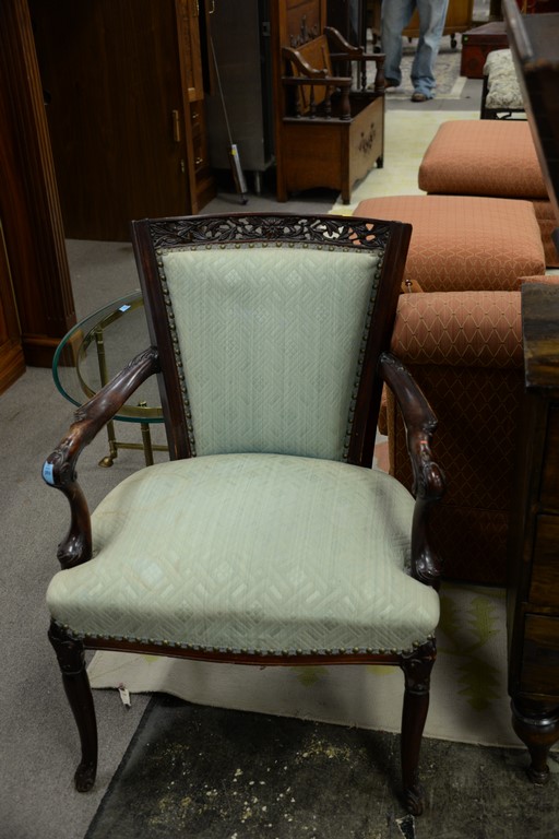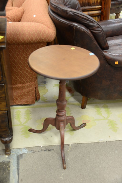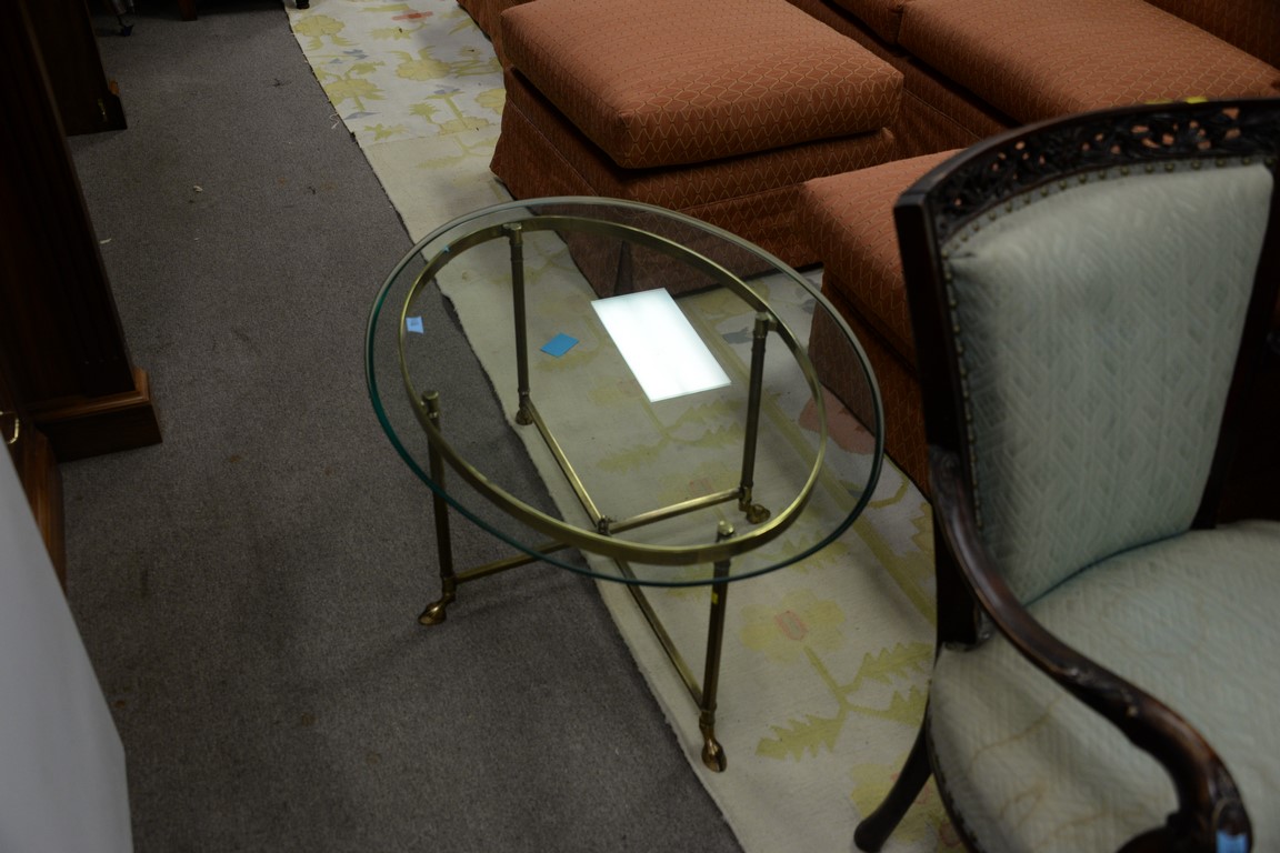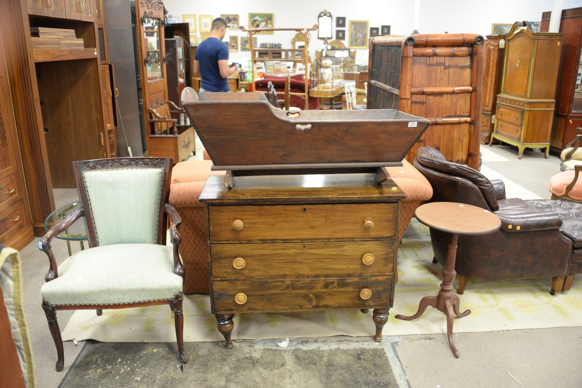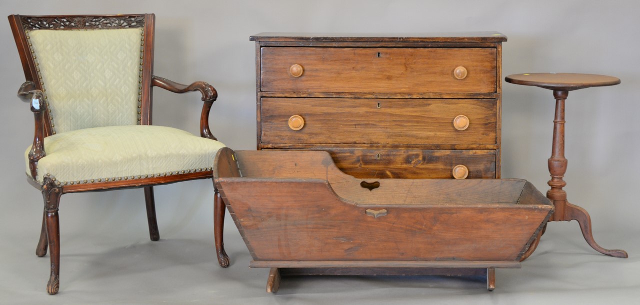 Five piece lot including brass and glass coffee table, armchair, cradle, three drawer chest, and Federal candle stand. chest: ht. 32in., wd. 36in.