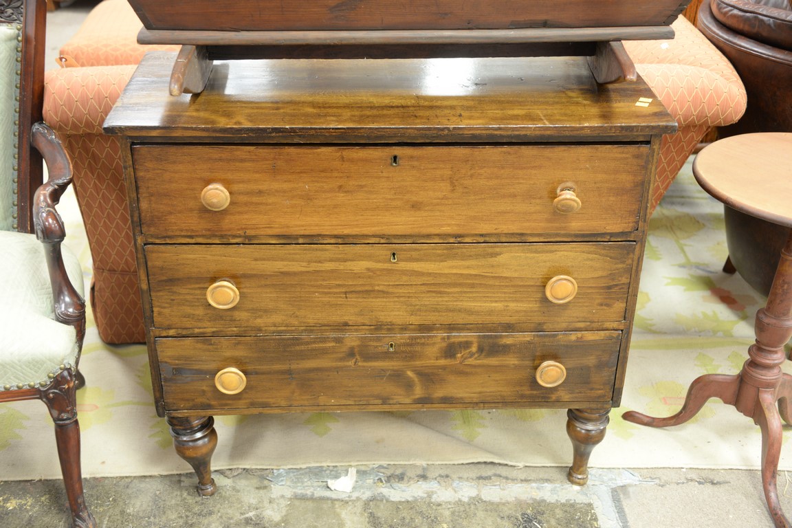 Lot 310: Five piece lot including brass and glass coffee table, armchair, cradle, three drawer chest, and Federal candle stand. chest: ht. 32…