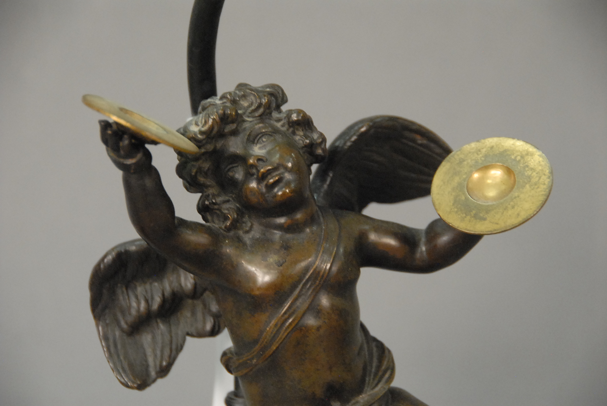 Lot 310: French gilt and patinated, alabaster and bronze figural table lamp depicting a putti with cymbals on square white alabaster base with gilt metal toupie feet, electrified. overall ht. 18 1/2in.