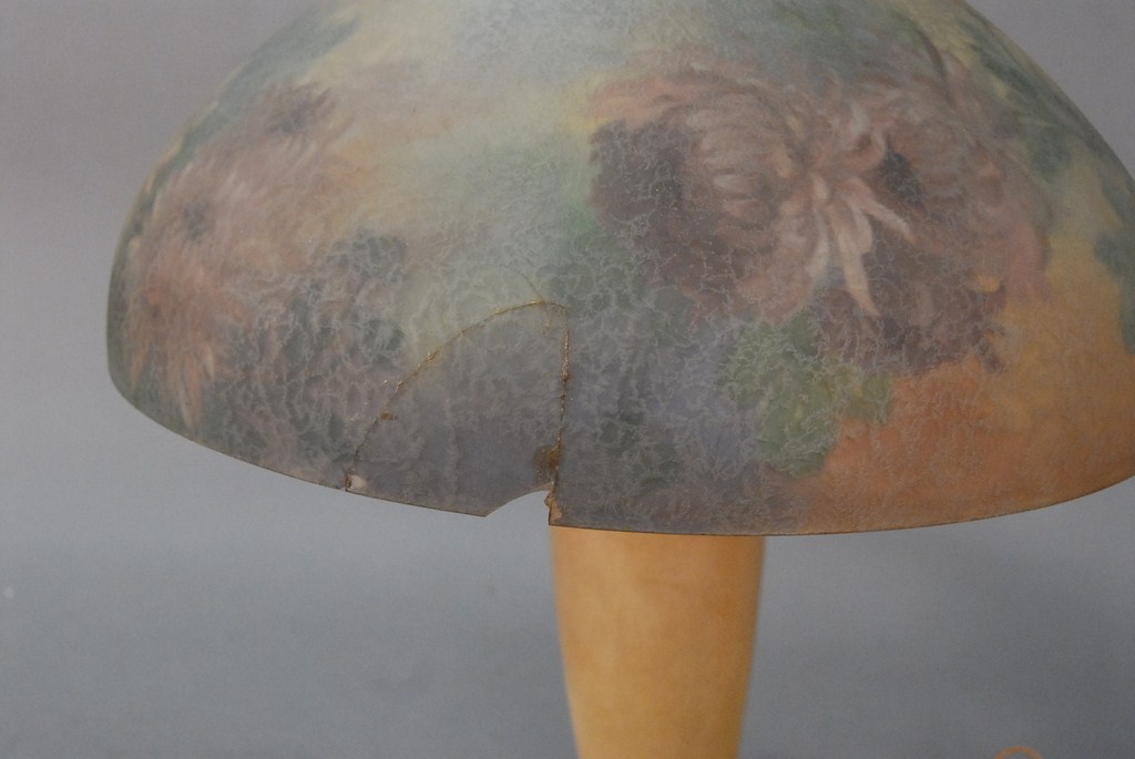 Lot 310: Handel table lamp with reverse painted shade signed Runge, top ring signed Handel shade with repair and small chip missing. ht. 23…