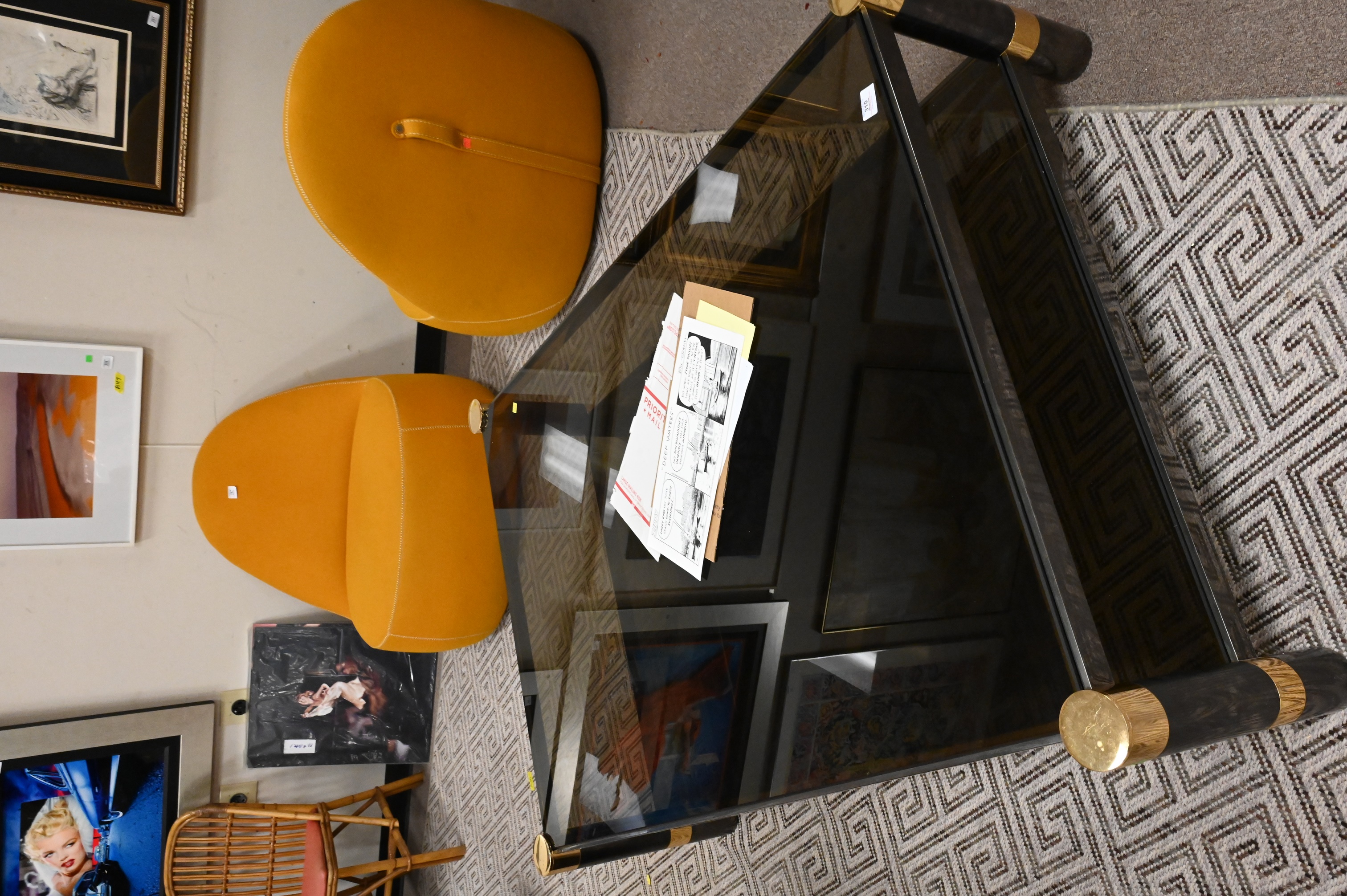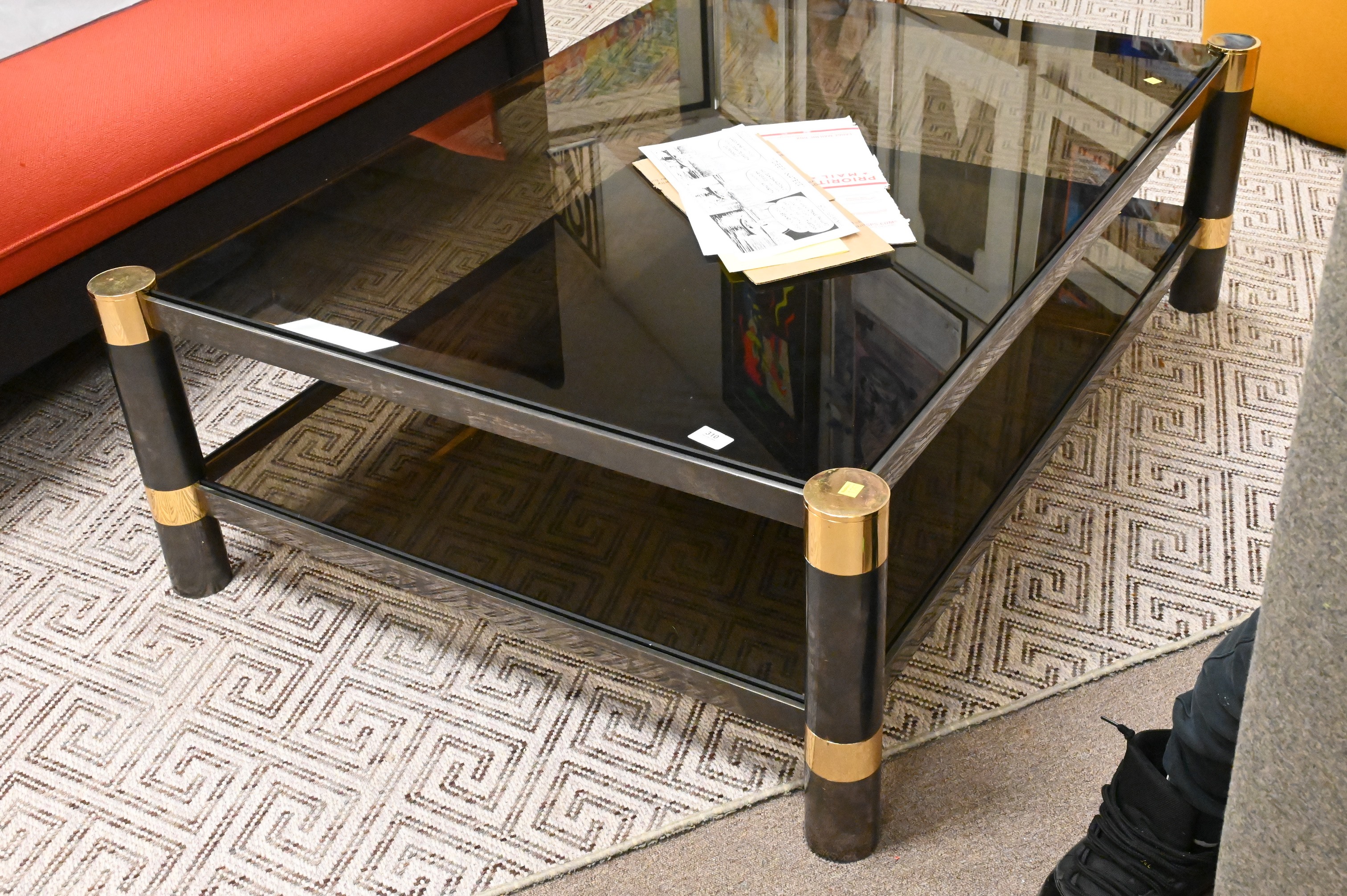 having two tiers of smoked glass set on brass and gunmetal frame, signed