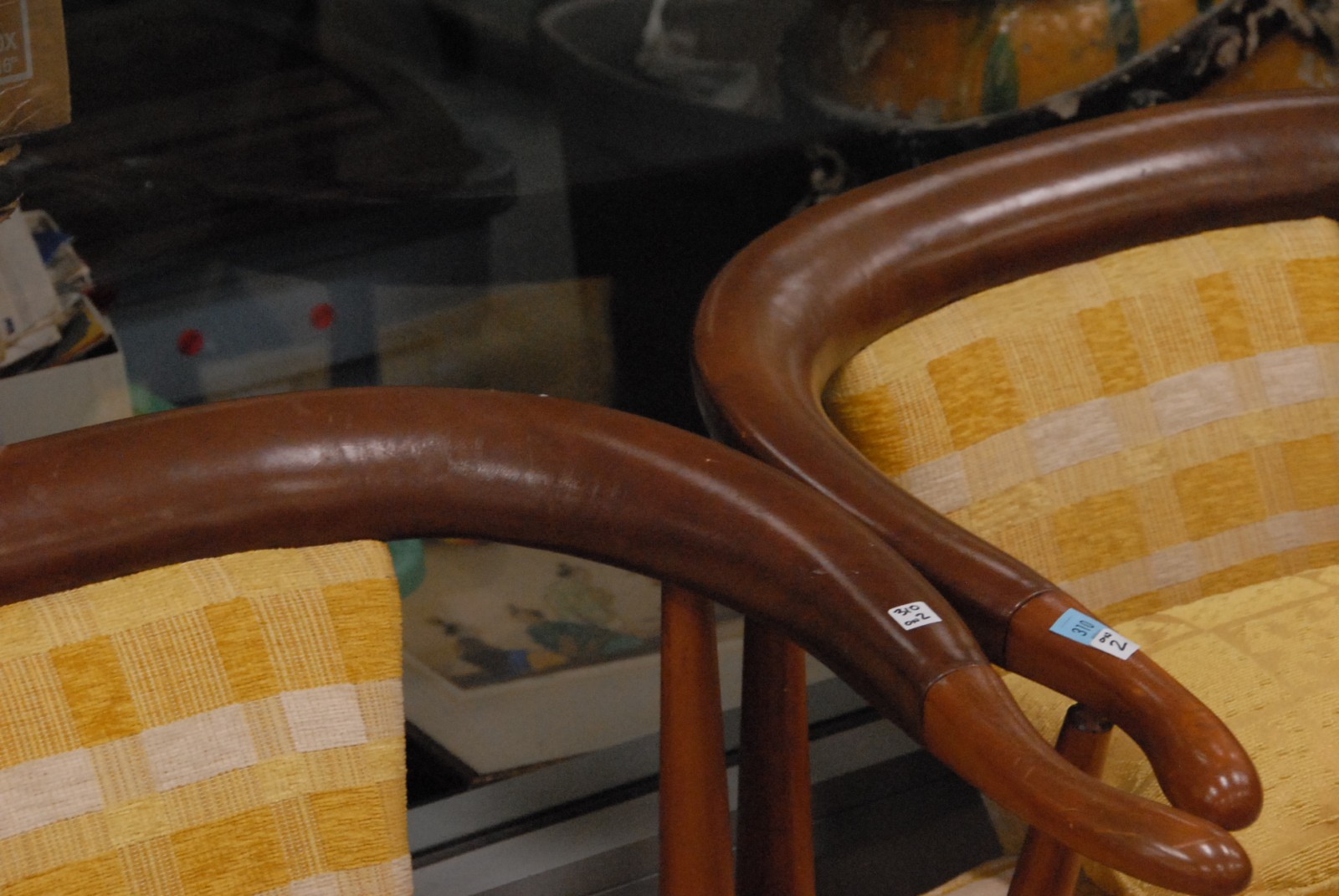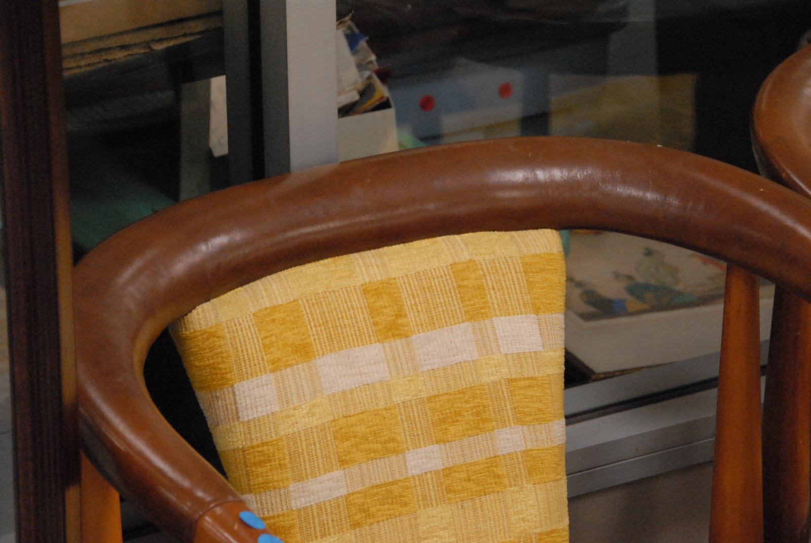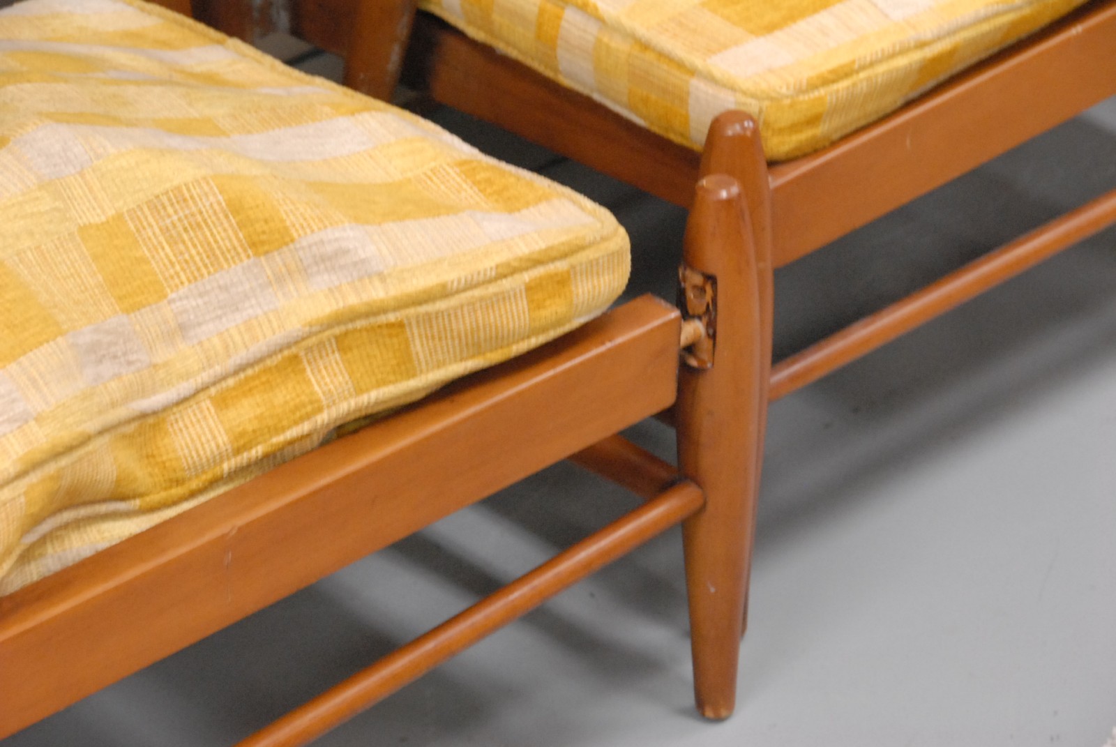 Pair of Danish modern yolk back chairs with original brown leather upholstery on the yolk, one spindle missing