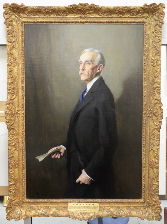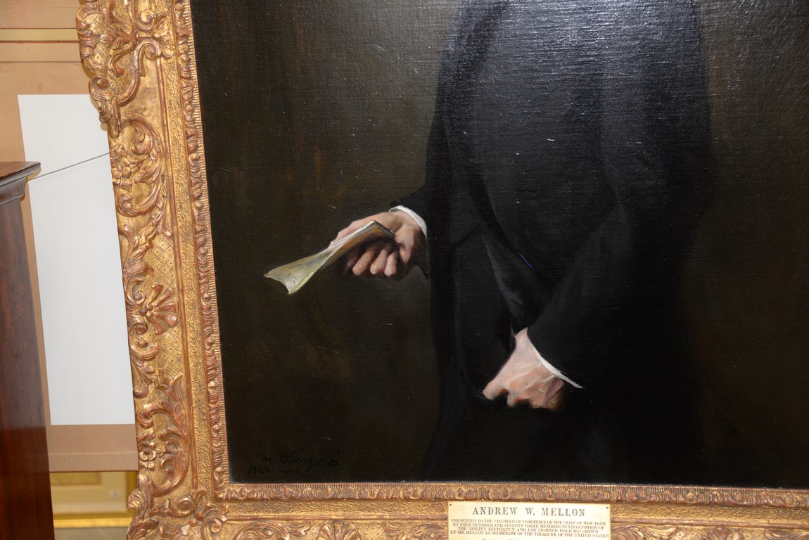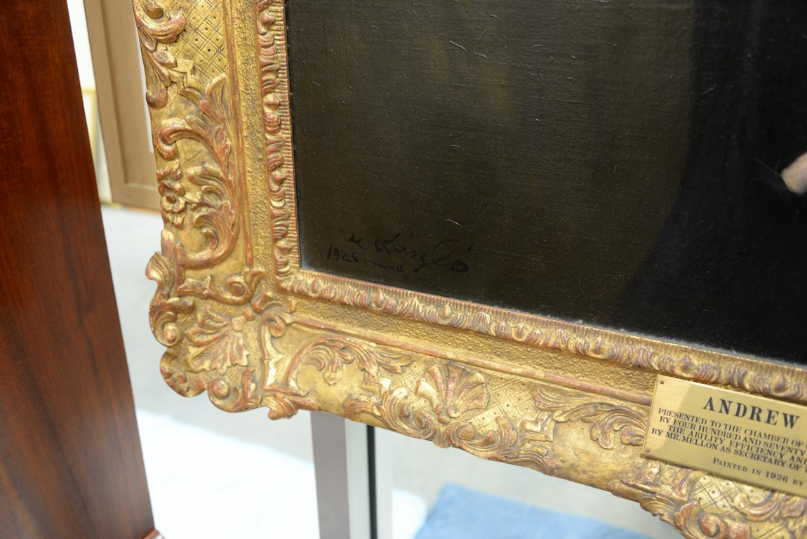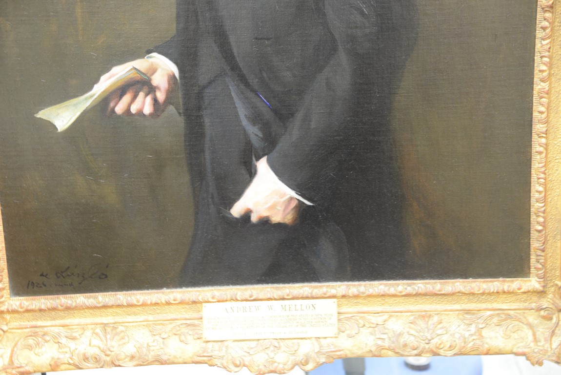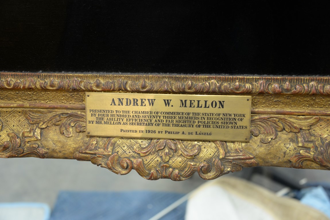 Philip A. deLaszlo 1869-1937 3/4 length portrait of Andrew William Mellon 1855-1937 oil on canvas, painted from life in 1926 signed and dated lower left: deLaszlo 1926 March plaque: Andrew W. Mellon, Presented to the Chamber of Commerce of the State of New York by four hundred and seventy three members in recognition of the ability, efficiency and far sighted policies shown by Mr. Mellon as Secretary of the Treasury of the United States, Painted in 1926 by Philip A. De Laszlo 52 x 36 Mellon was the United States Secretary of the Treasury 1921-1932 resigned, the Ambassador to the Court of St. James, and the Director of the Pittsburgh National Bank of Commerce. Provenance: Property from Credit Suisse’s Americana Collection