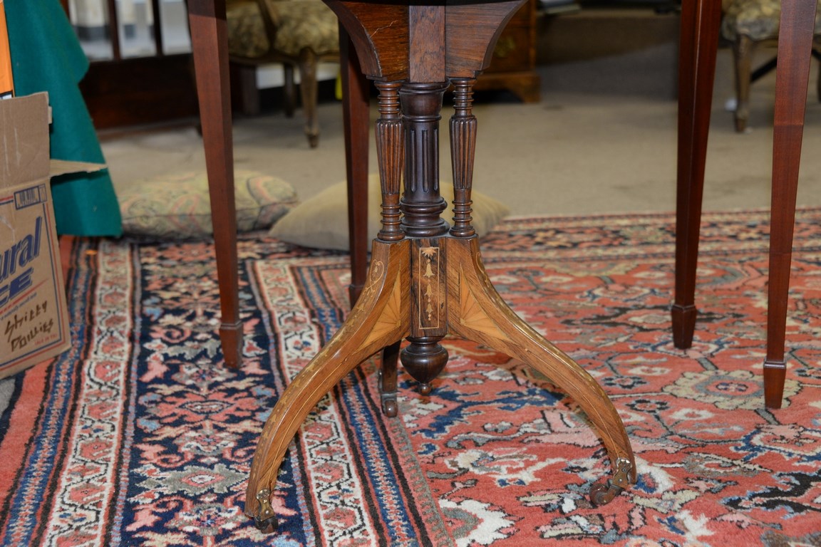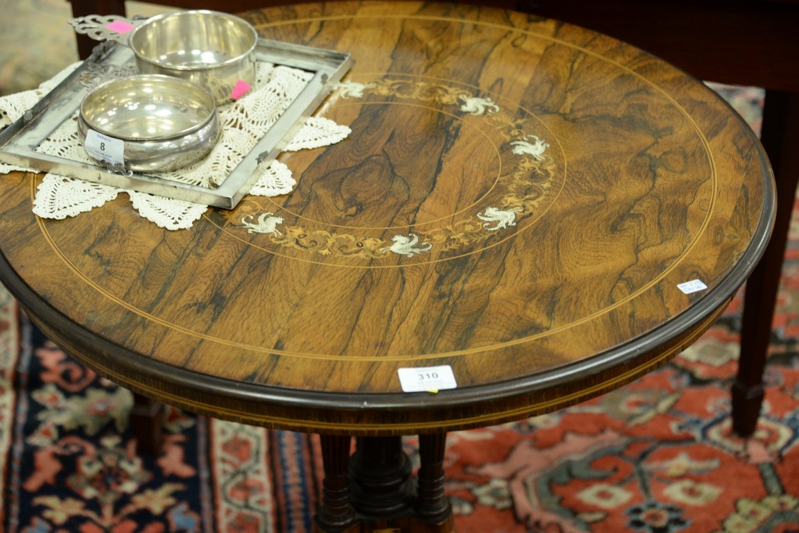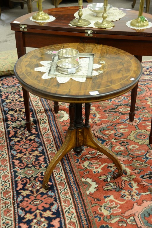 Rosewood inlaid round table, ht. 27 1/2 in. dia. 26 in.