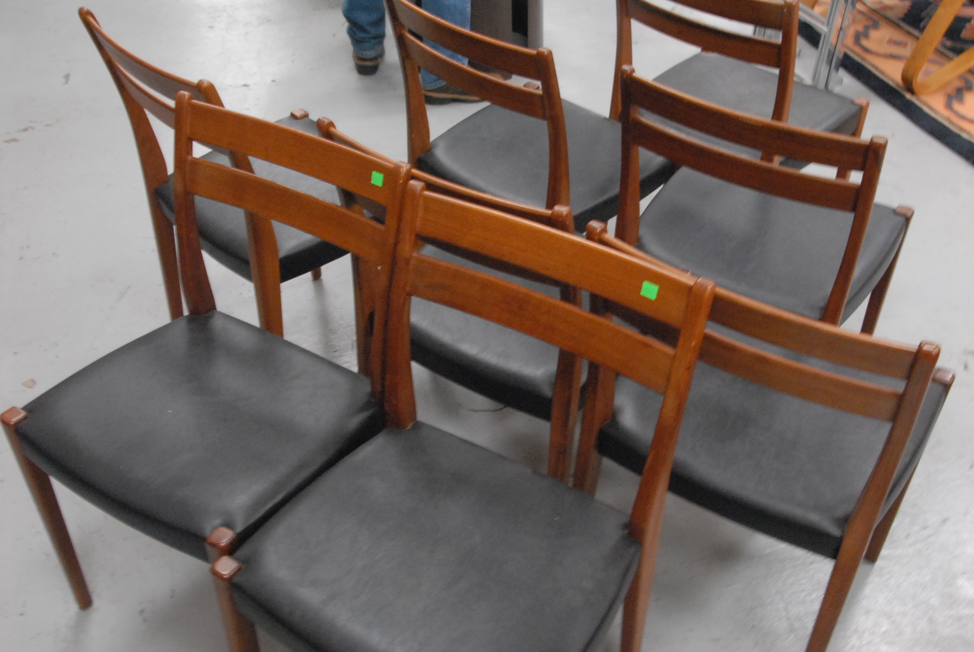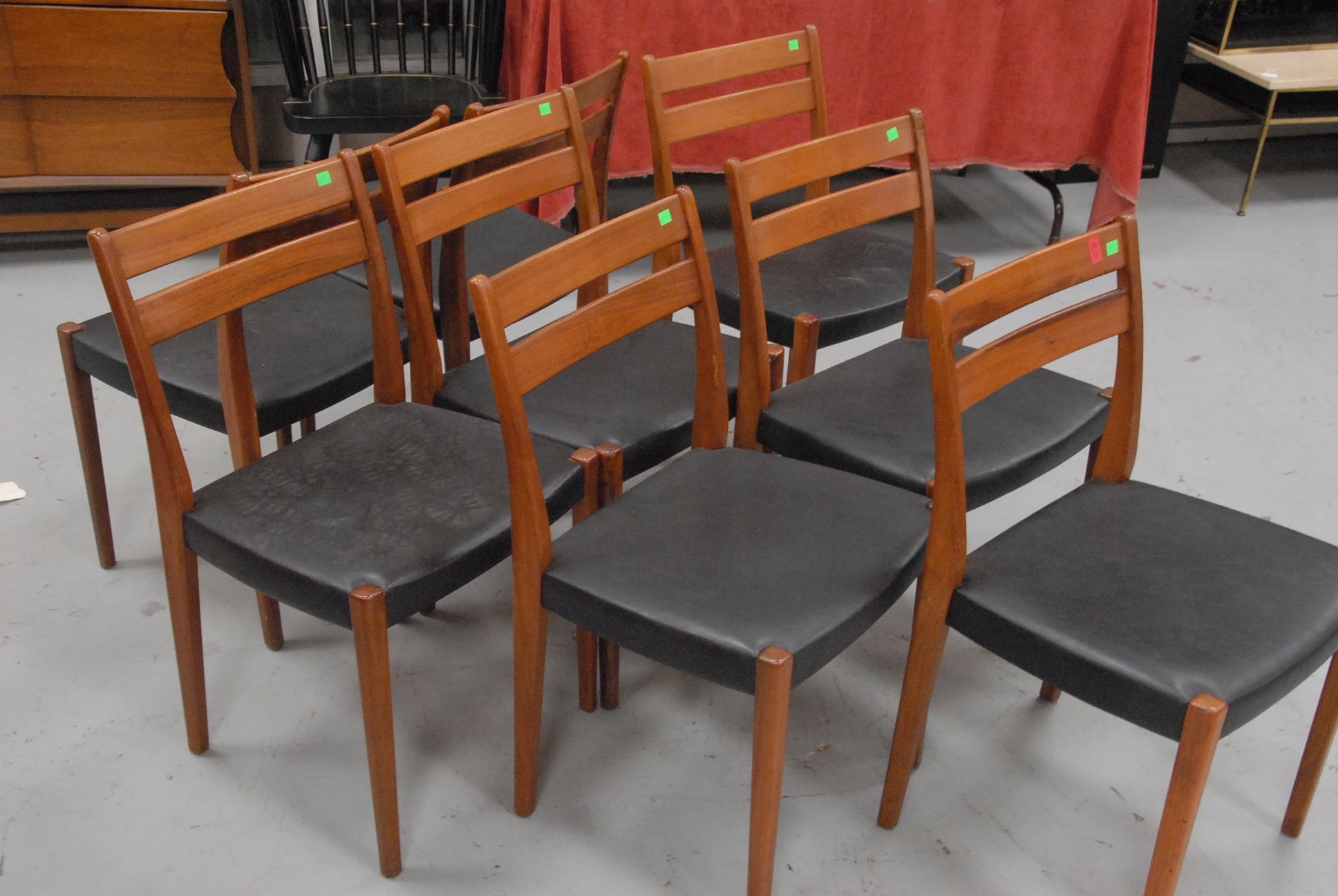 Set of eight Danish Modern dining chairs with black seats.