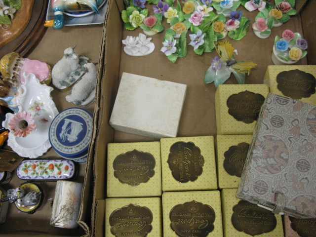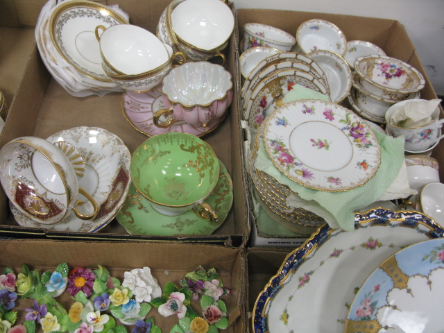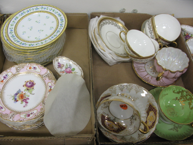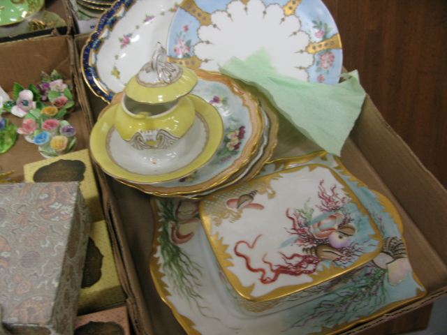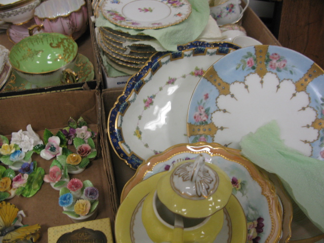 Seven box lots to include small porcelain plates, ramekins and under plates, some are Dresden, some are Limoges, hand painted sardine dish, hand painted plates, china, place card holders, cups and saucers, small porcelain lift top boxes.