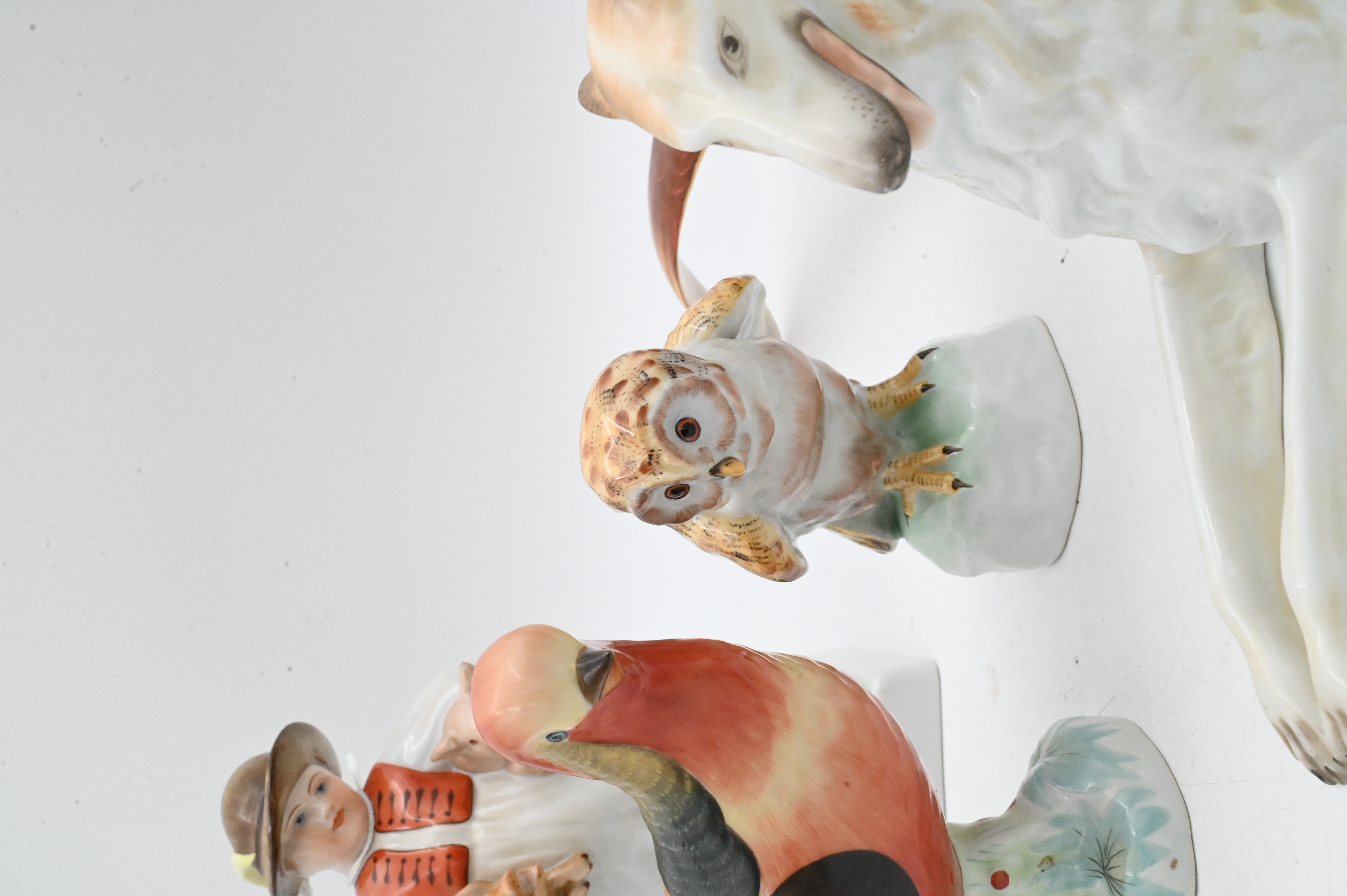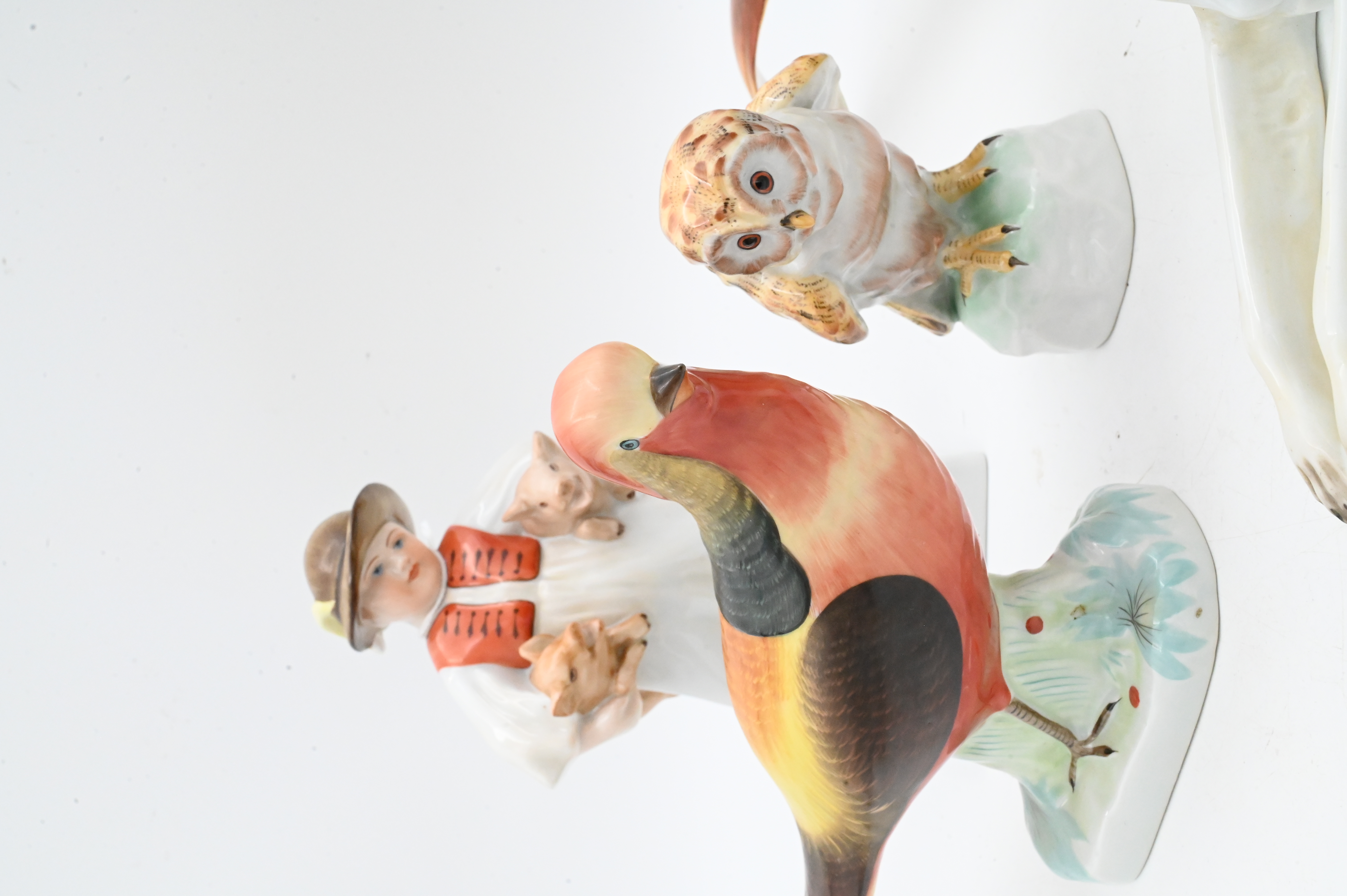 to include reclining borzoi or greyhound dog, owl perched on branch no.5106, pair of golden pheasants, no.5080, Boy with Pigs Signed Vastagh Gyérgyné , along with The Cobbler Boy Red Boots Figurine 5493
