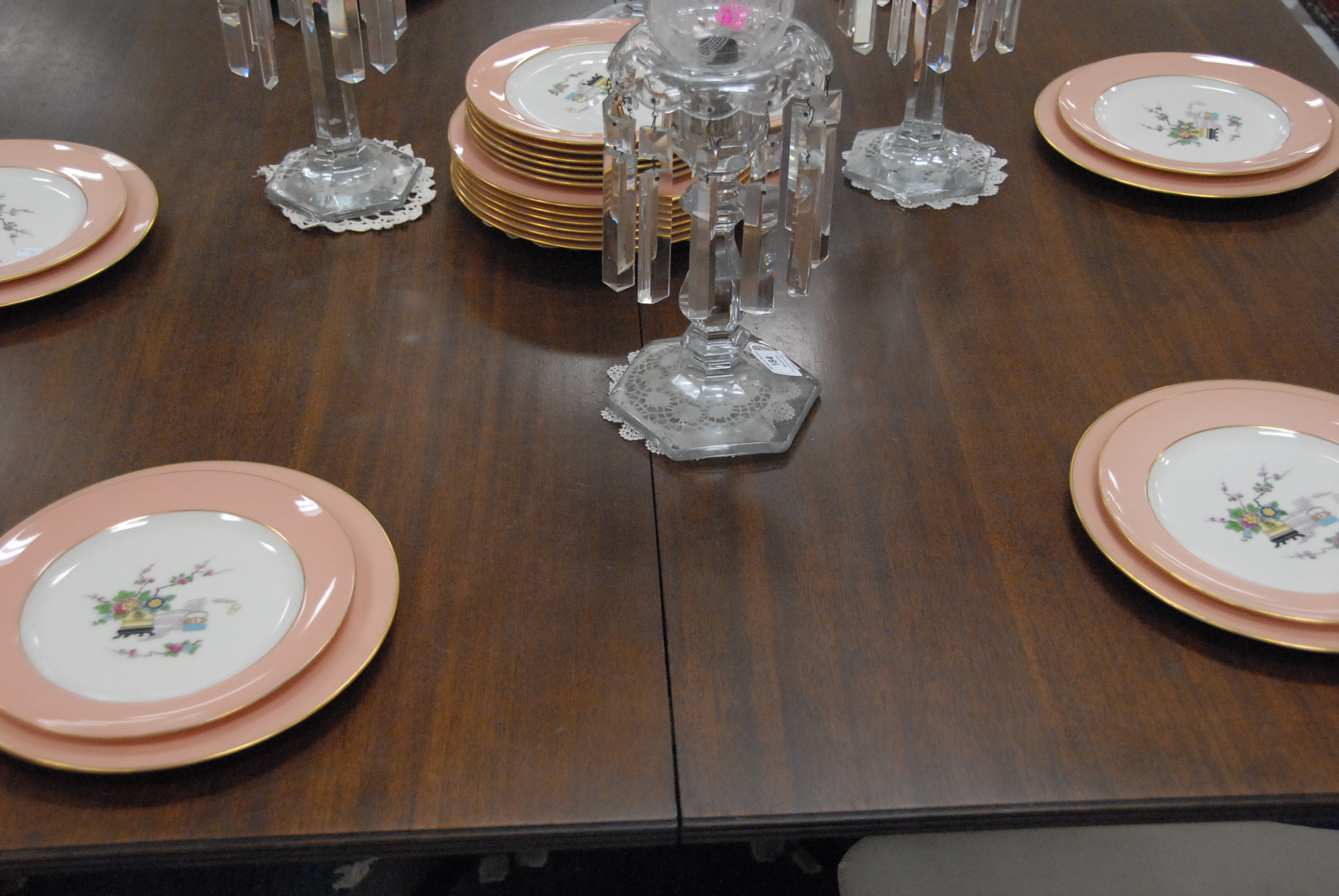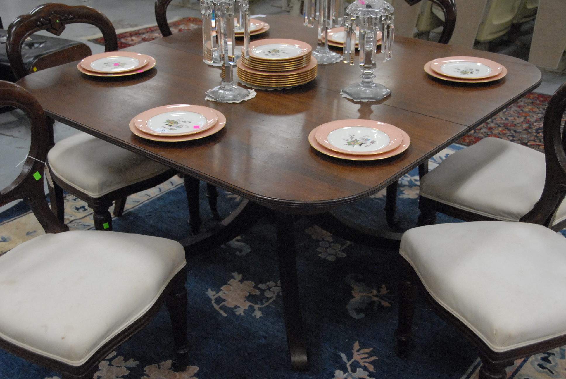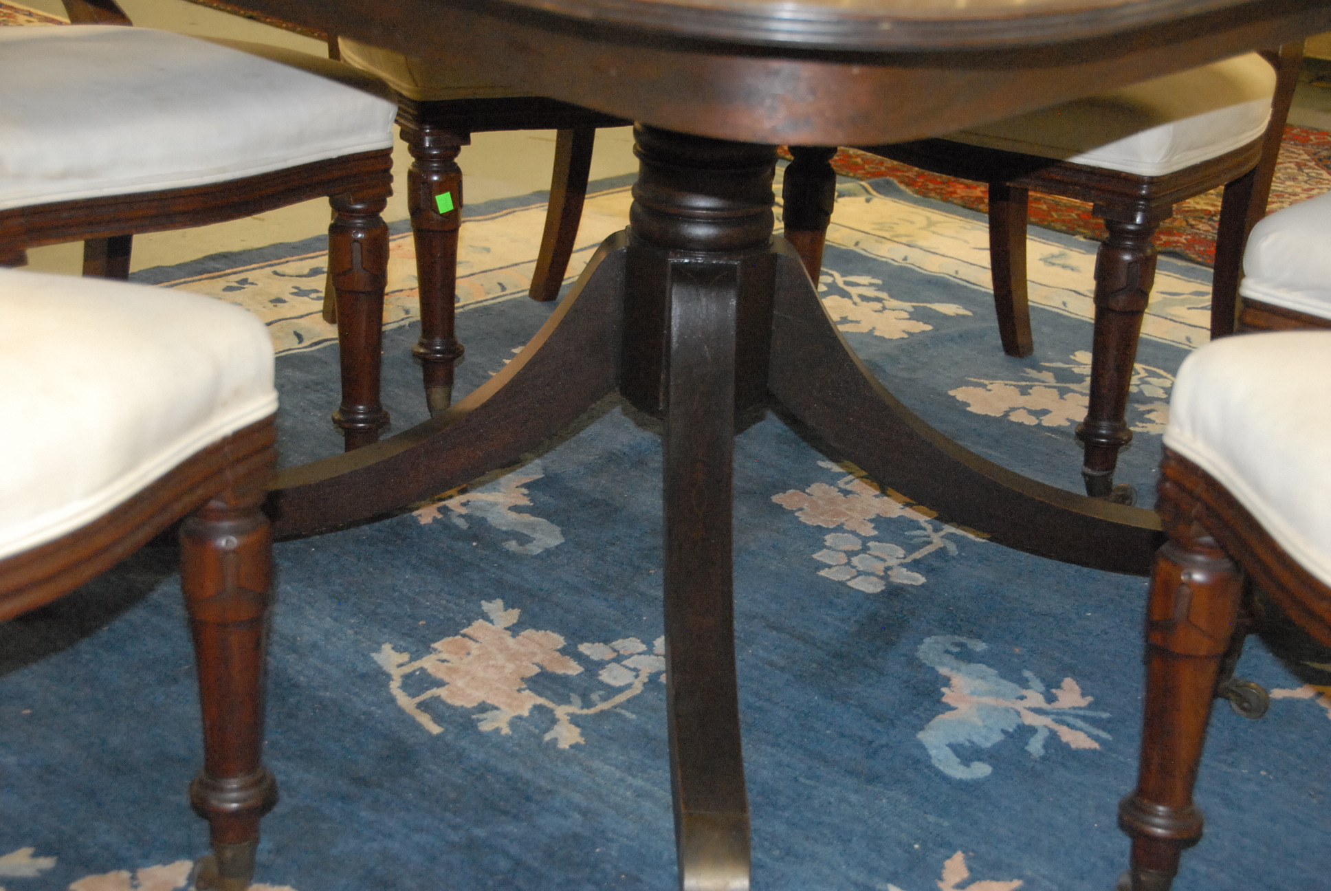 Lot 310: Square mahogany pedestal dining table having line inlaid pedestal and three 13inch leaves. top: 54 x 54 open: 54 x 93.
