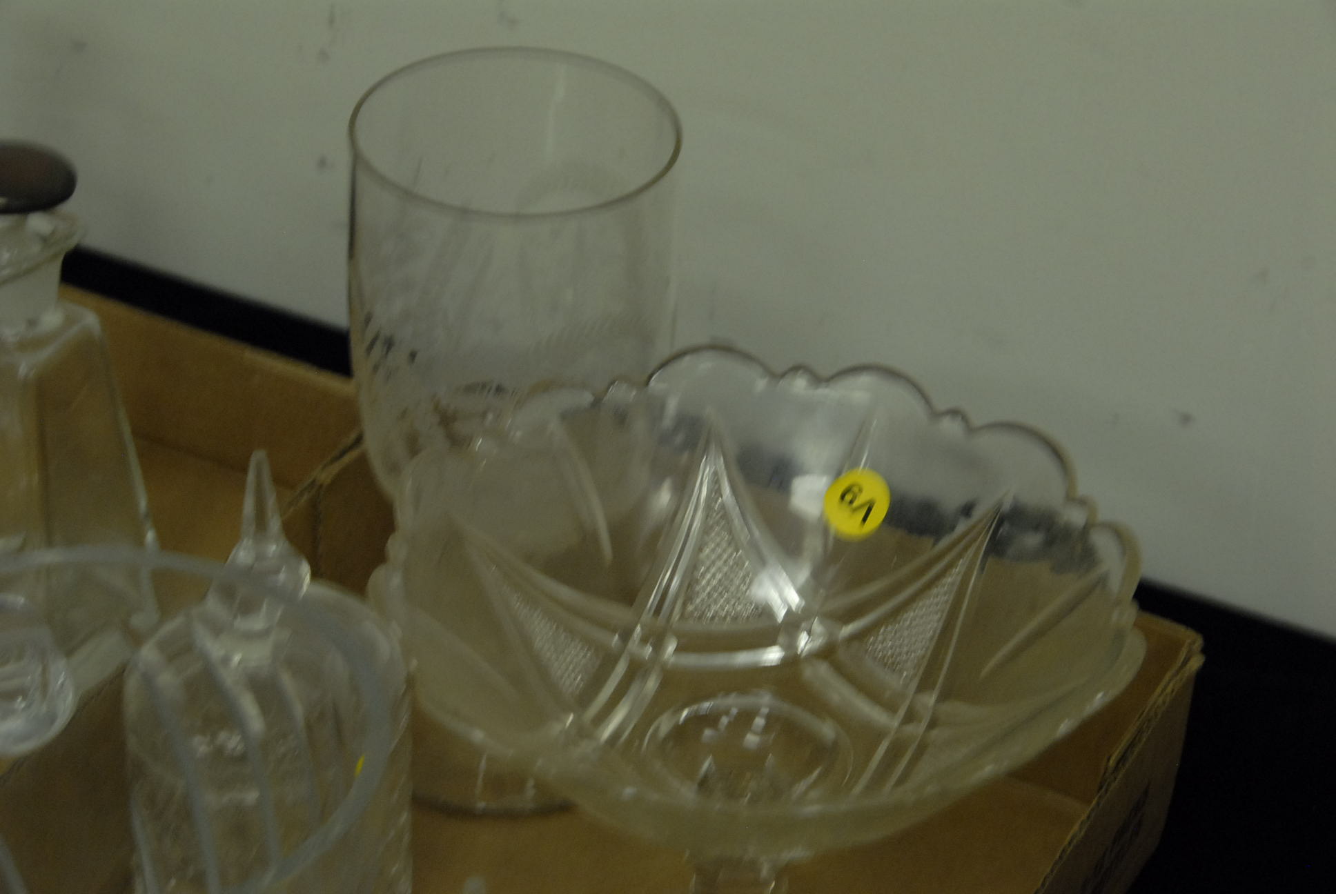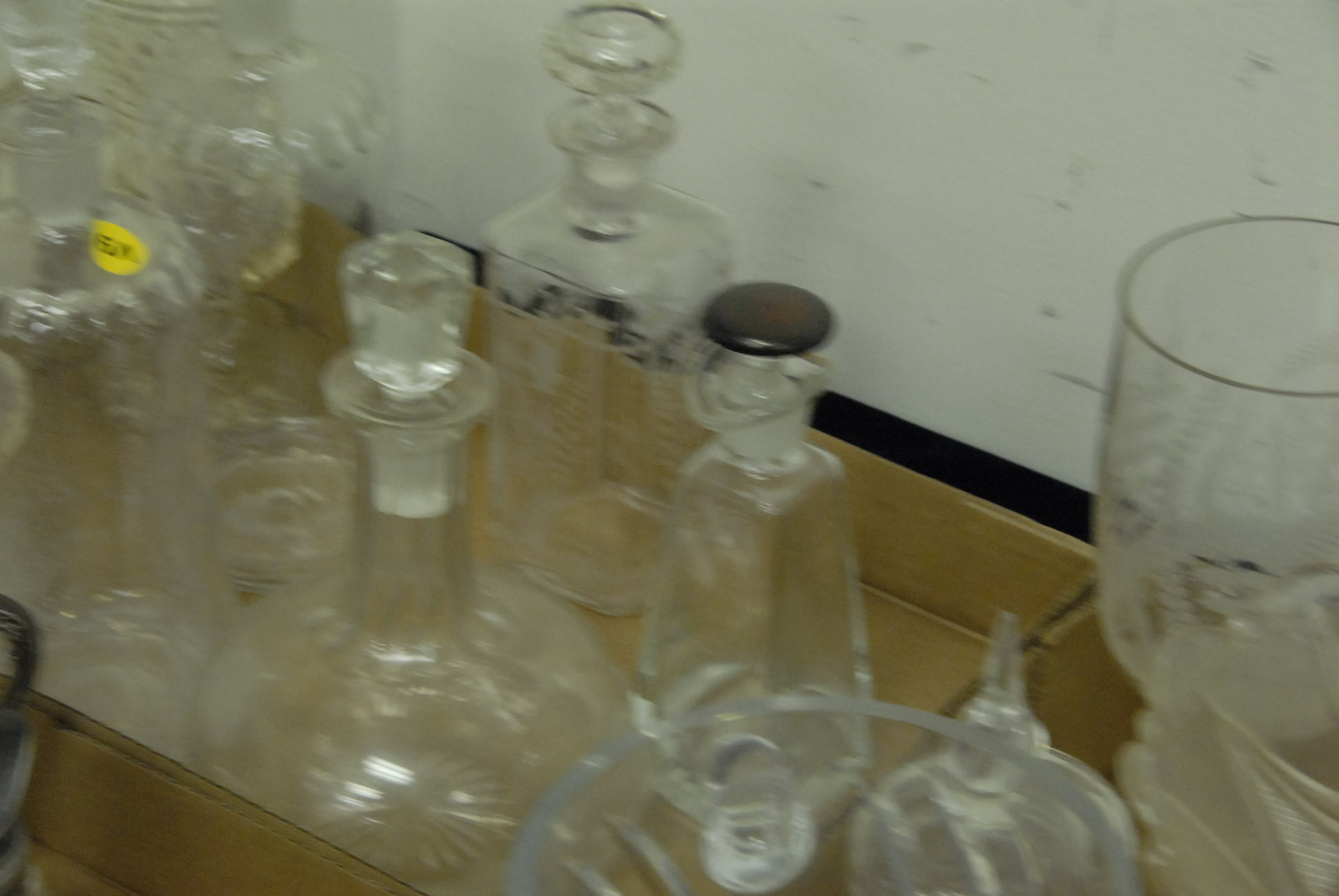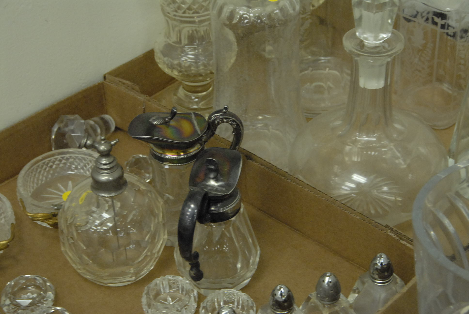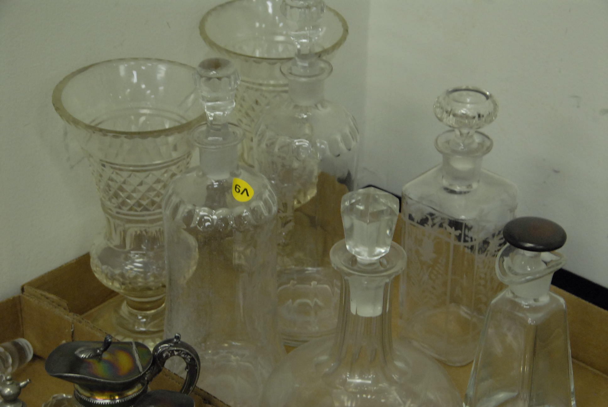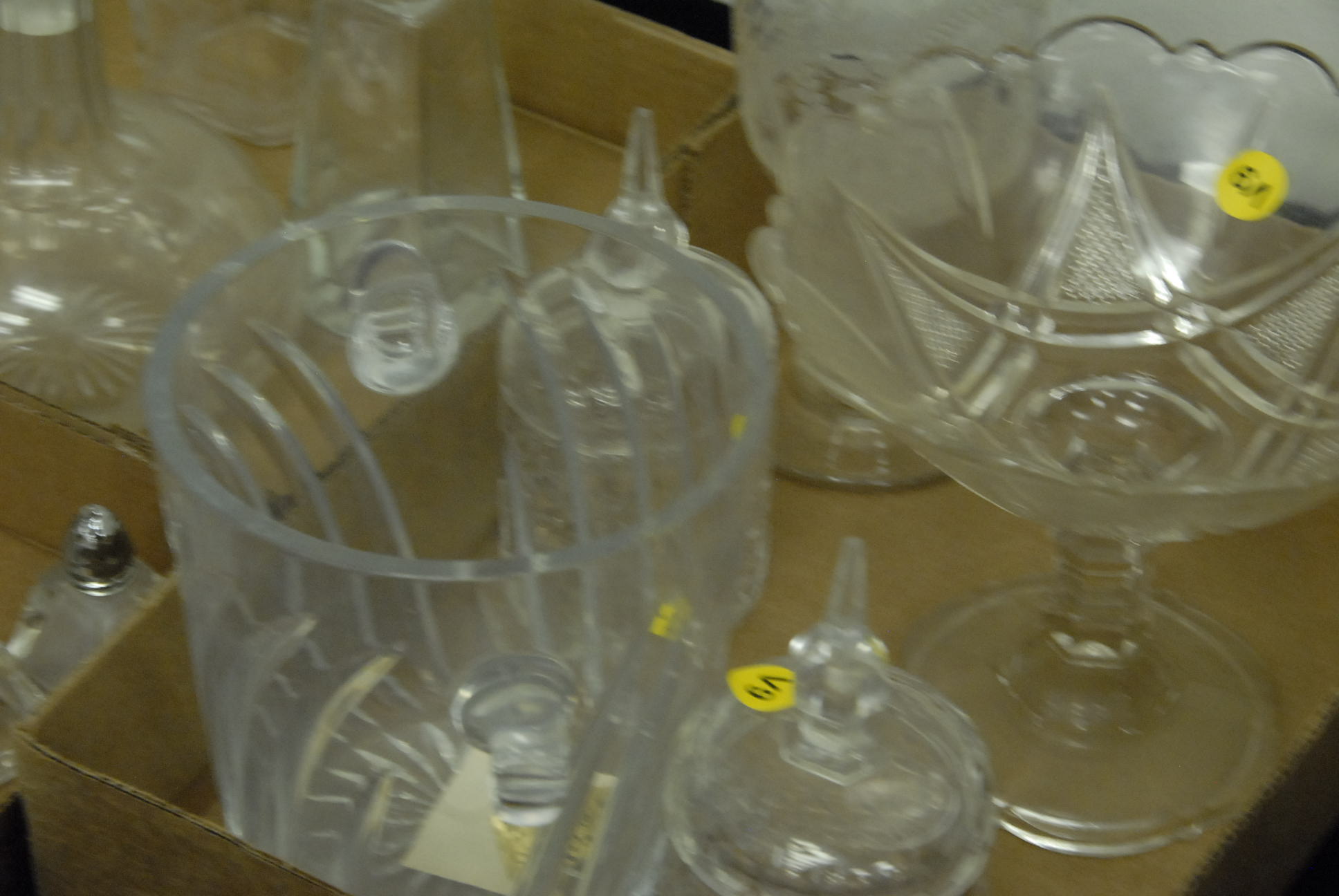 Three box lots to include five decanters, a crystal vase, pressed glass compote, stem, a pair of crystal vases, syrup pourers, open salts, pepper shakers, etc