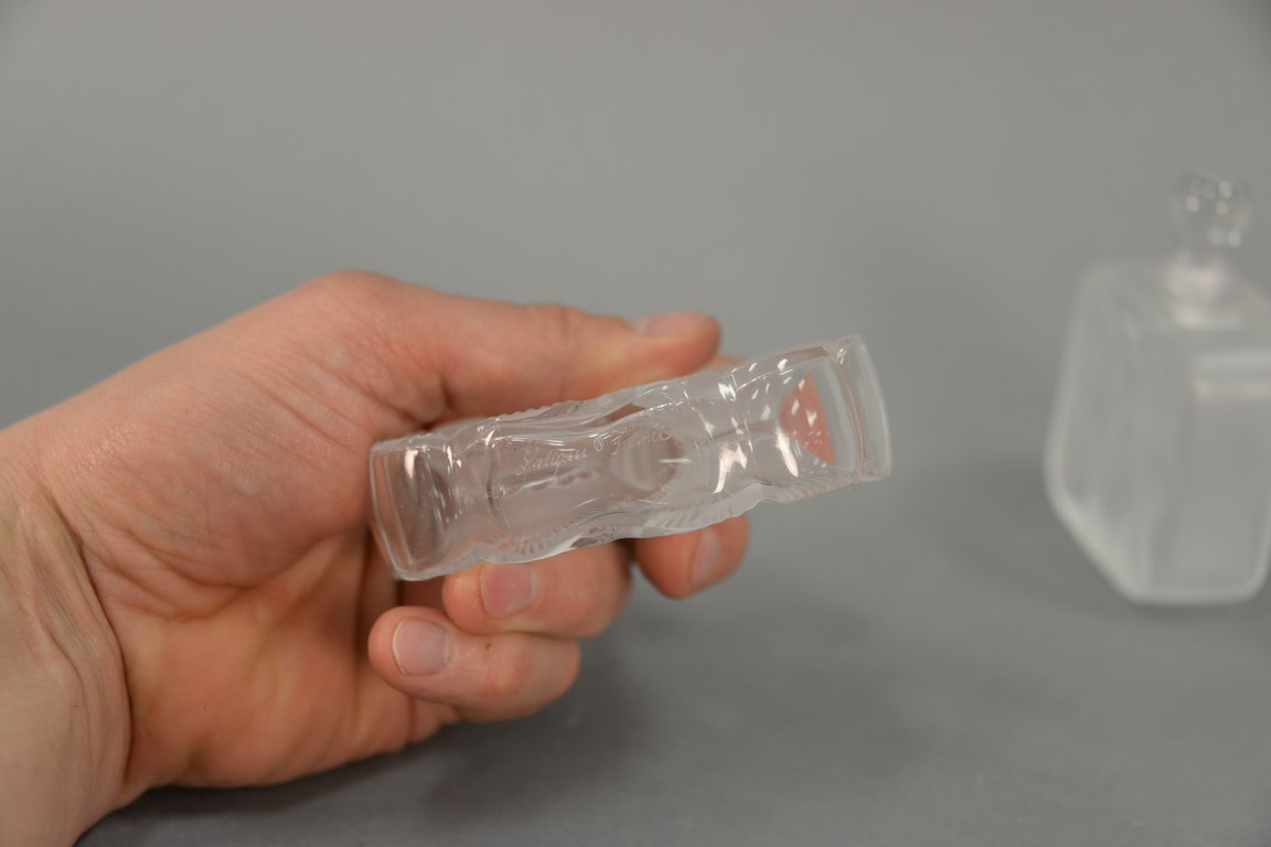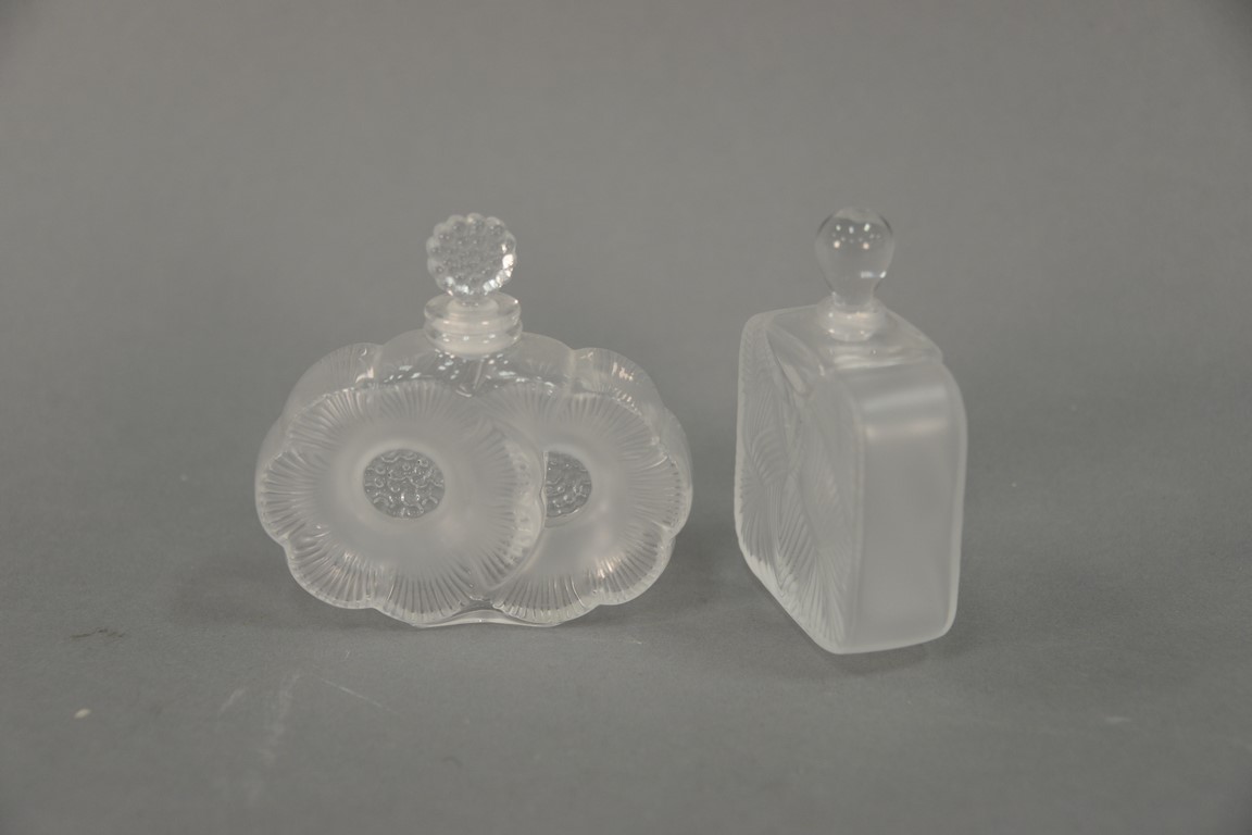 Lot 310: Two Lalique frosted crystal perfume bottles Deux Fleurs and small square bottle, ht. 3 3/4in.