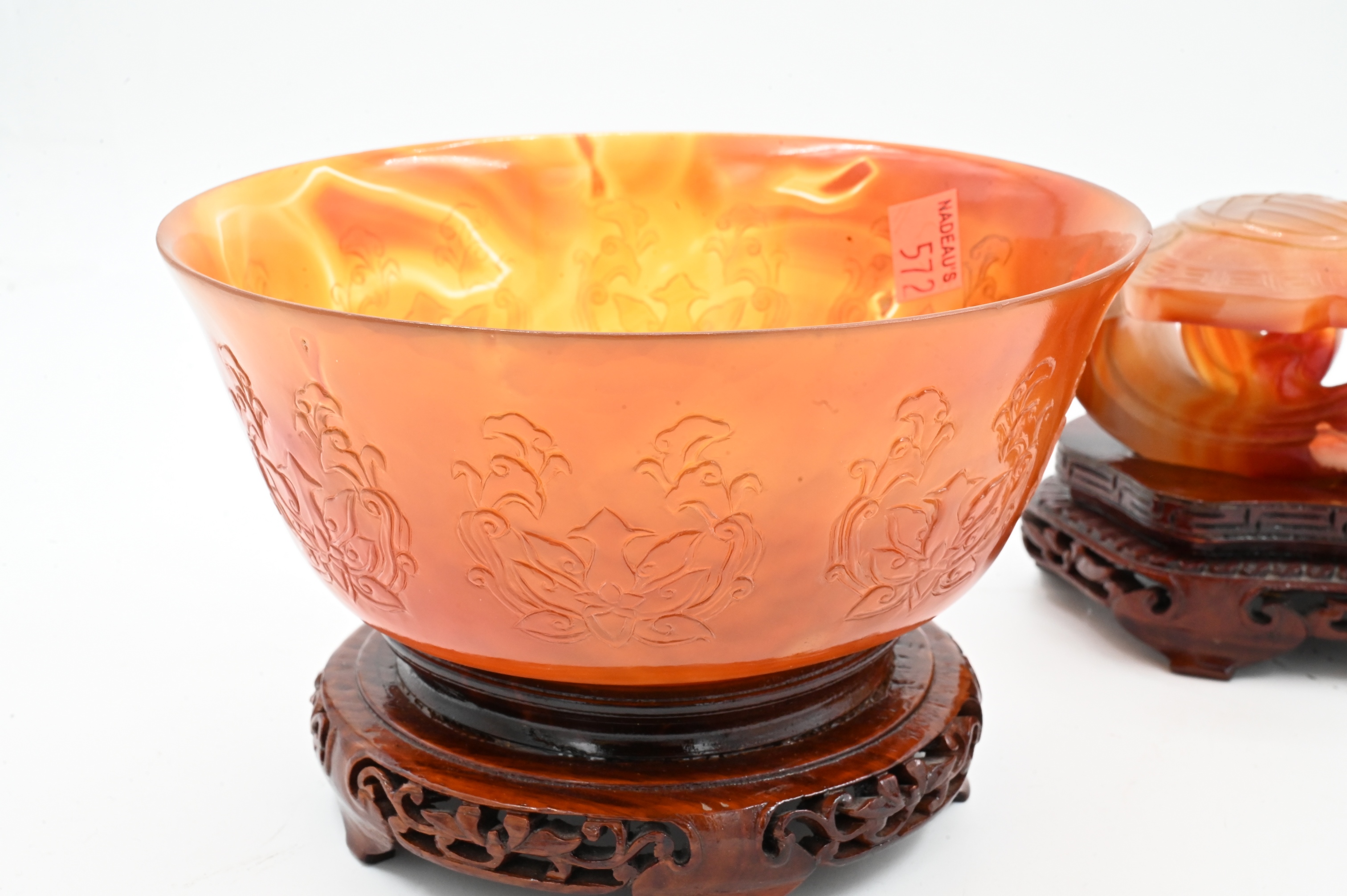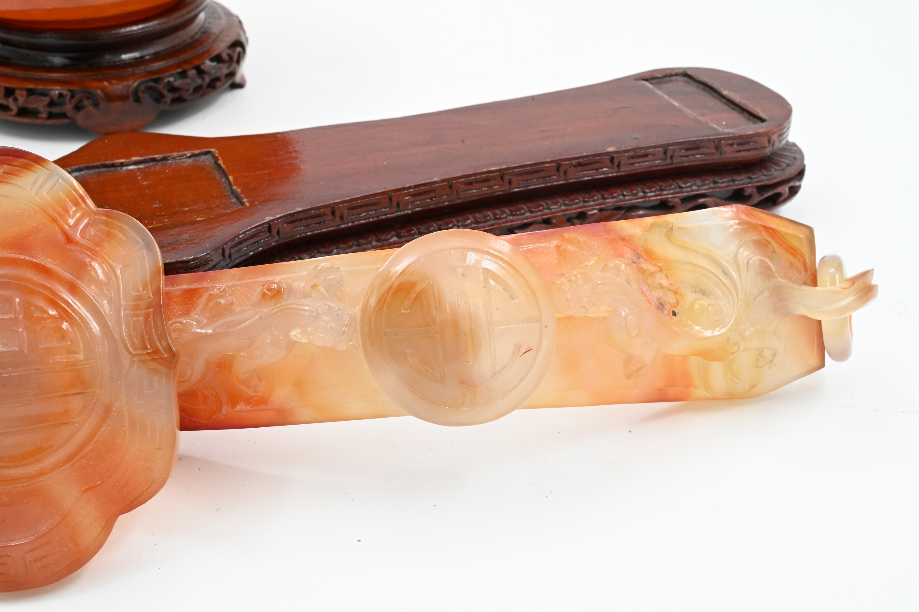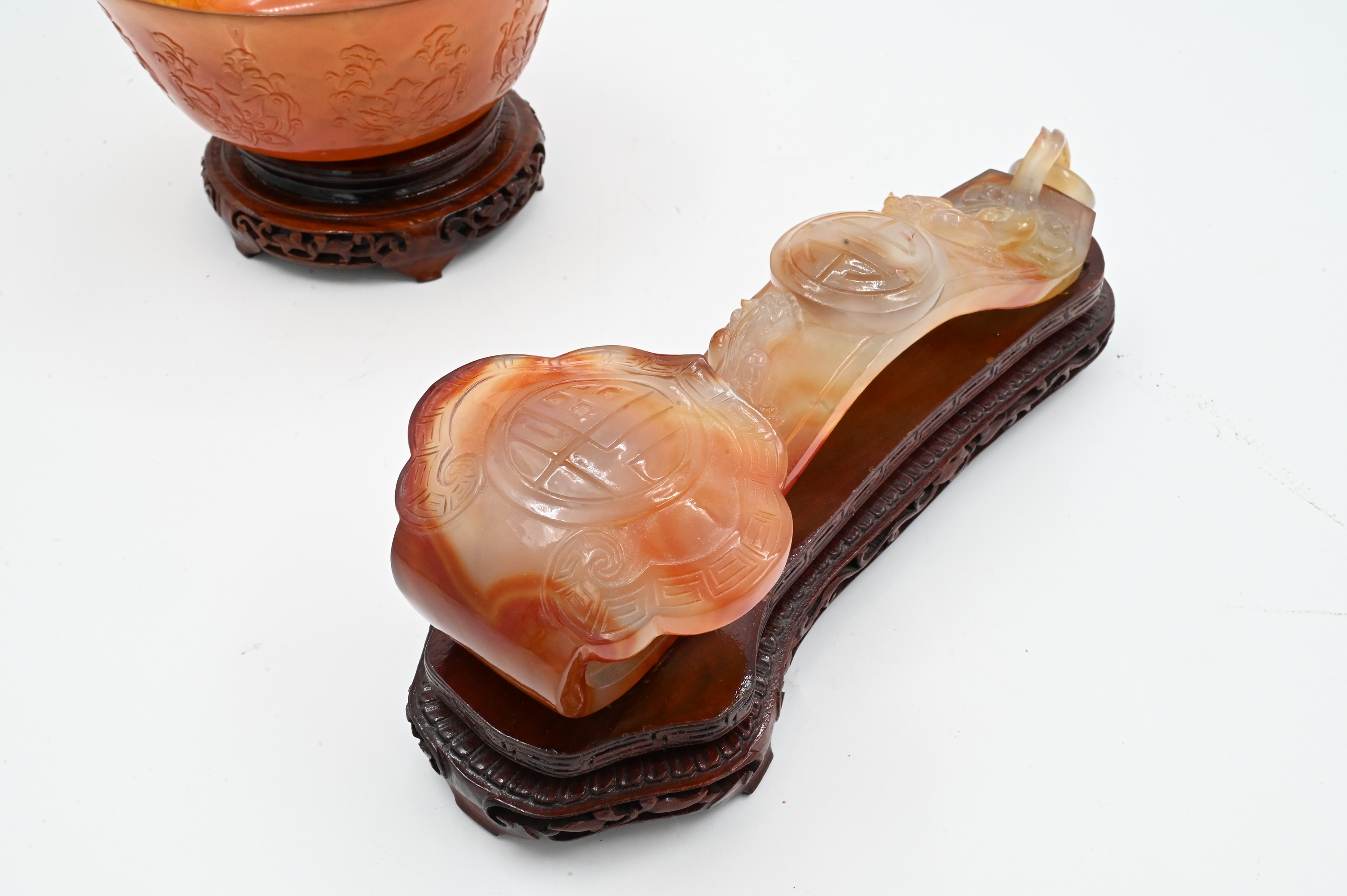 to include carved amber colored agate bowl having flower motif and a marbled agate Ruyi Scepter with dragons and ring (diameter 10 inches) both having wooden base in presentation boxes