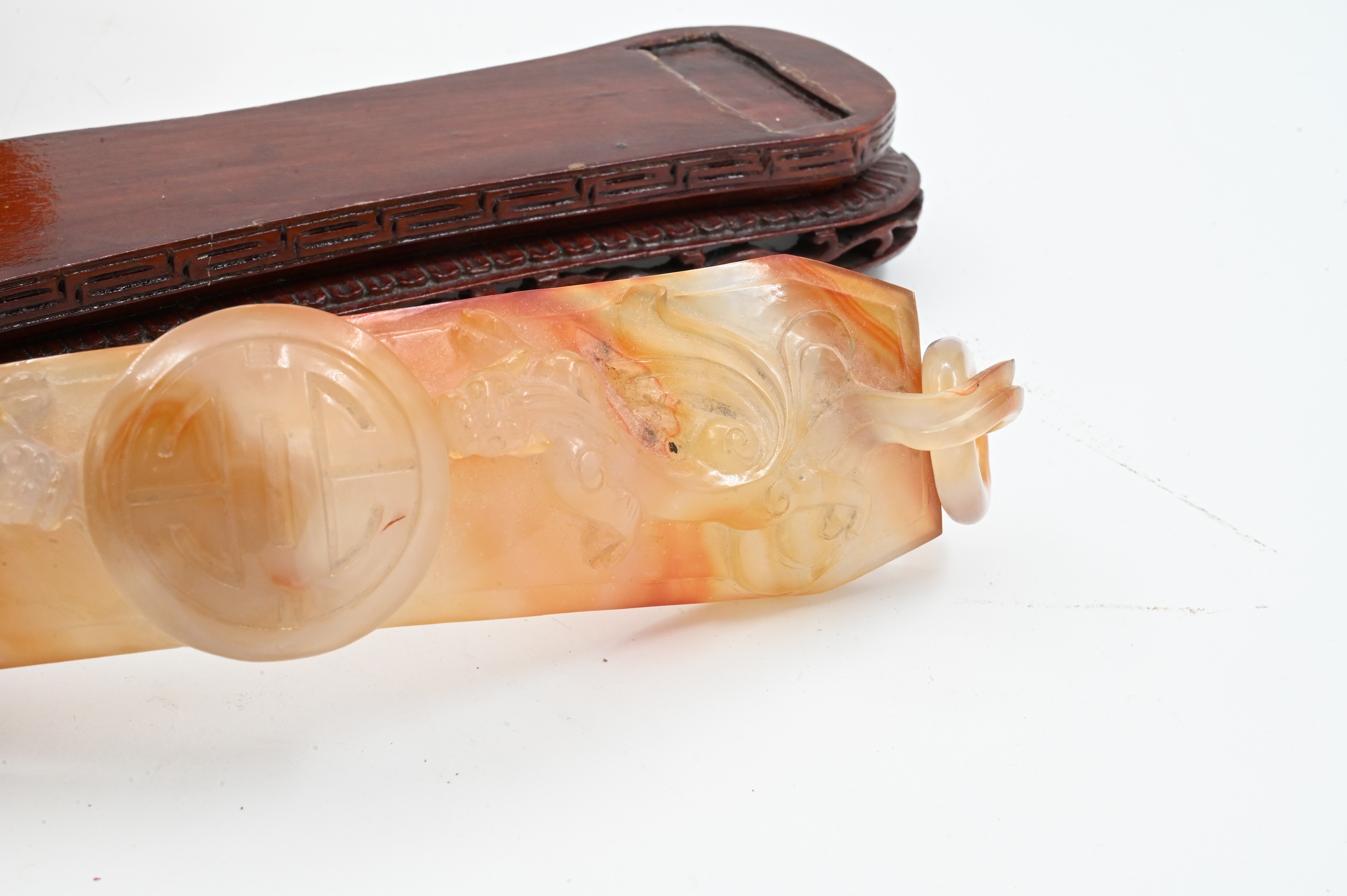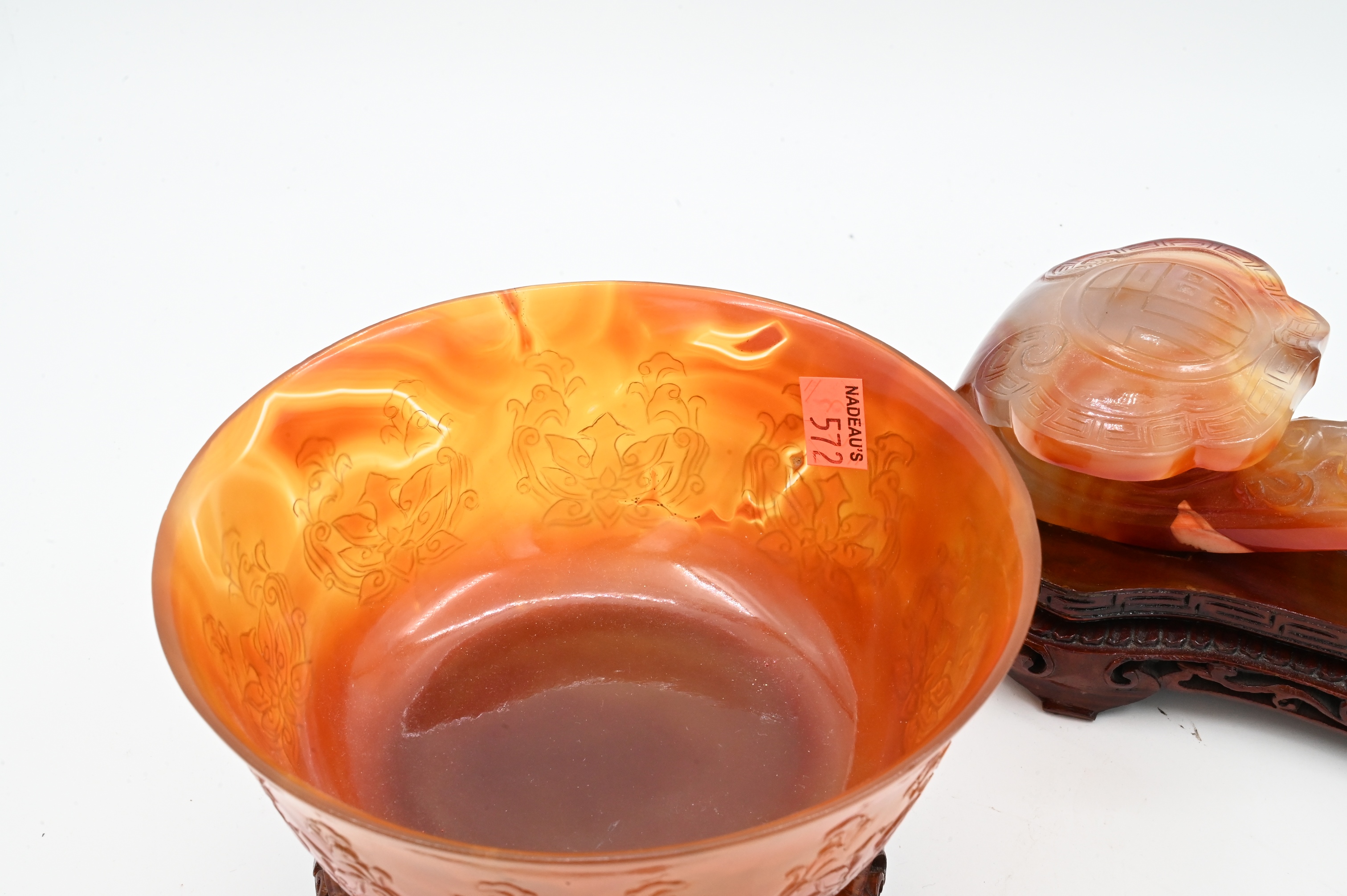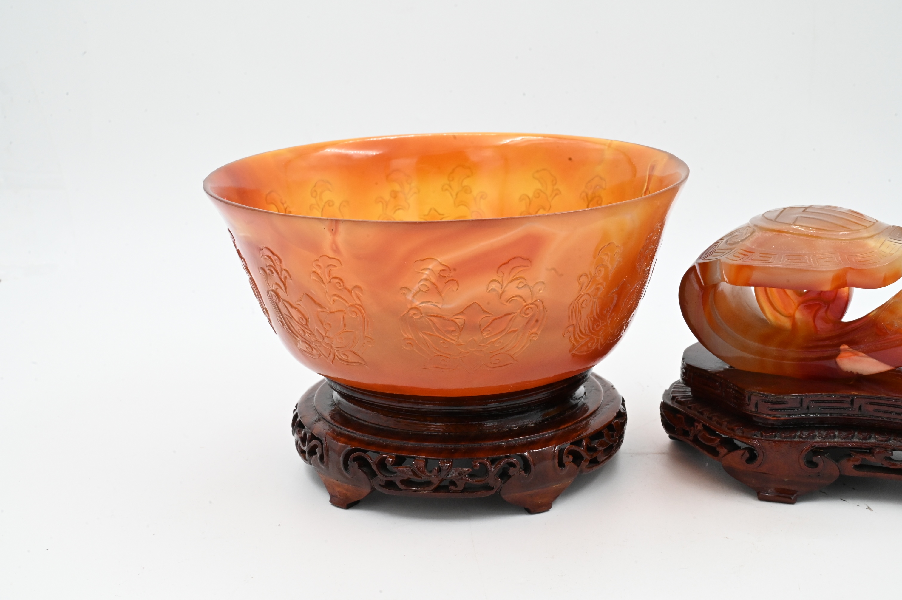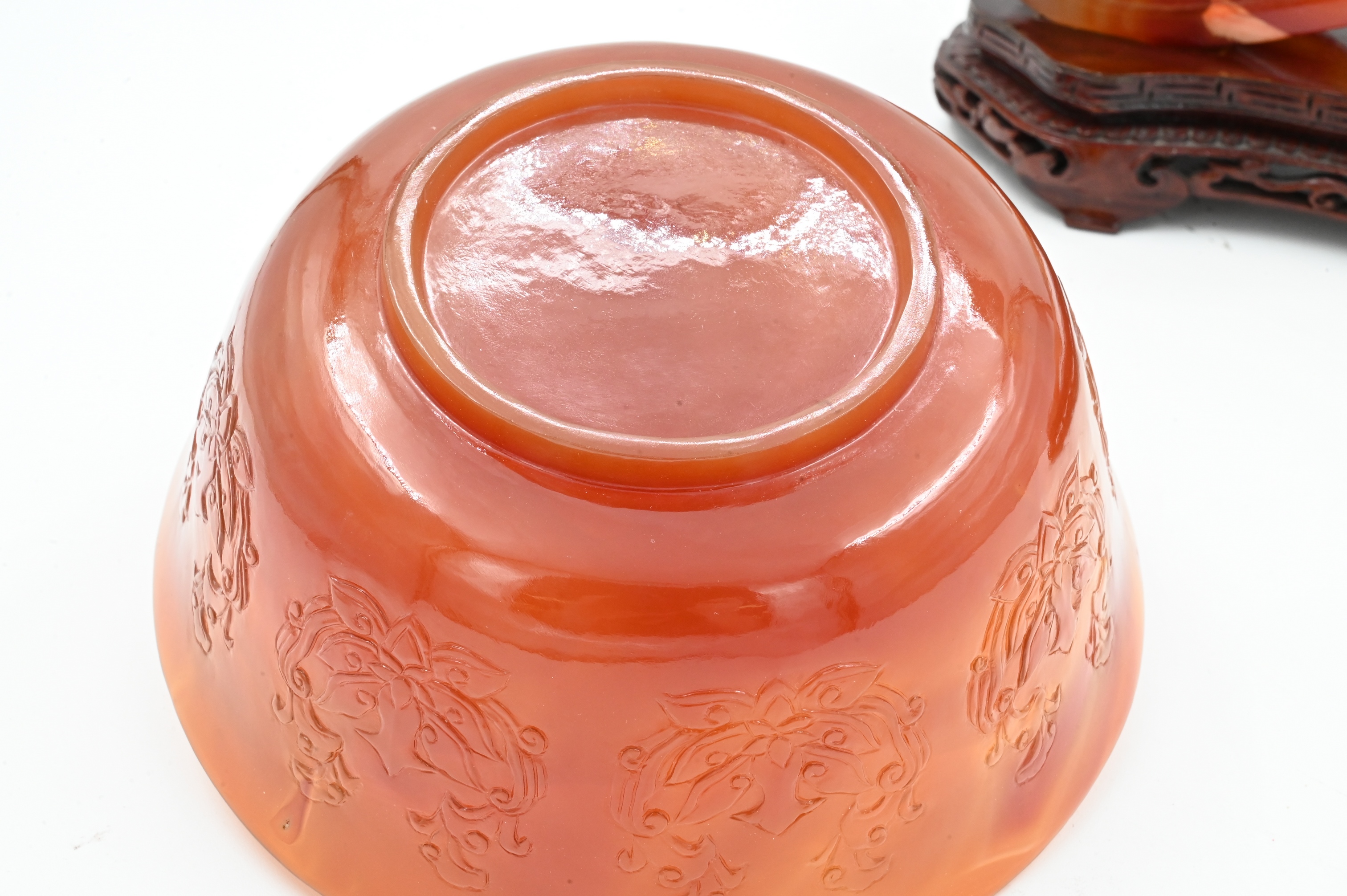 to include carved amber colored agate bowl having flower motif and a marbled agate Ruyi Scepter with dragons and ring (diameter 10 inches) both having wooden base in presentation boxes