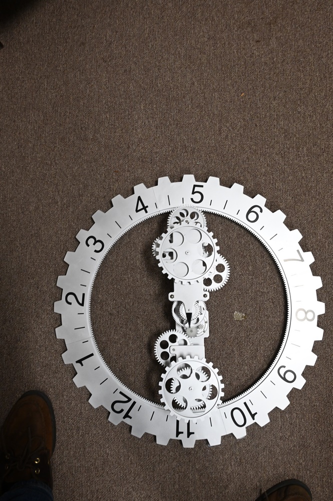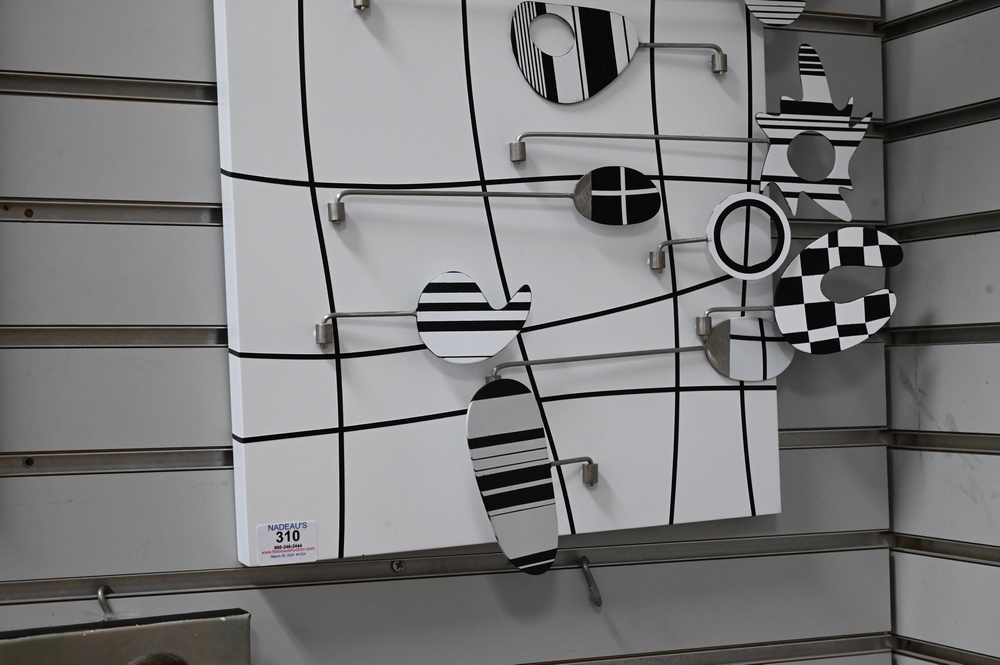 Two Piece Lot, to include Brad Howe (born 1959), steel and polyurethane sculpture, titled “Black and White Hinjo”, 20″ x 15″; along with a contemporary wall clock.