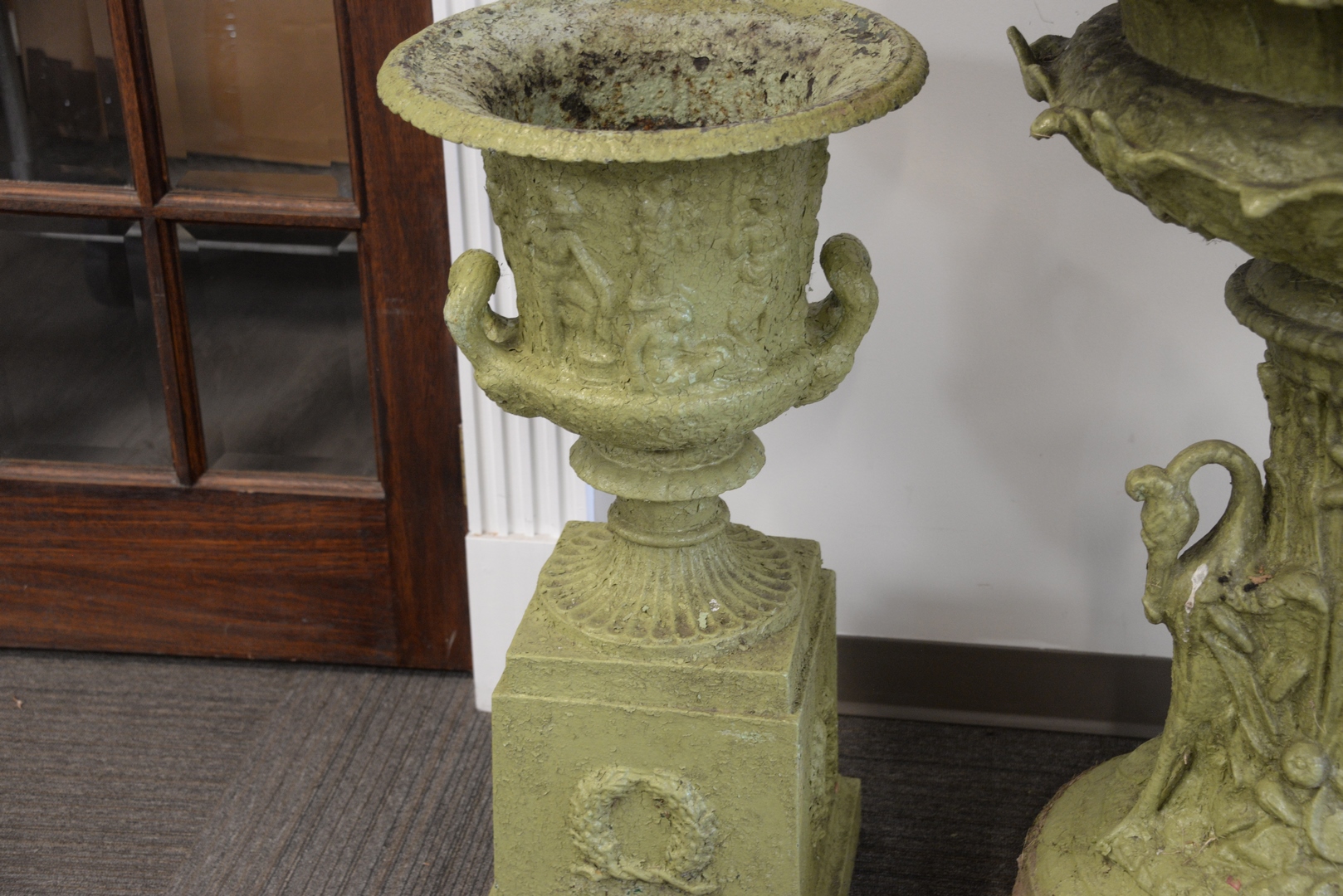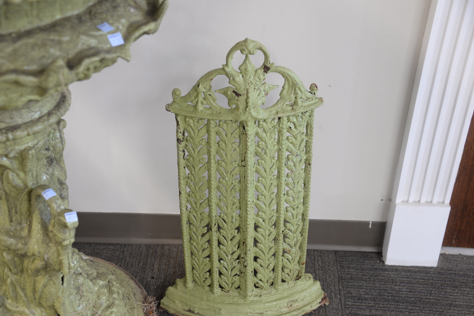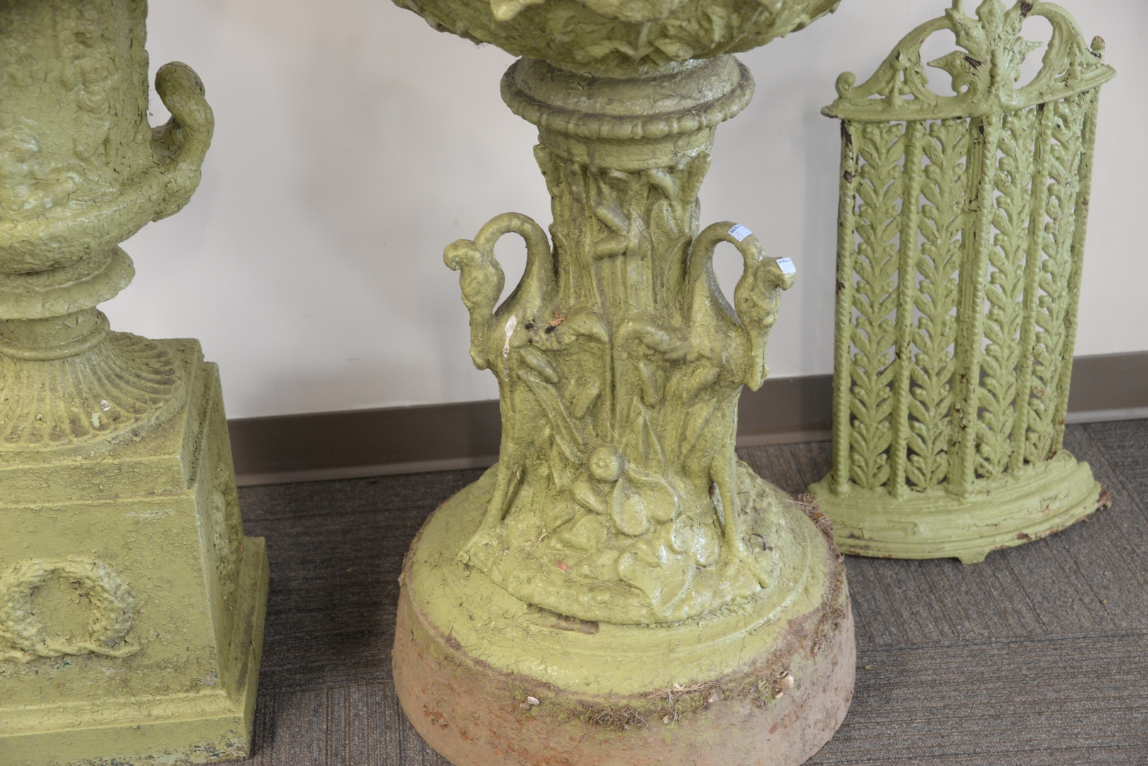 Lot 310: Victorian Iron Urn having leaf design, top supported by three cranes on round base, now in green enamel, height 43 inches. diameter 32 inches along with two-Piece Victorian Iron Urn, in two parts, along with an iron umbrella holder, urn height 38 inc