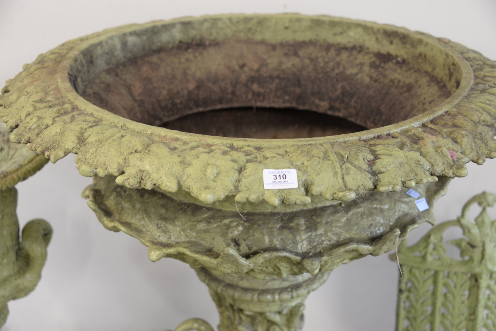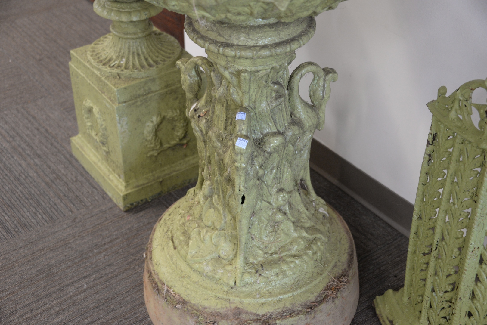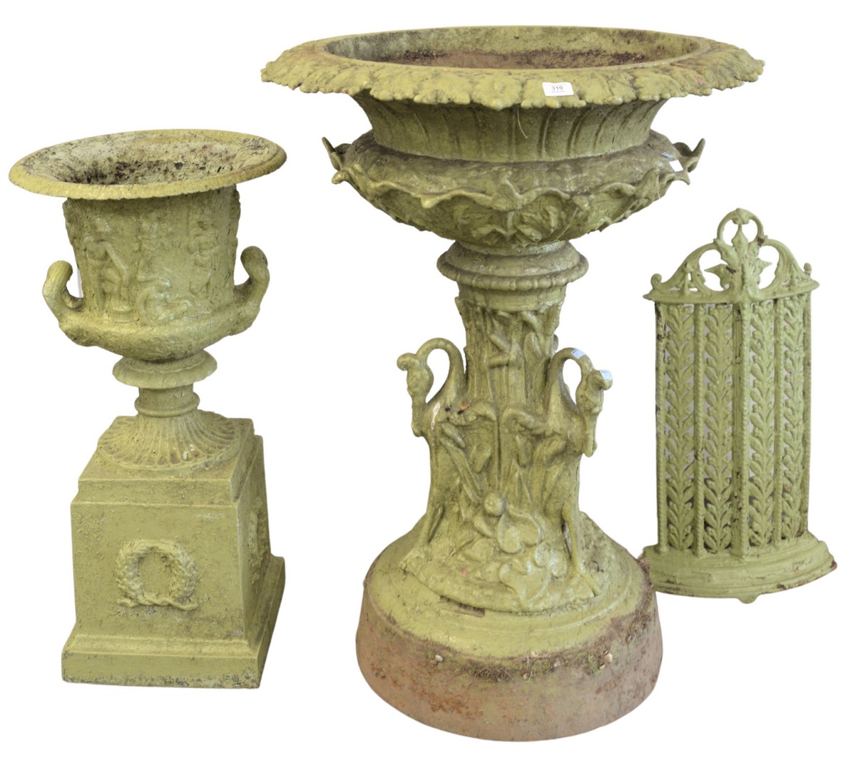 Lot 310: Victorian Iron Urn having leaf design, top supported by three cranes on round base, now in green enamel, height 43 inches. diameter 32 inches along with two-Piece Victorian Iron Urn, in two parts, along with an iron umbrella holder, urn height 38 inc