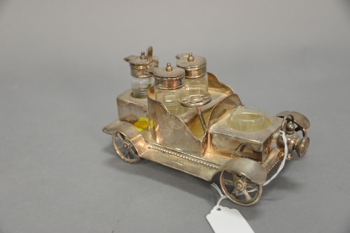 Vintage car silverplated cruet stand with bottles. lg. 8 in.