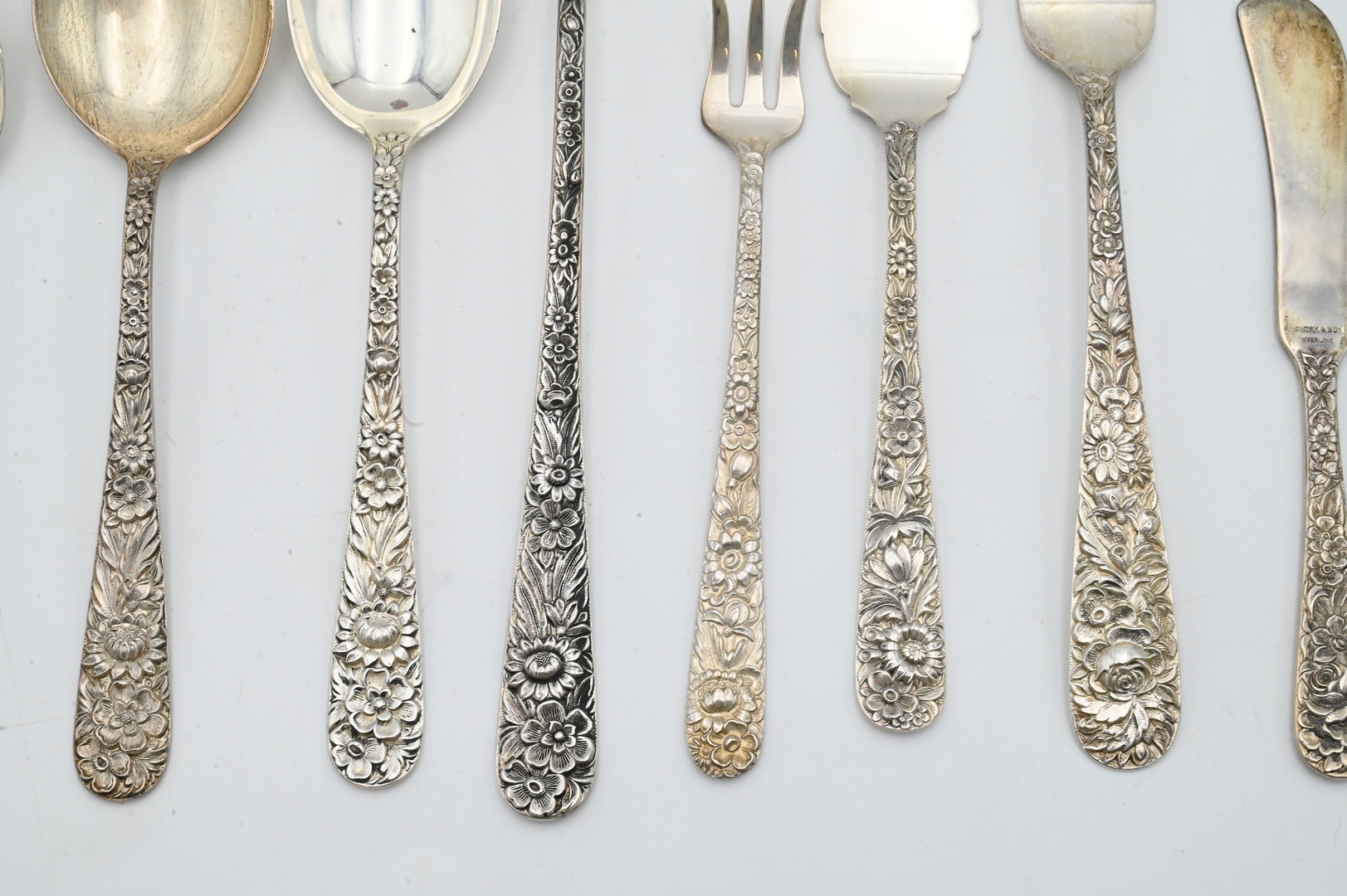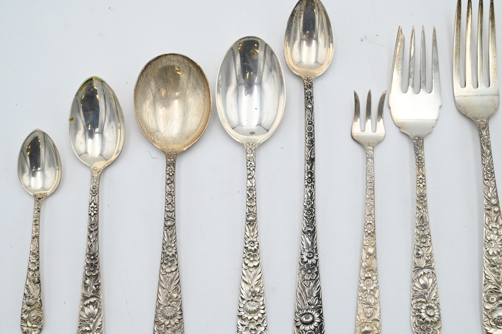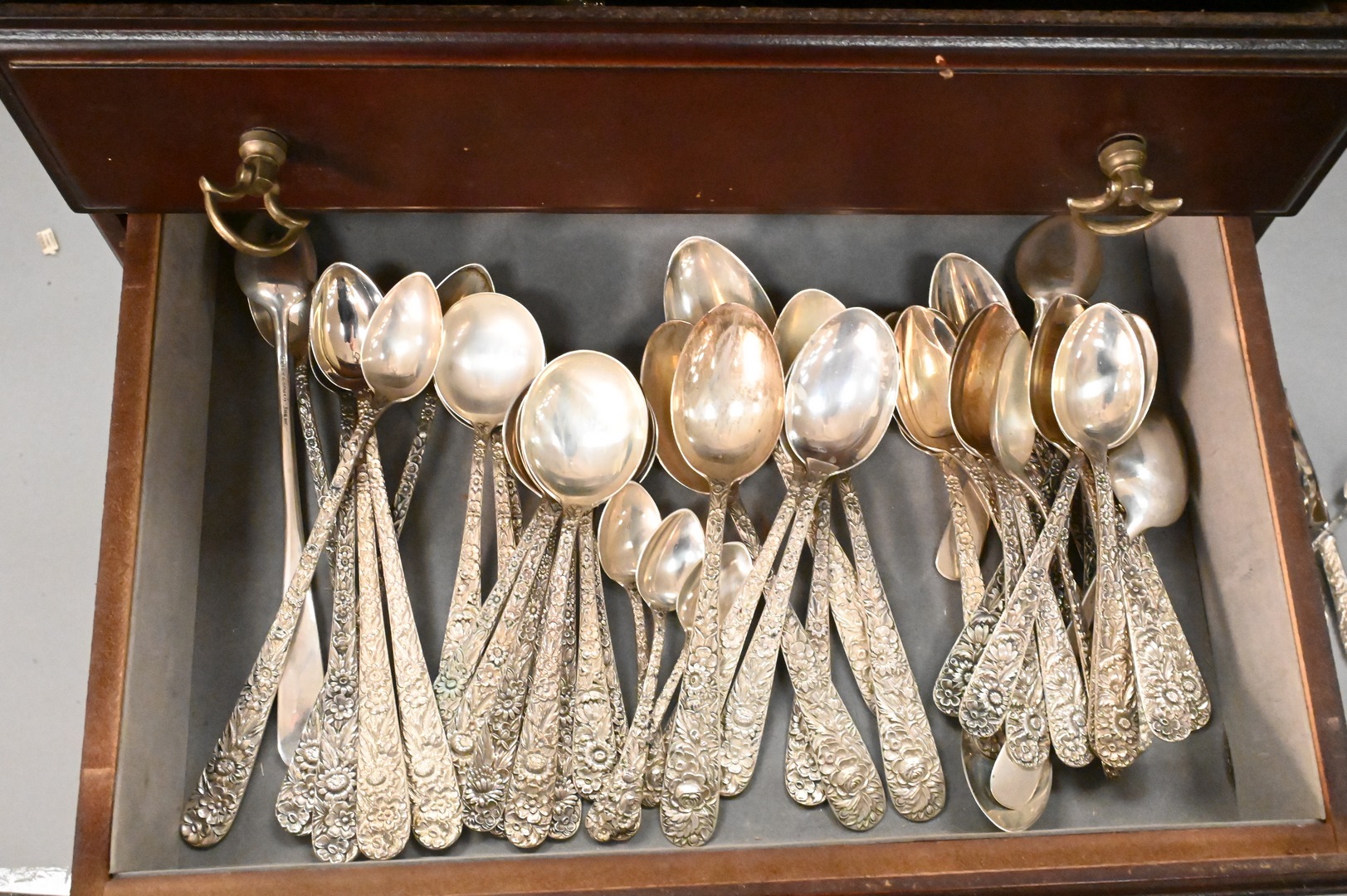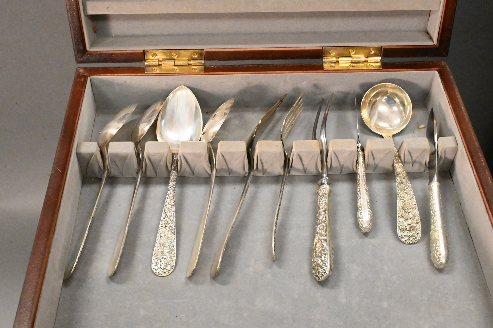 Repousse pattern, to include 13 butter knives, 23 serving utensils, 8 knives, 8 solid sterling butter knives, 8 dinner forks, 8 iced tea spoons,12 soup spoons in two sizes, 4 demitasse spoons, 10 cocktail spoons, 20 teaspoons, 8 tablespoons, align with 8 salad forks