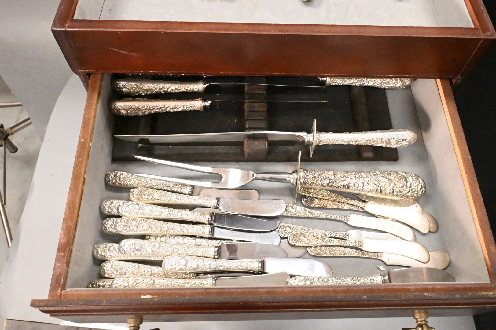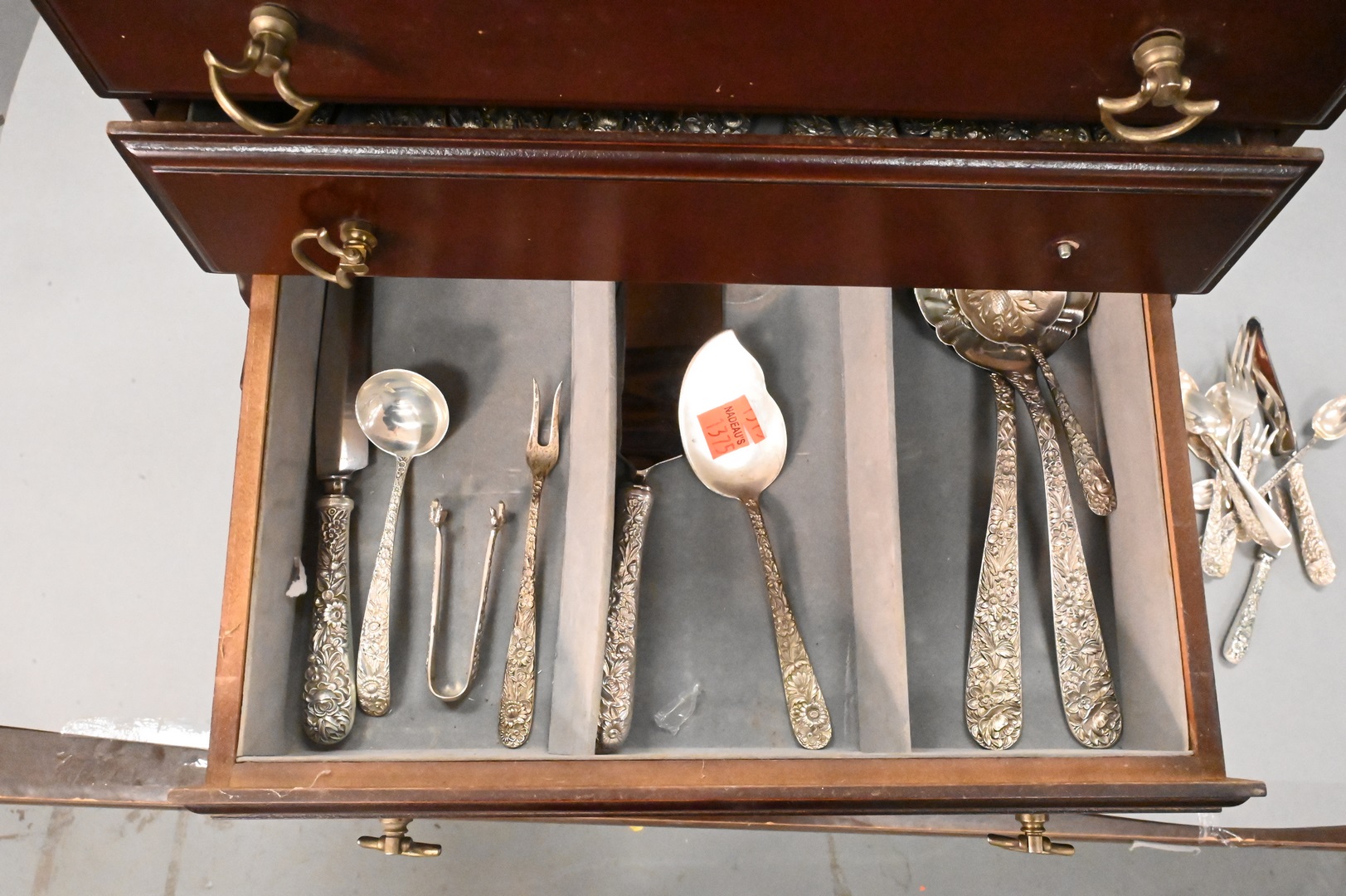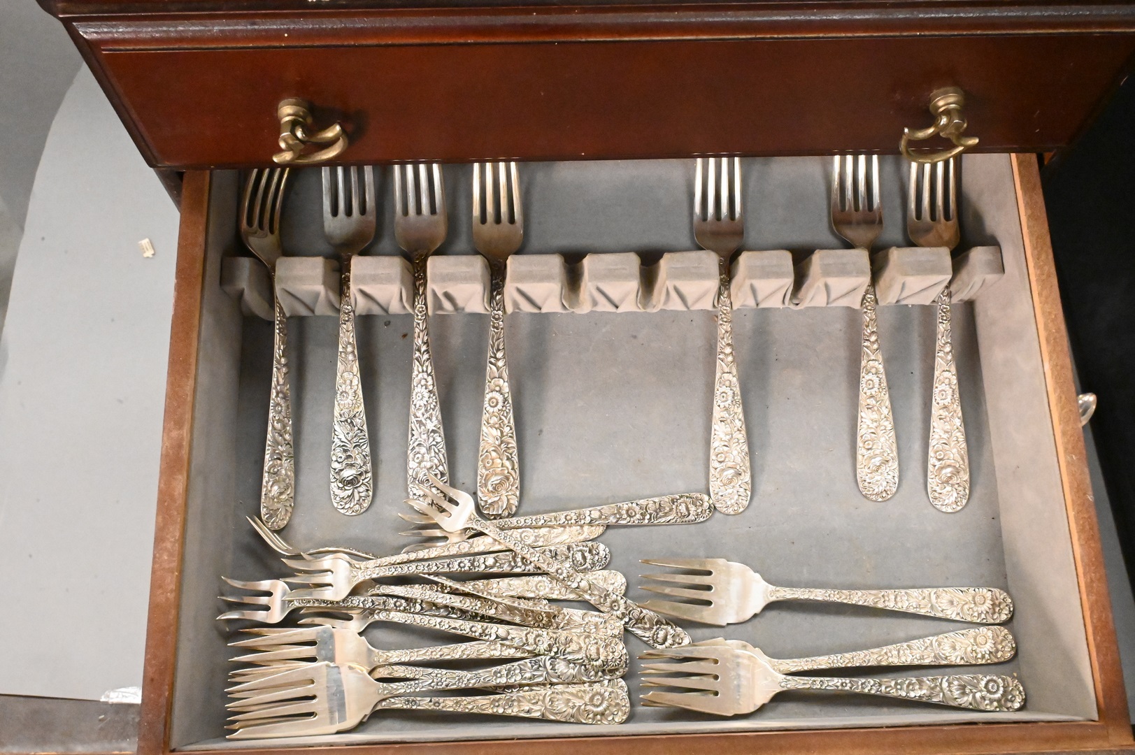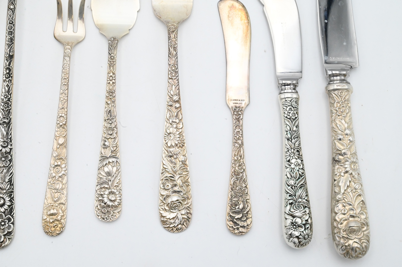Repousse pattern, to include 13 butter knives, 23 serving utensils, 8 knives, 8 solid sterling butter knives, 8 dinner forks, 8 iced tea spoons,12 soup spoons in two sizes, 4 demitasse spoons, 10 cocktail spoons, 20 teaspoons, 8 tablespoons, align with 8 salad forks