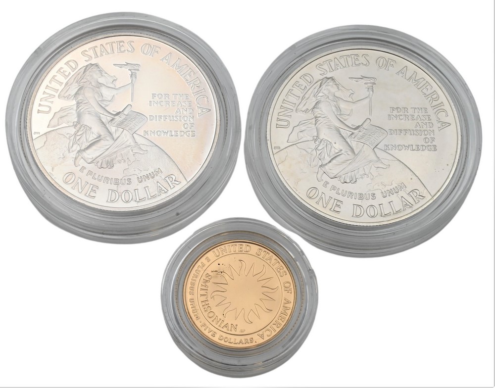 5 Dollar Gold Uncirculated, along with 1996 Smithsonian to include one dollar silver proof, and one dollar silver uncirculated.