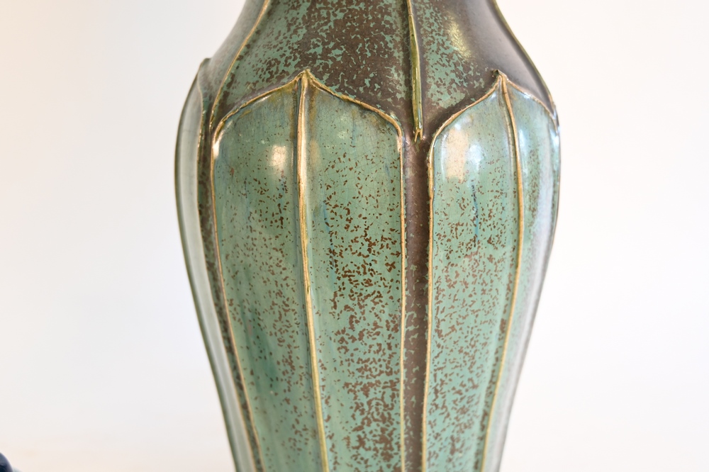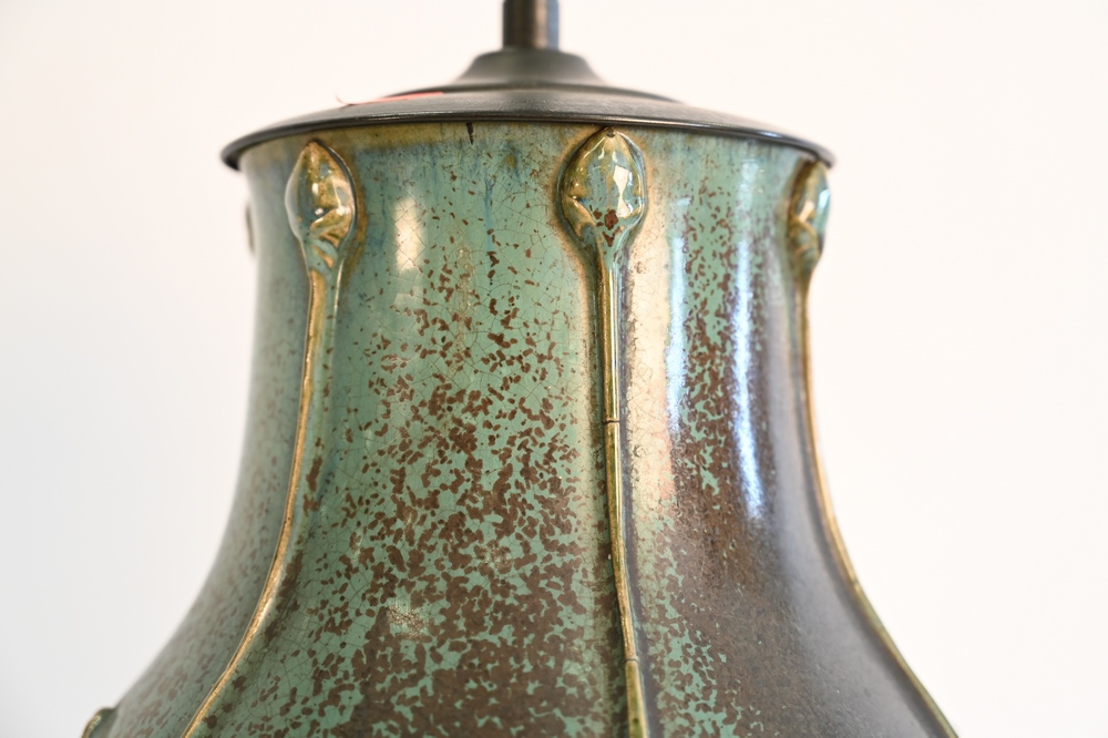 Lot 311: Blue and Brown Glazed Pottery Table Lamp, having two lights, overall height 34 1/2 inches.