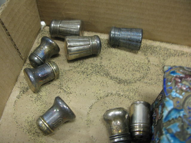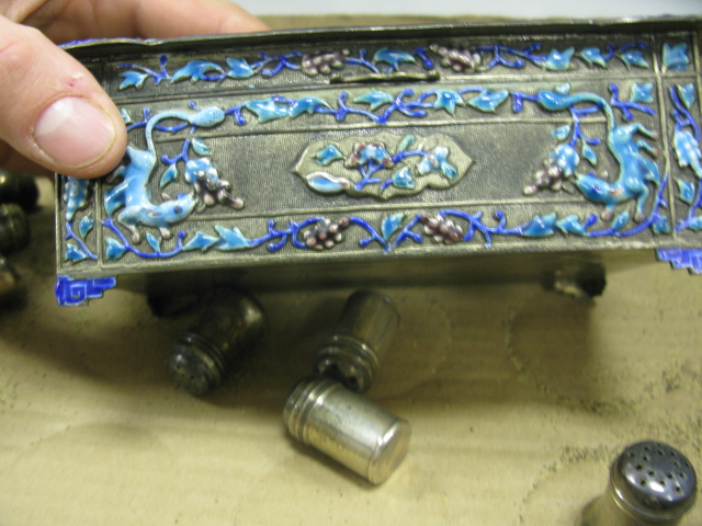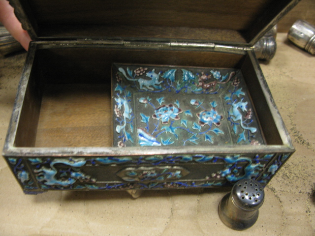 Box lot to include a Chinese enameled box, a silver meat liner and silver pepper shakers.