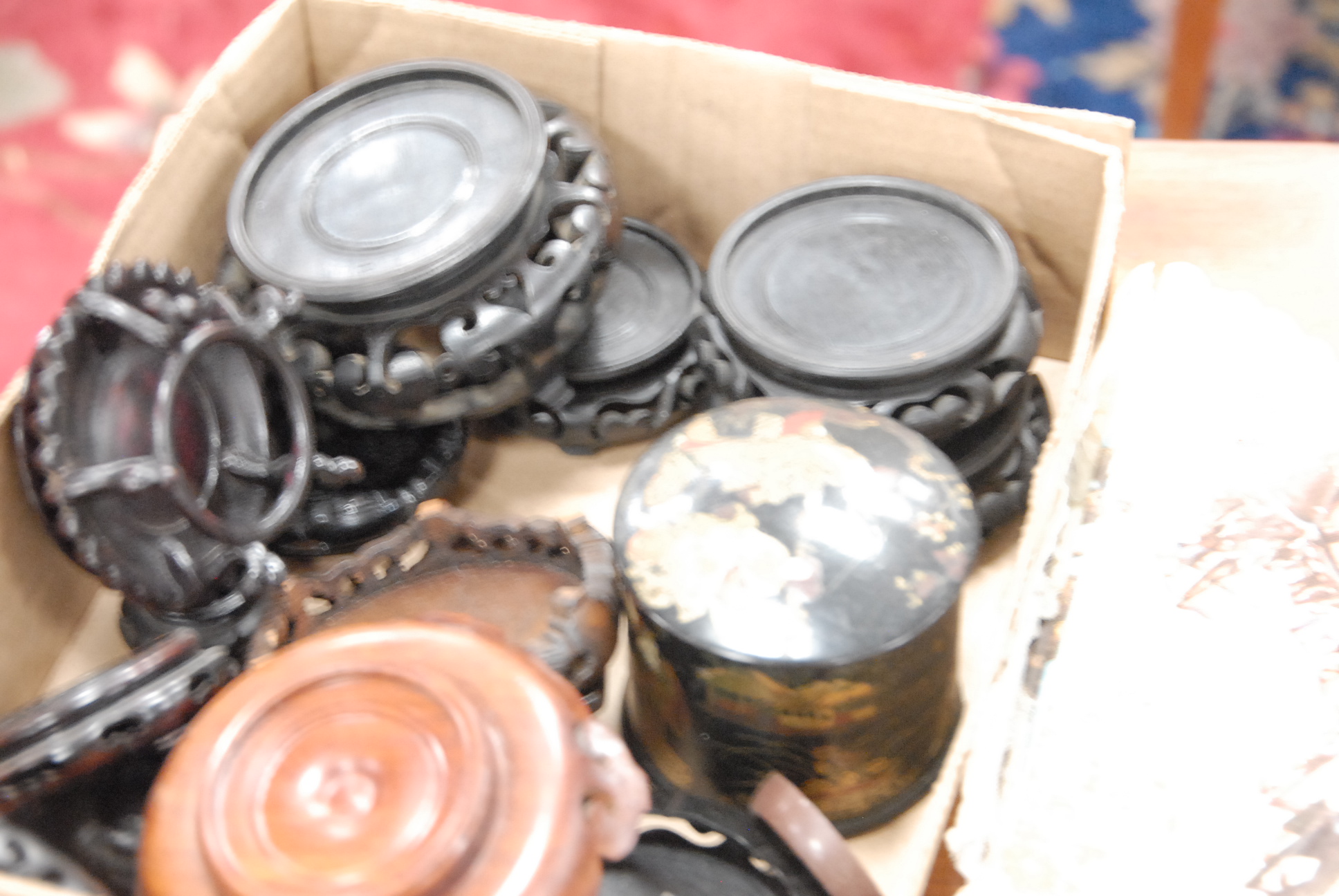Box of Oriental stands and an Oriental fan, along with a covered round box.