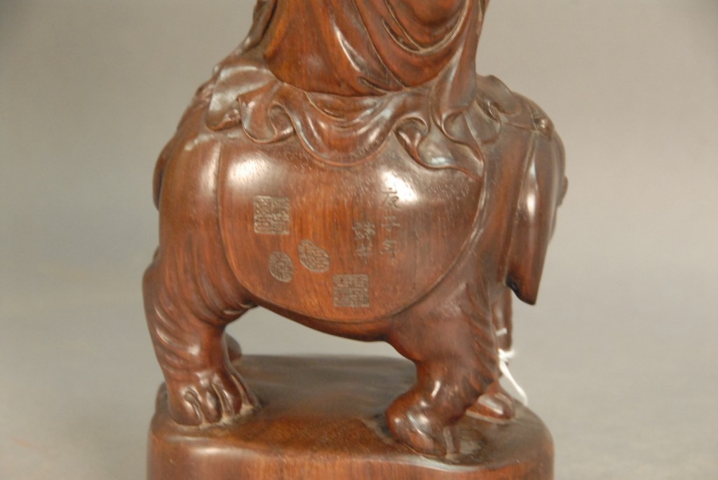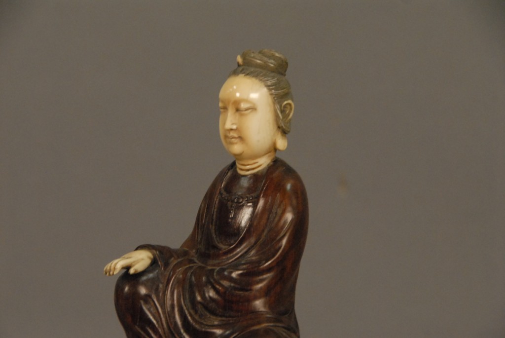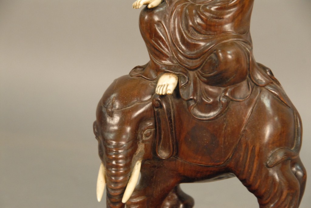 Lot 311: Carved ivory and hardwood guanyin figure sitting on an elephant, having carved ivory head, hand, foot, and tusk with seal and charac…