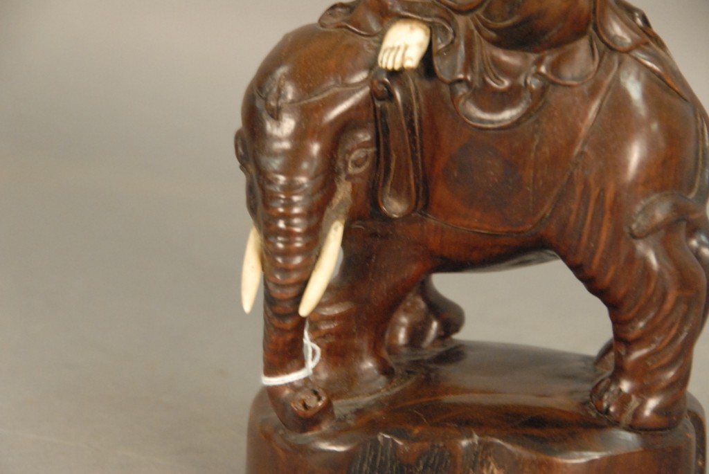 Carved ivory and hardwood guanyin figure sitting on an elephant, having carved ivory head, hand, foot, and tusk with seal and character marks on back saddle of the elephant, ht. 10, wd. 4 1/2.