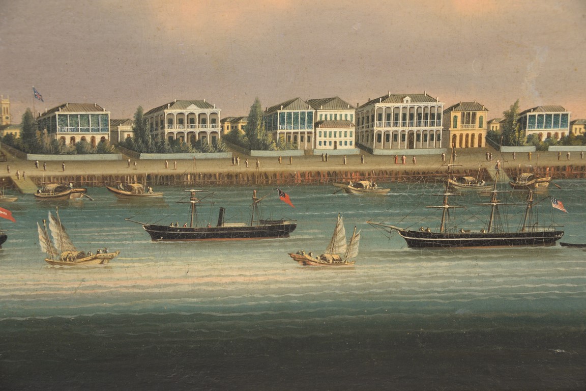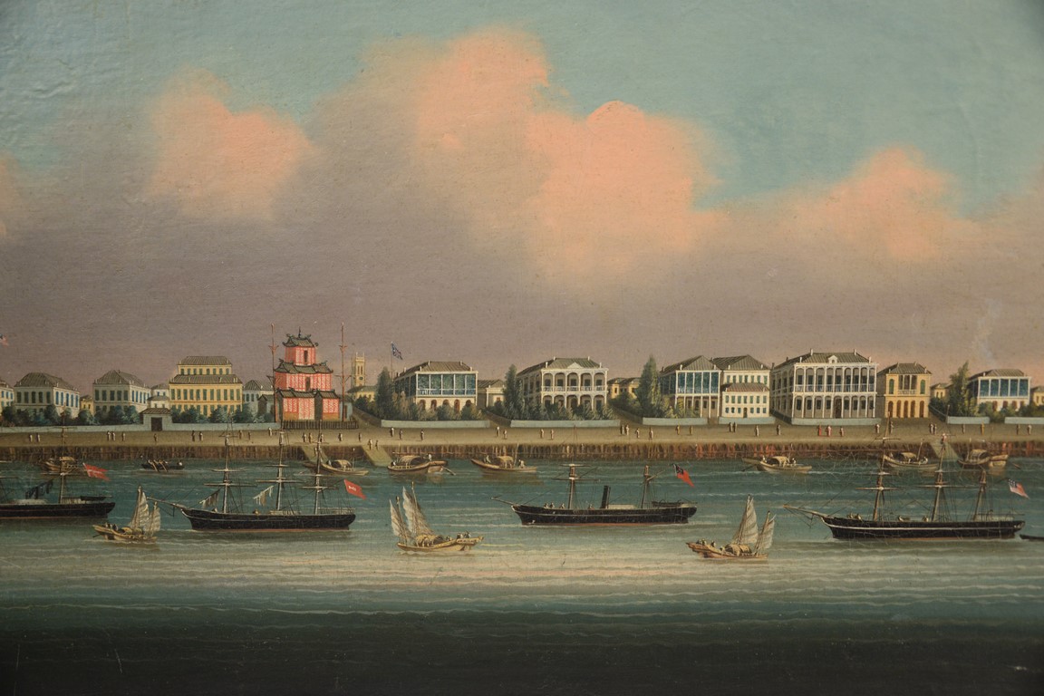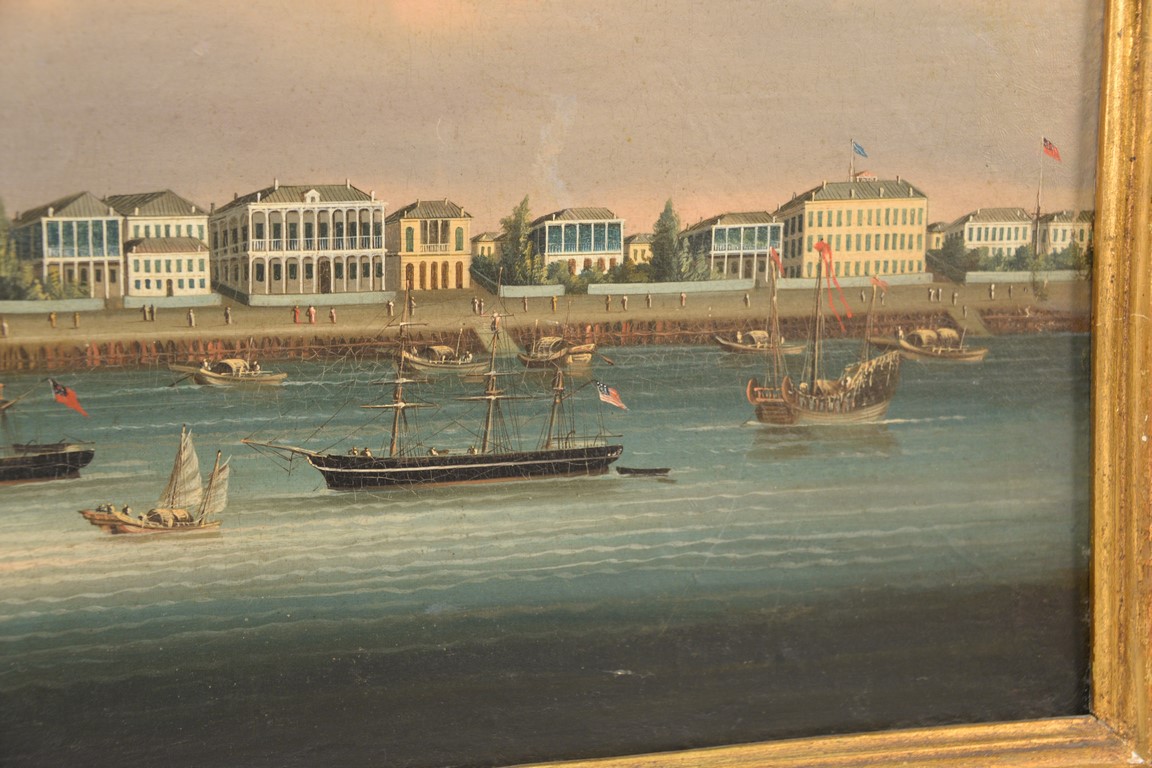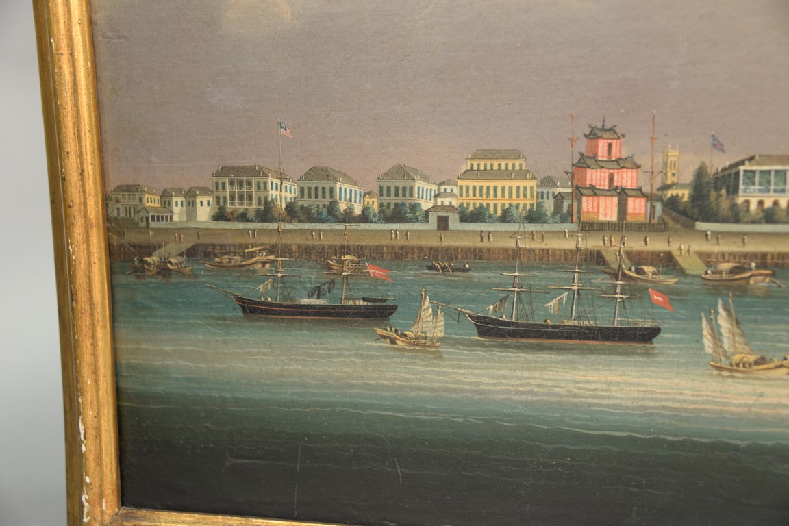 Lot 311: Chinese School, 19th Century oil on paper mounted on canvas The Bund of Shanghai depicting a detailed view of the Western Compani…