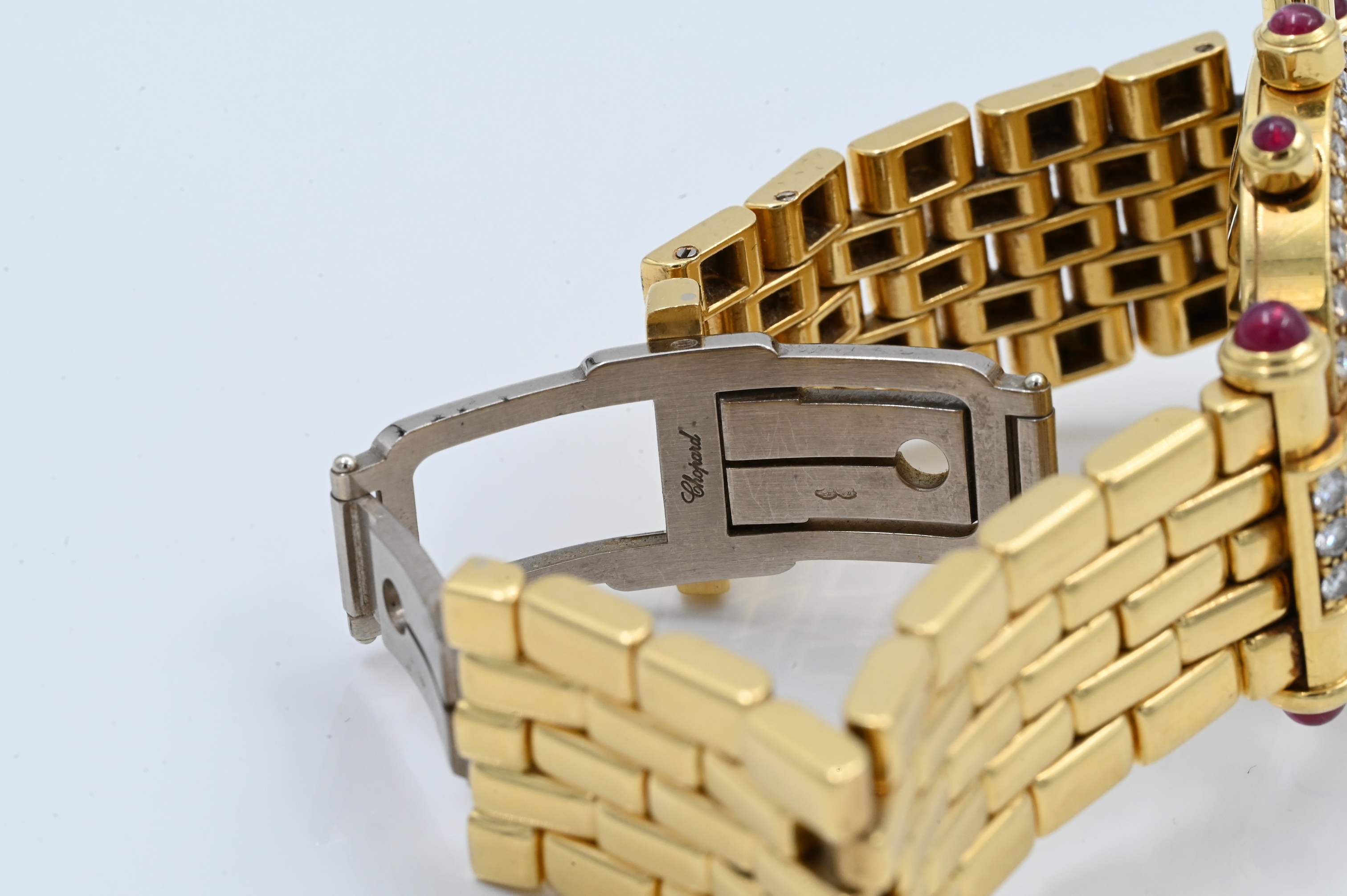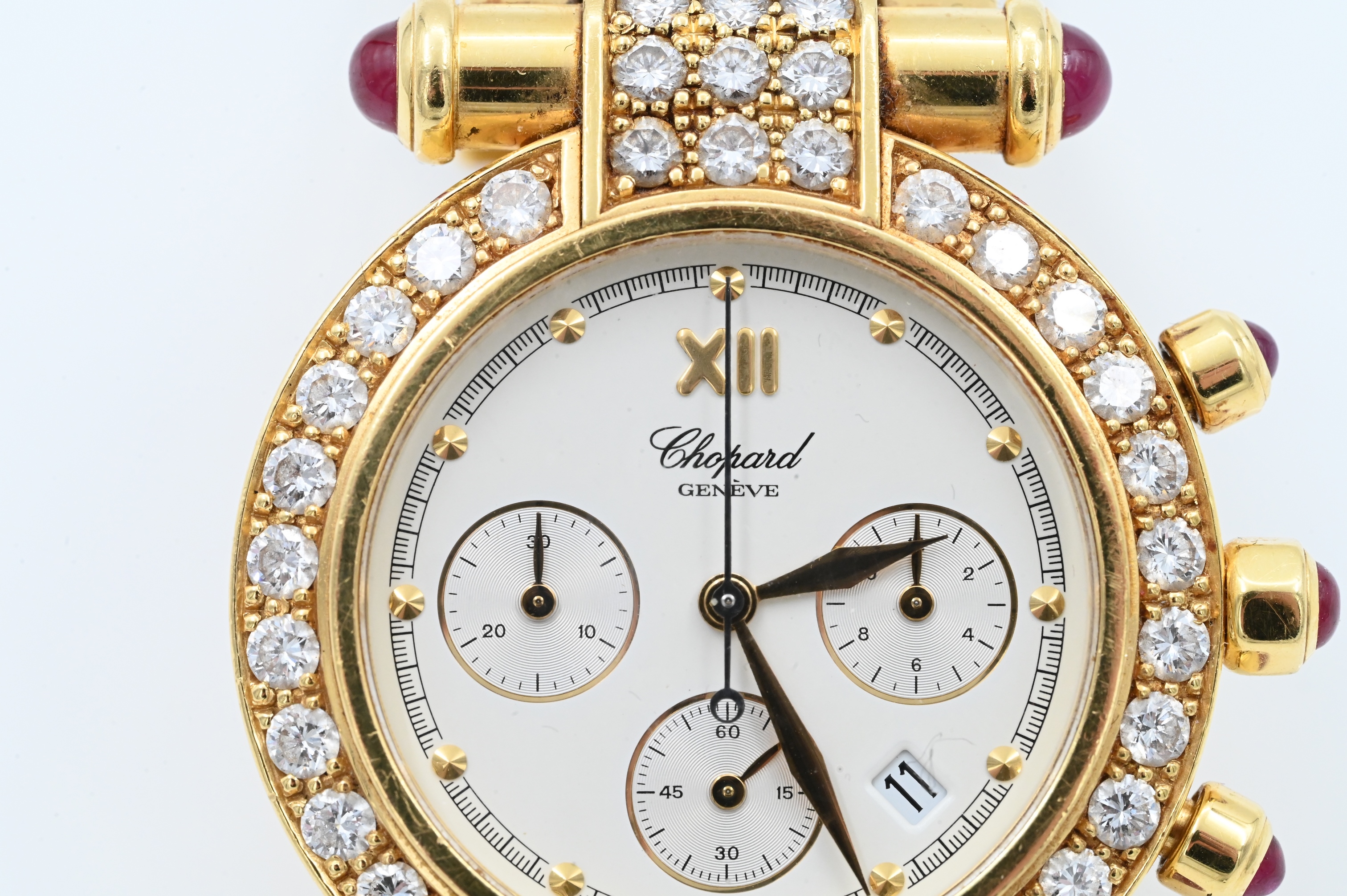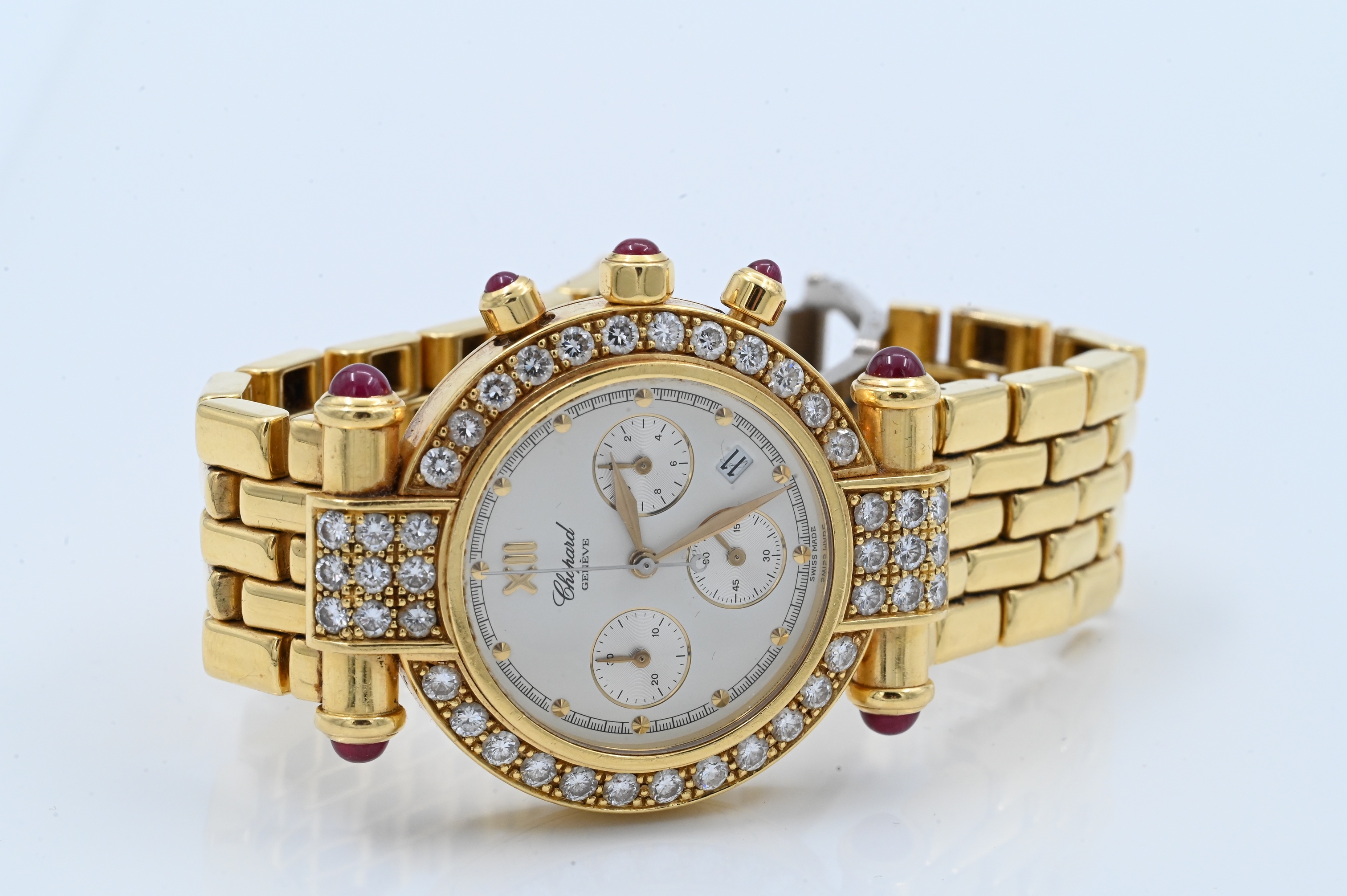 having diamond bezel, lugs, and ruby tips, quartz automatic movement with white dial, three subsidiary dials 30 minute and 12 hour registers aperture for date, case, band, and movement signed Chopard model number S37/3159-21, case number 352852.1215.