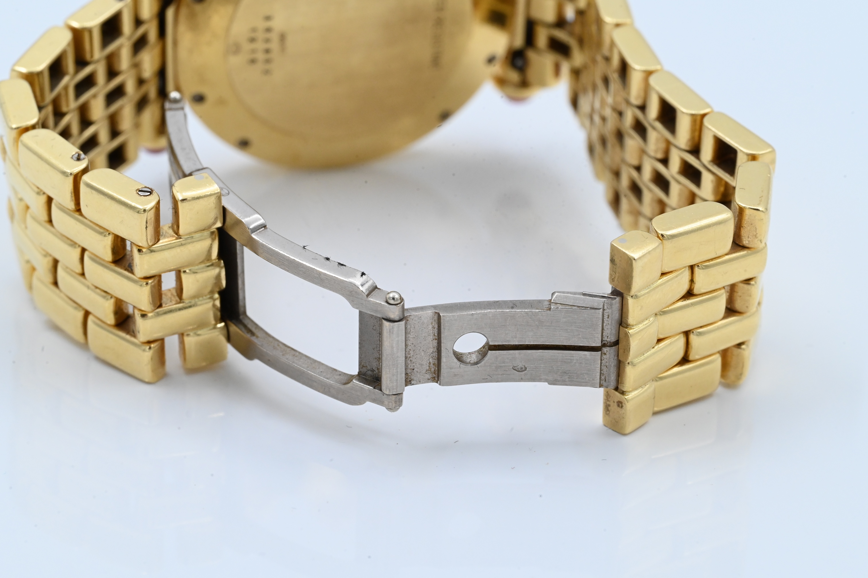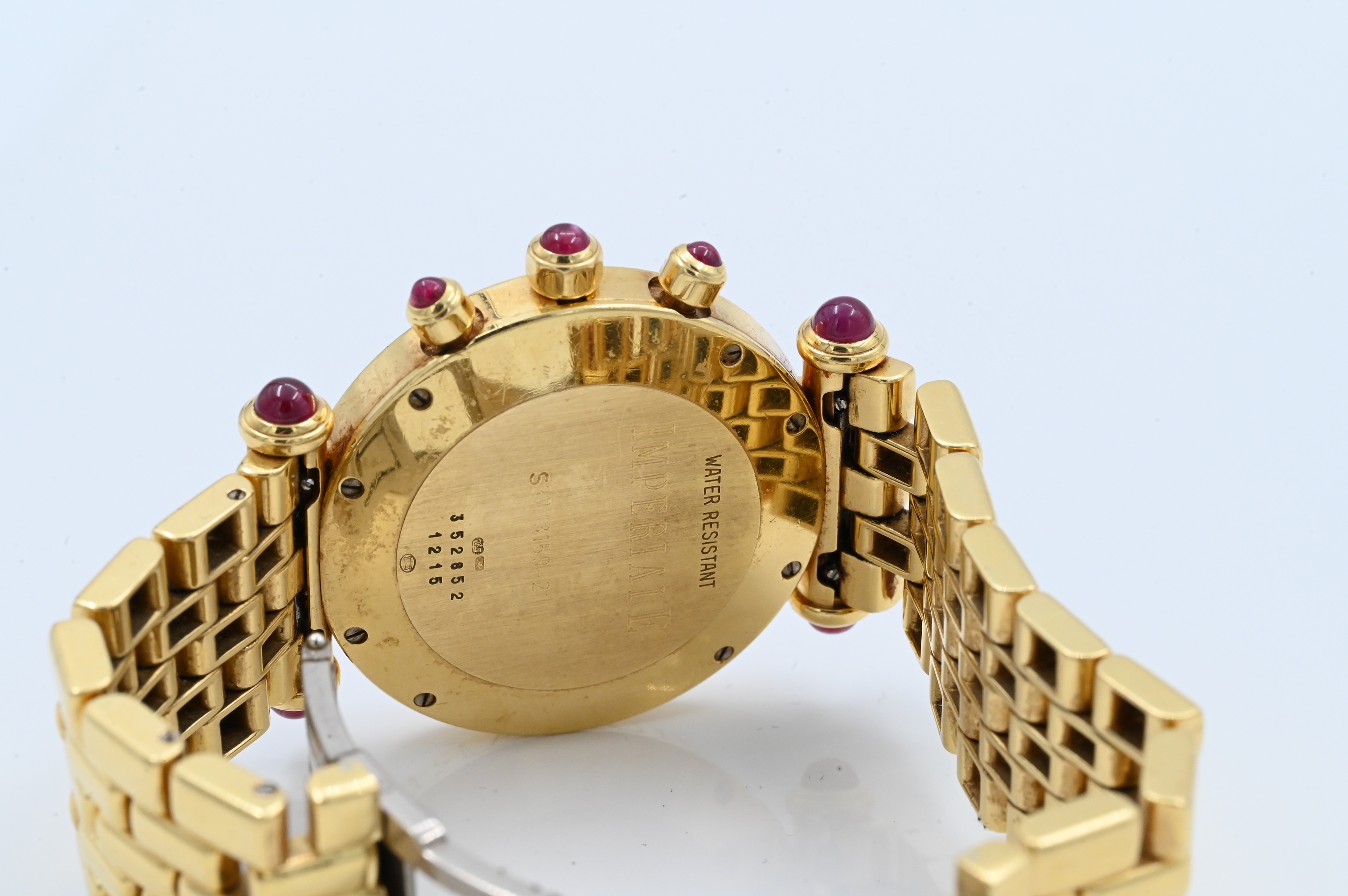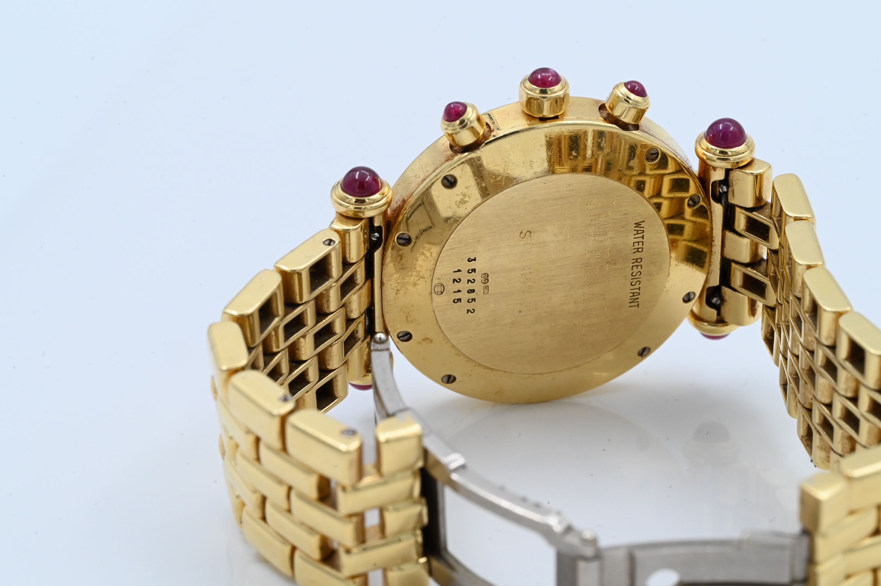 having diamond bezel, lugs, and ruby tips, quartz automatic movement with white dial, three subsidiary dials 30 minute and 12 hour registers aperture for date, case, band, and movement signed Chopard model number S37/3159-21, case number 352852.1215.