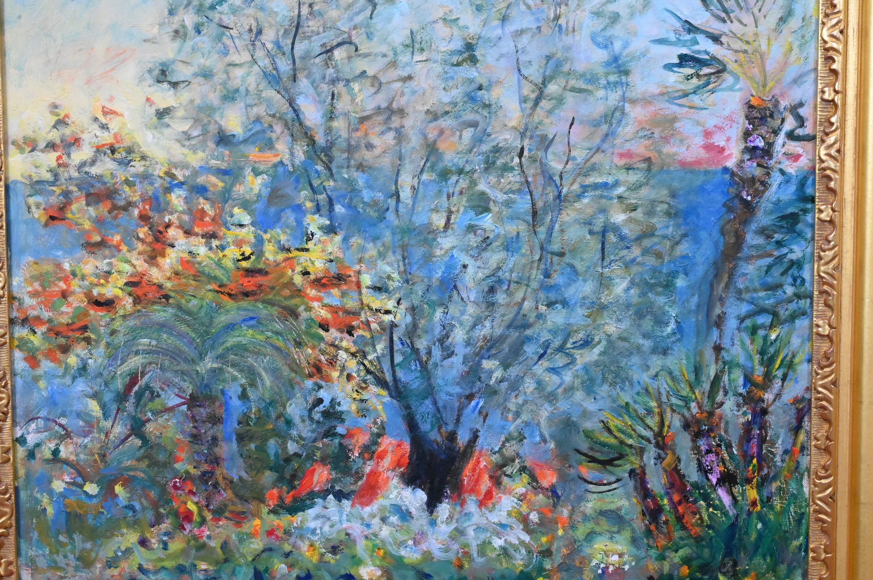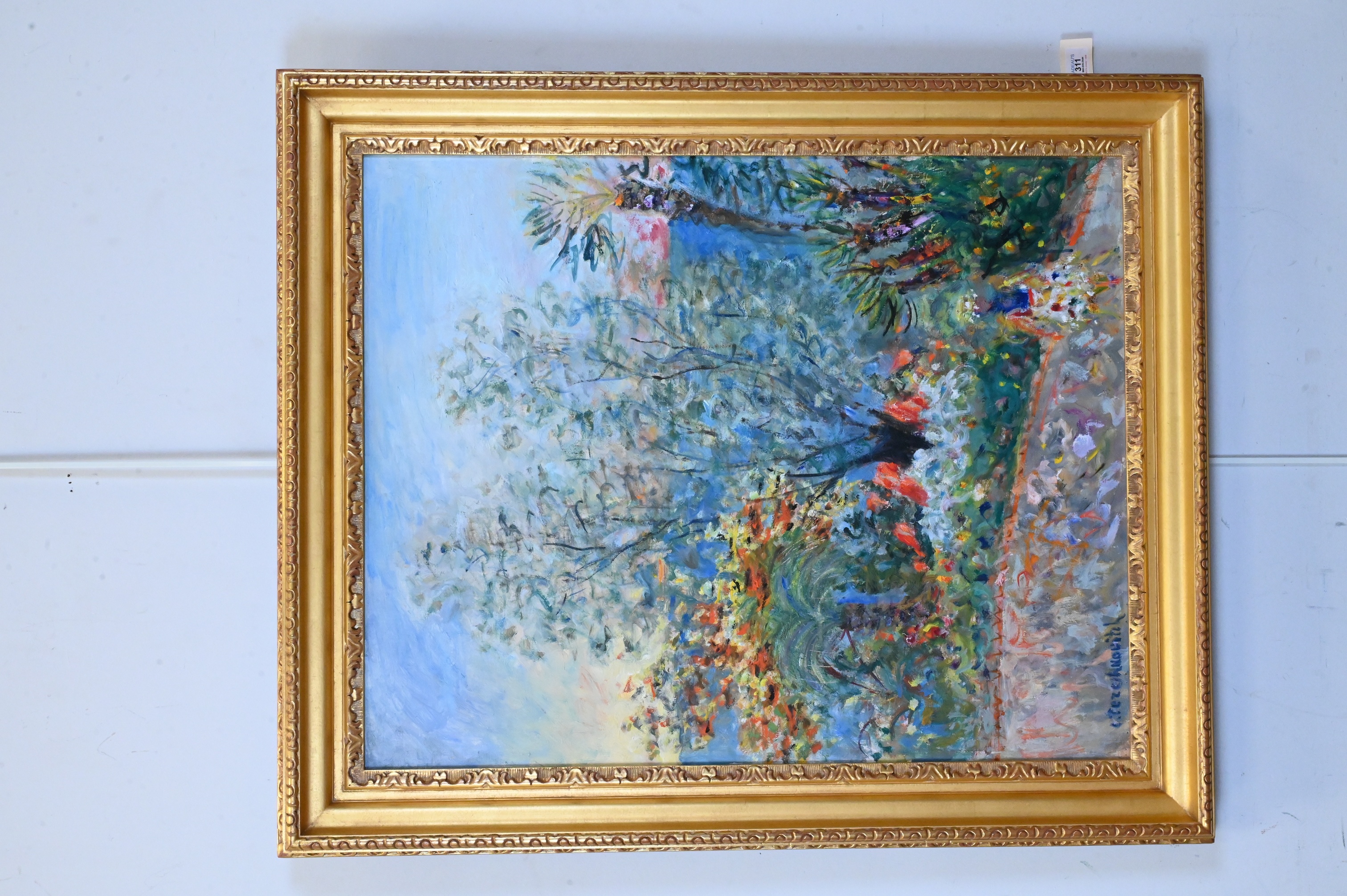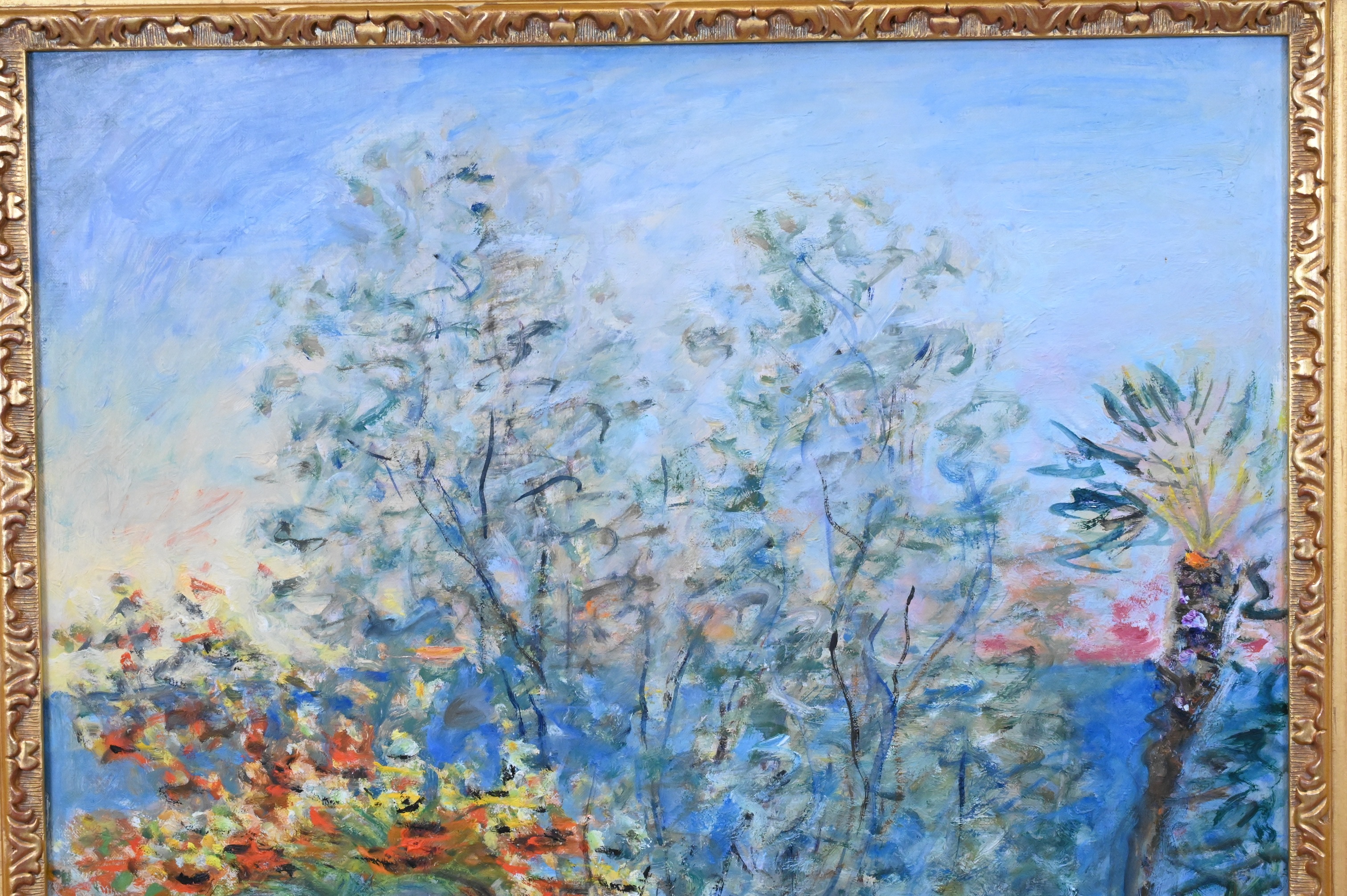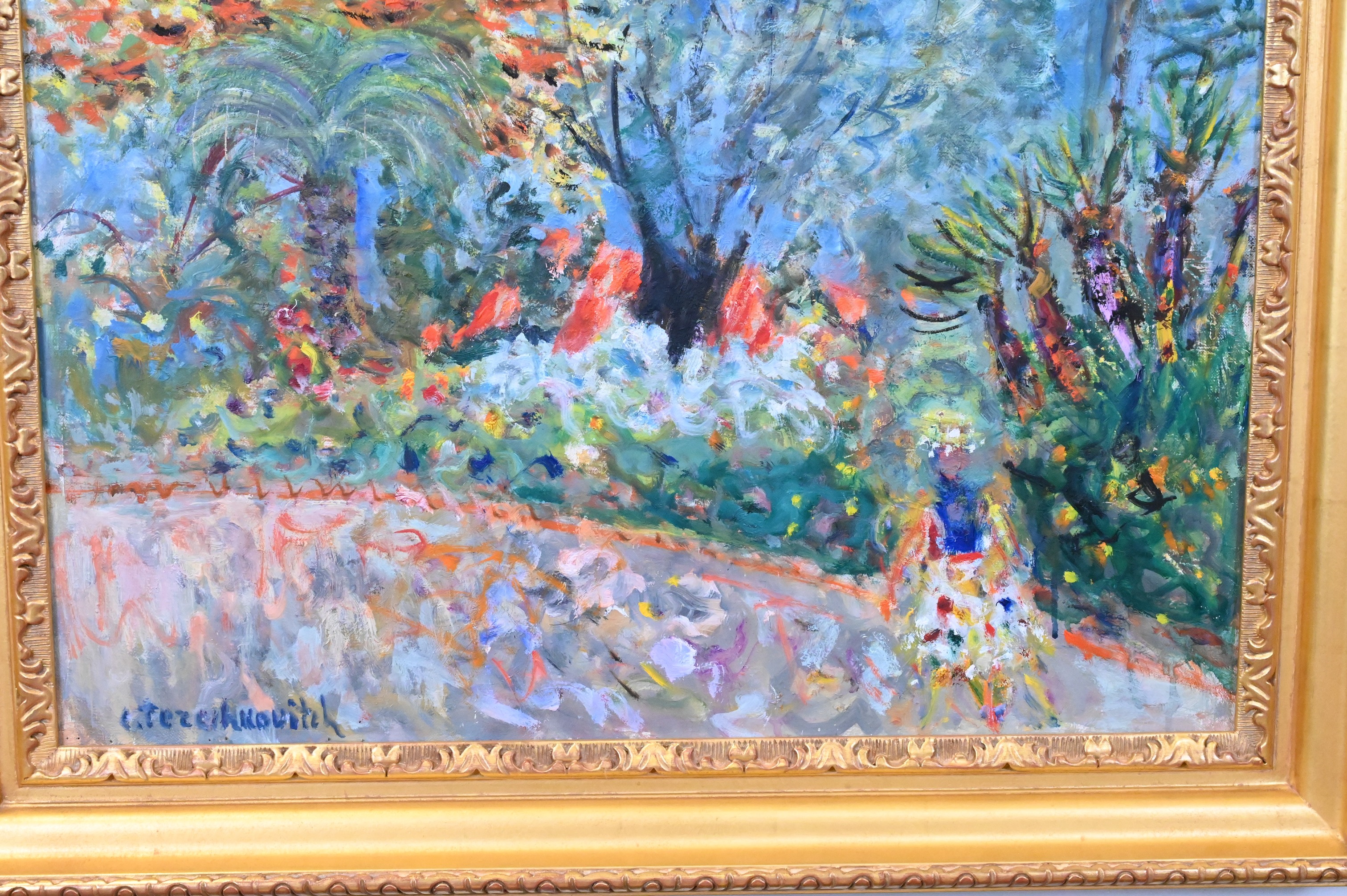 Vibrant Impressionist composition depicting a sunlit garden with flowering trees, lush greenery, and vivid blossoms in shades of red, orange, and violet beneath a soft blue sky; the scene conveys Terechkovitch’s characteristic joie de vivre and expressive colorism, executed with lively, textured brushwork and radiant light