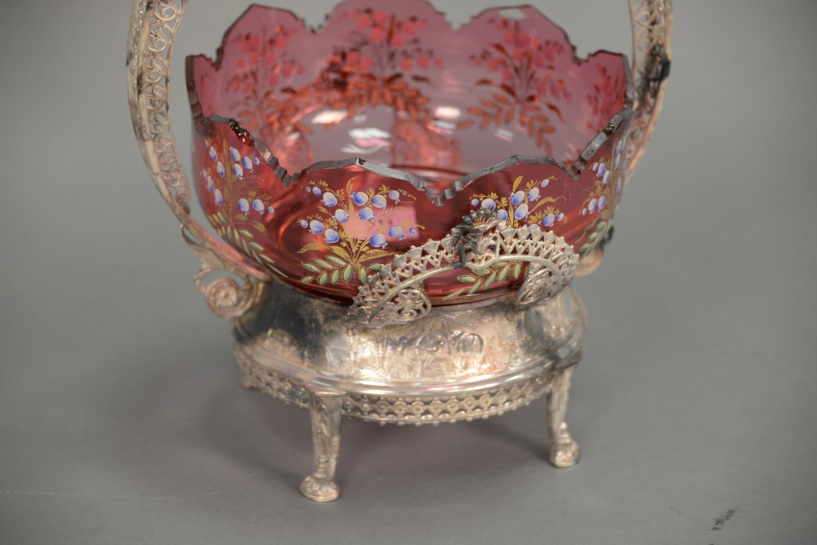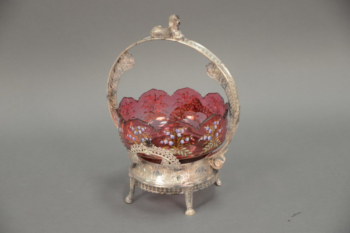 Lot 311: Cranberry enameled glass brides flower basket in Victorian silverplated footed basket, ht. 15 in.