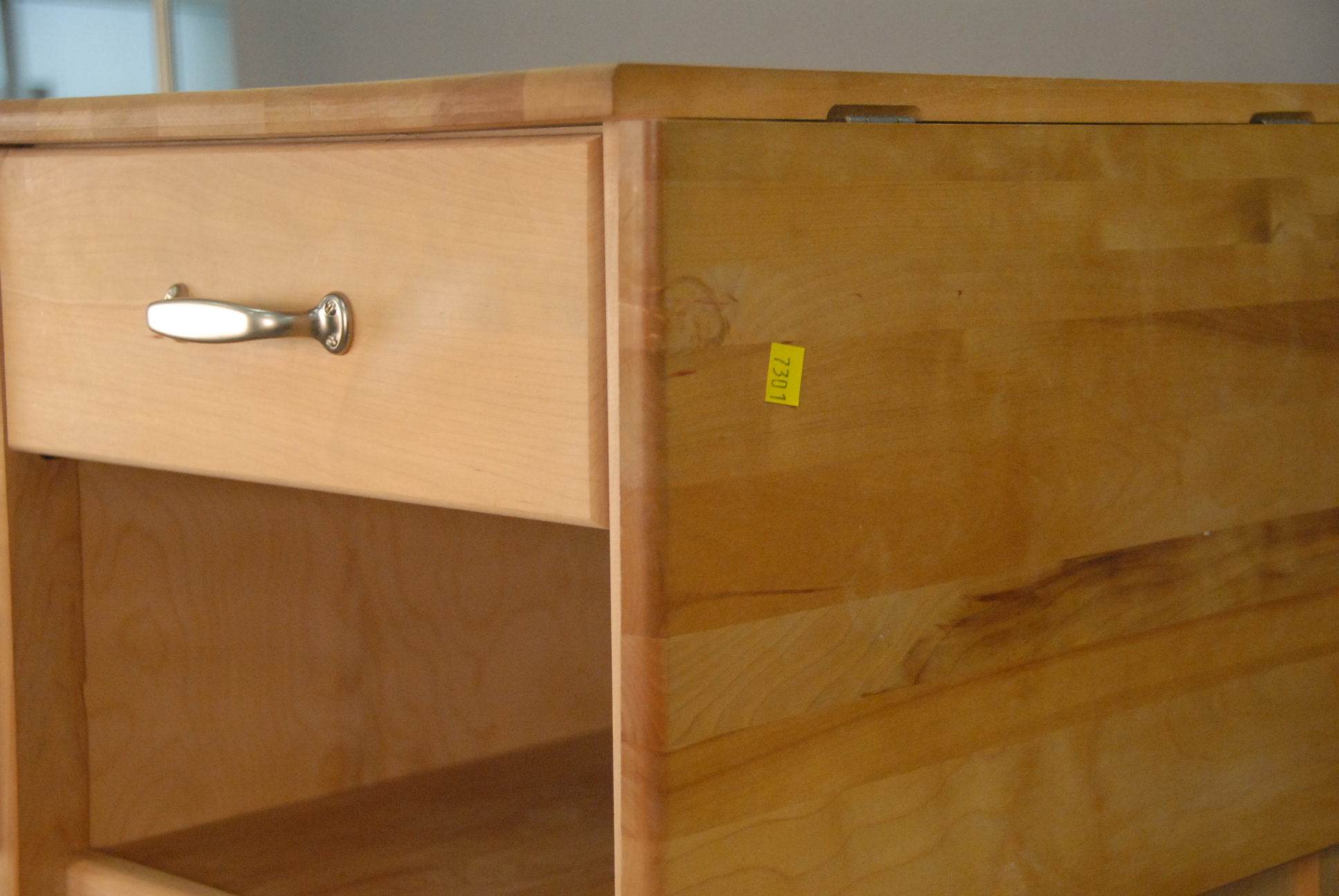 Lot 311: Crate & Barrel Kitchen butcher block stand on wheels, ht. 36in.