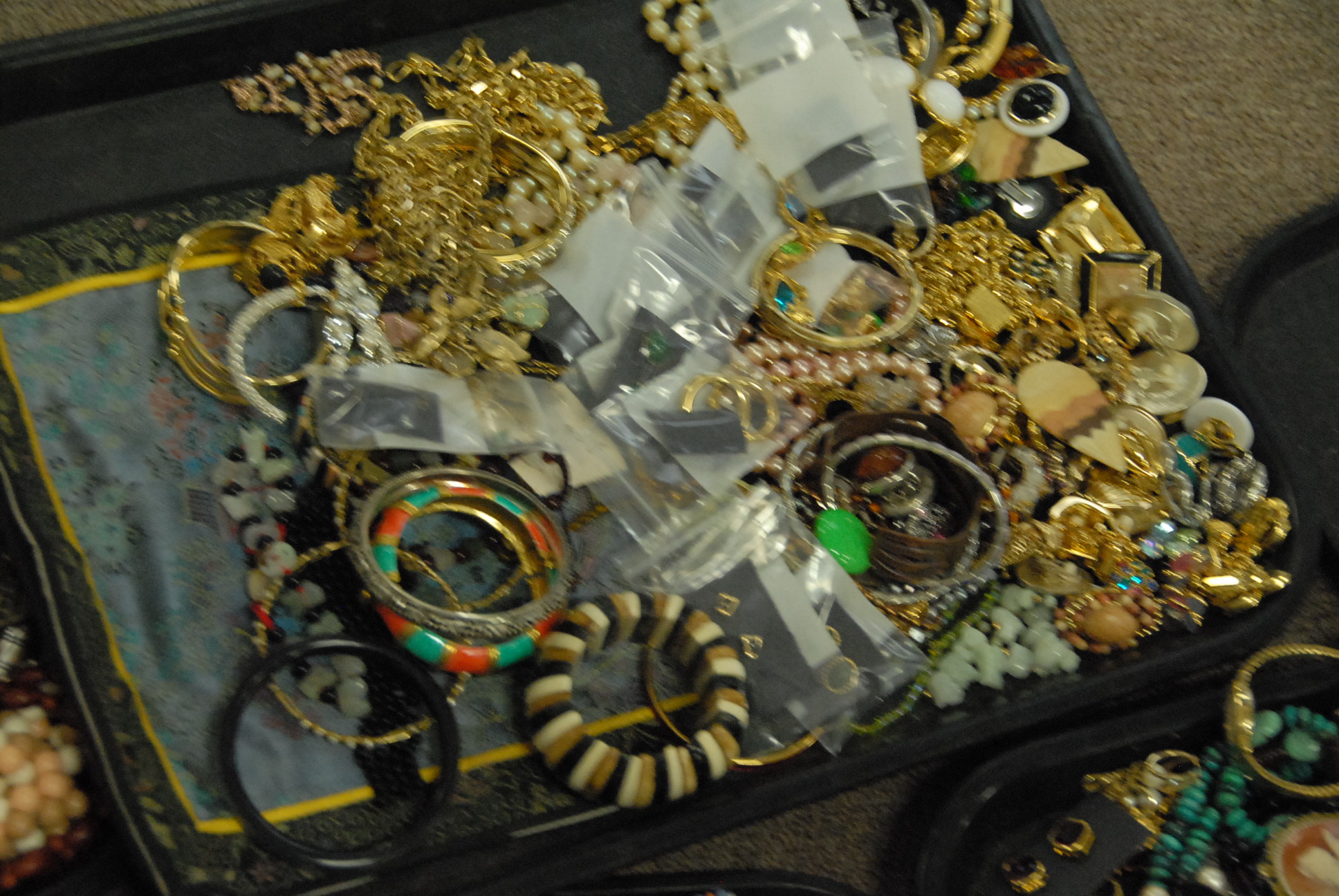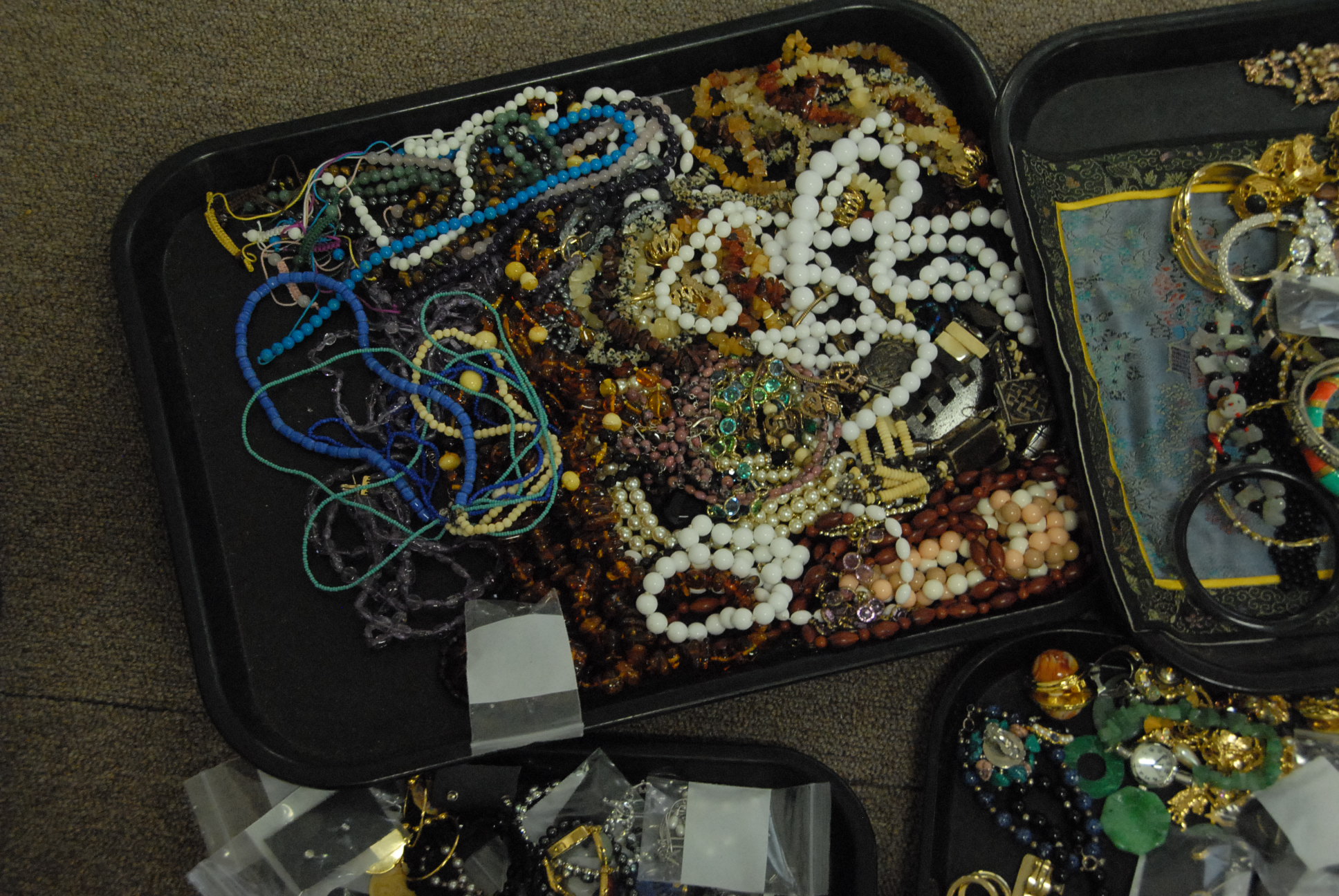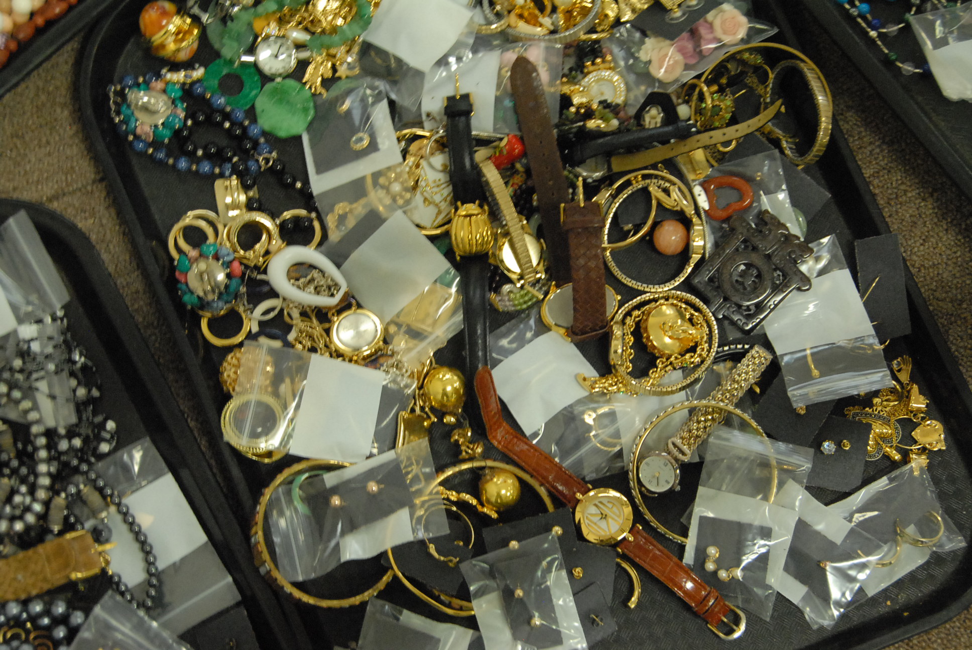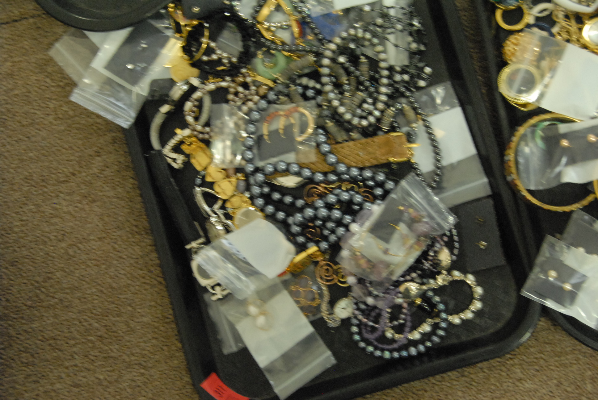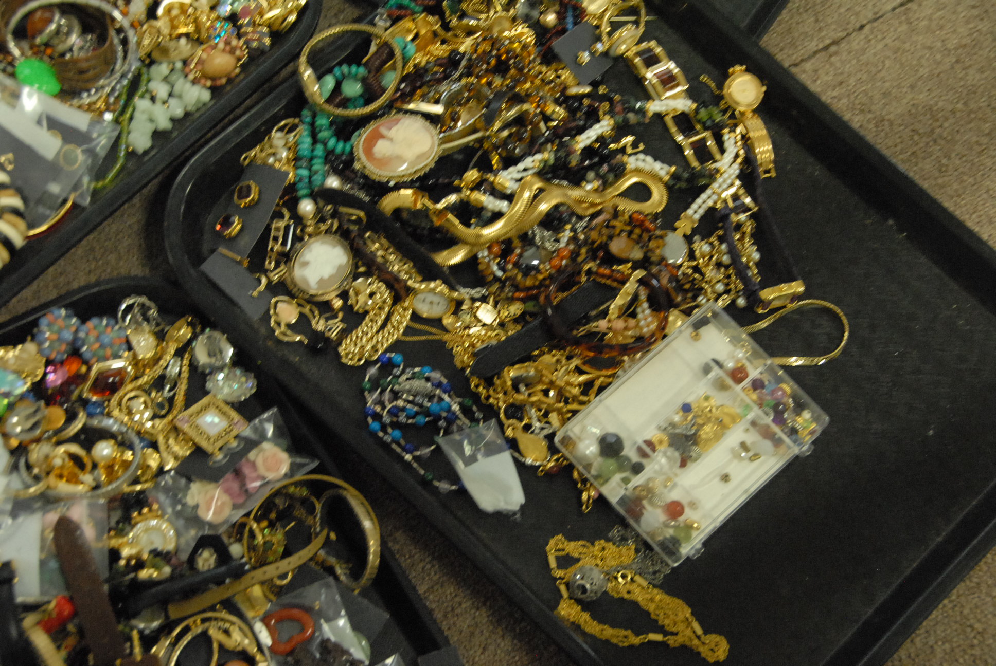 Five tray lots of various costume jewelry to include earrings, bracelets, chains, necklaces, and watches