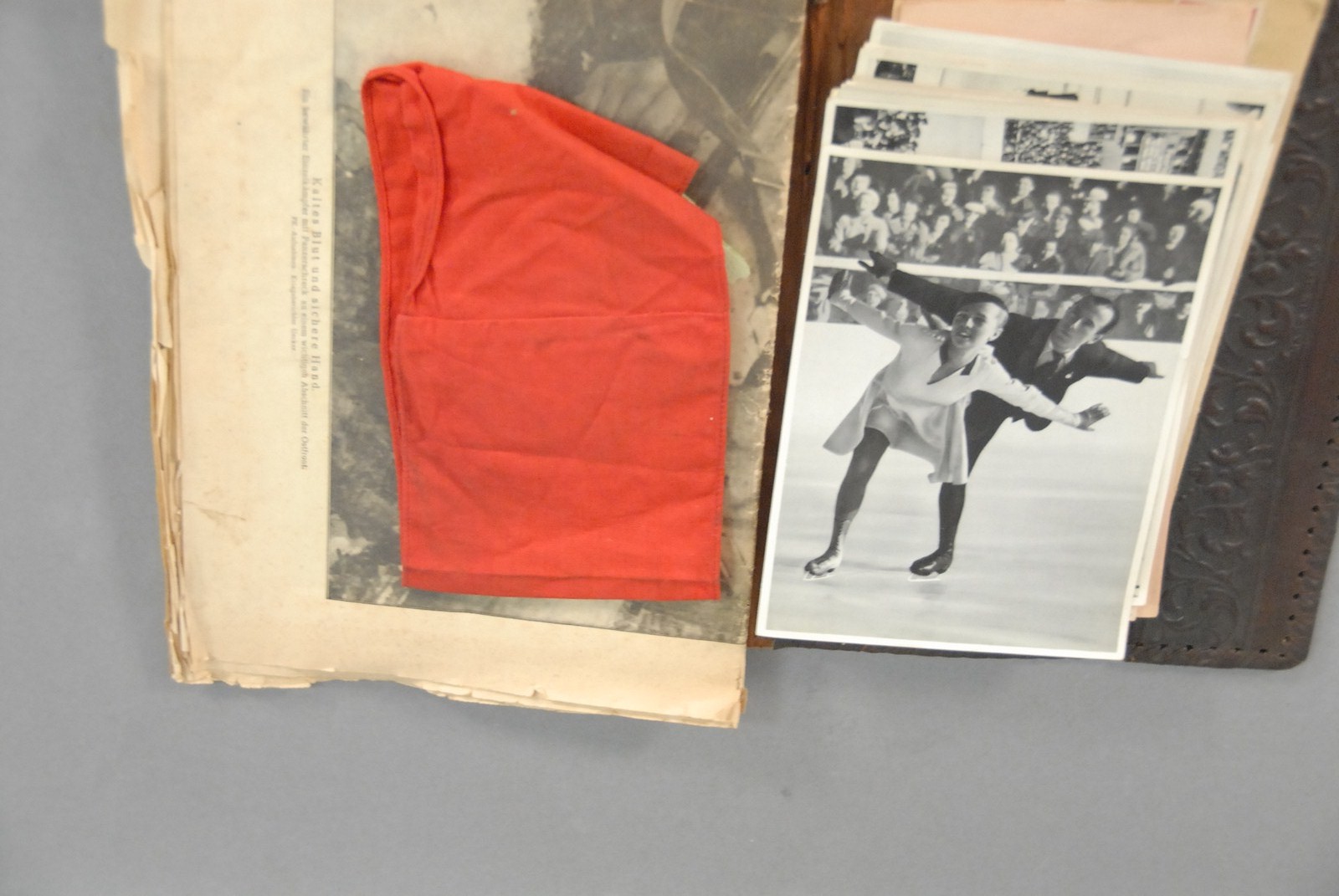 German memorabilia: copies of 1936 Olympic photos, Nazi red arm band, and 1939 Nazi medal.