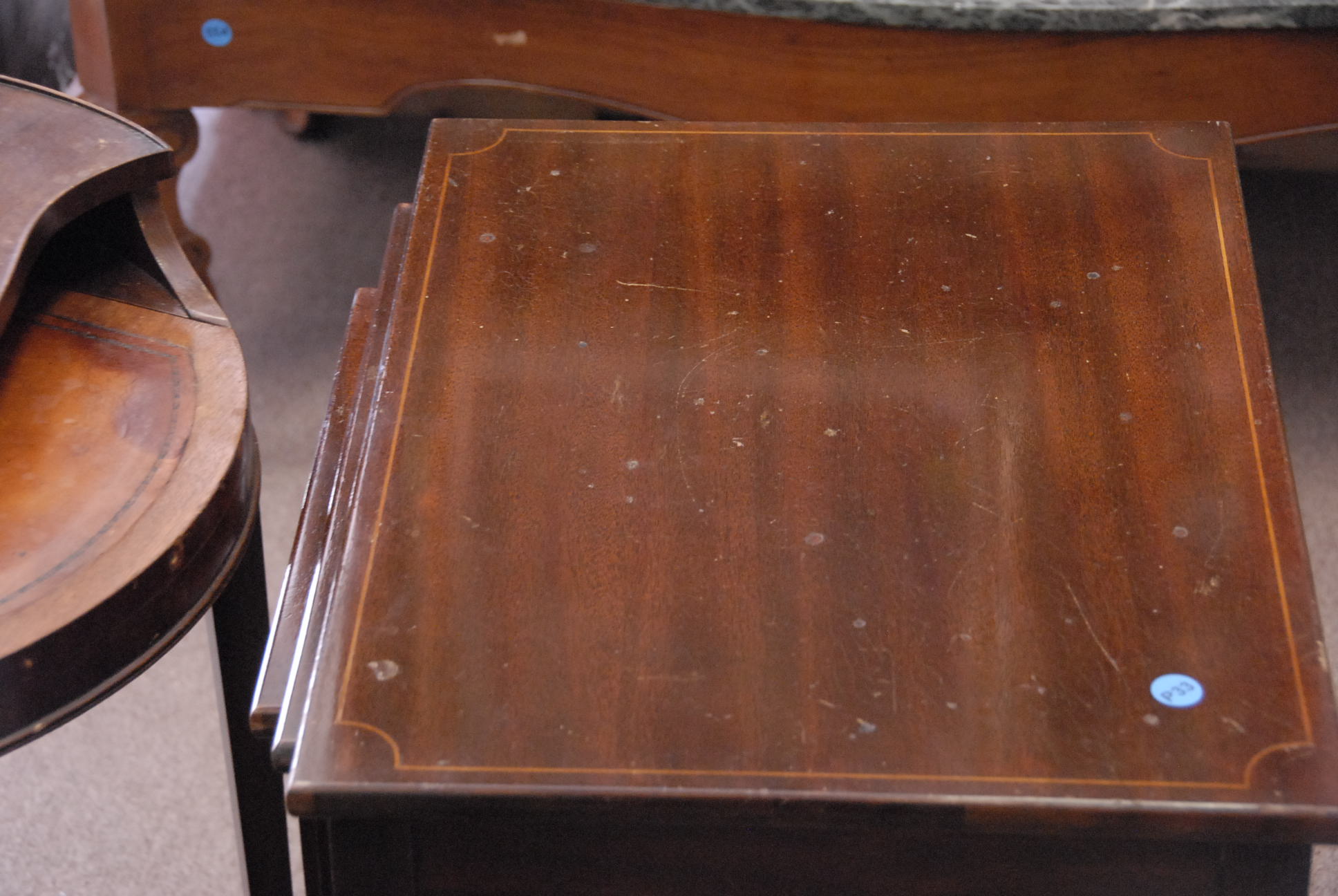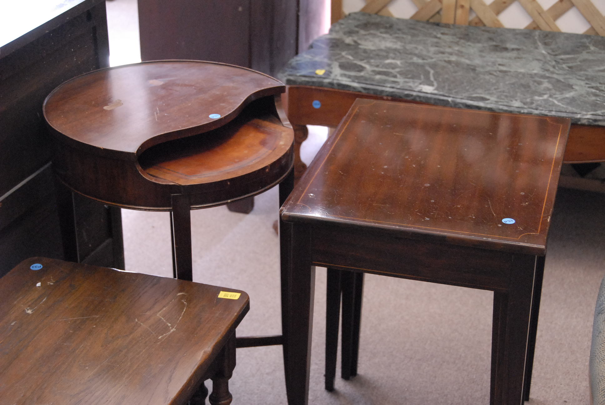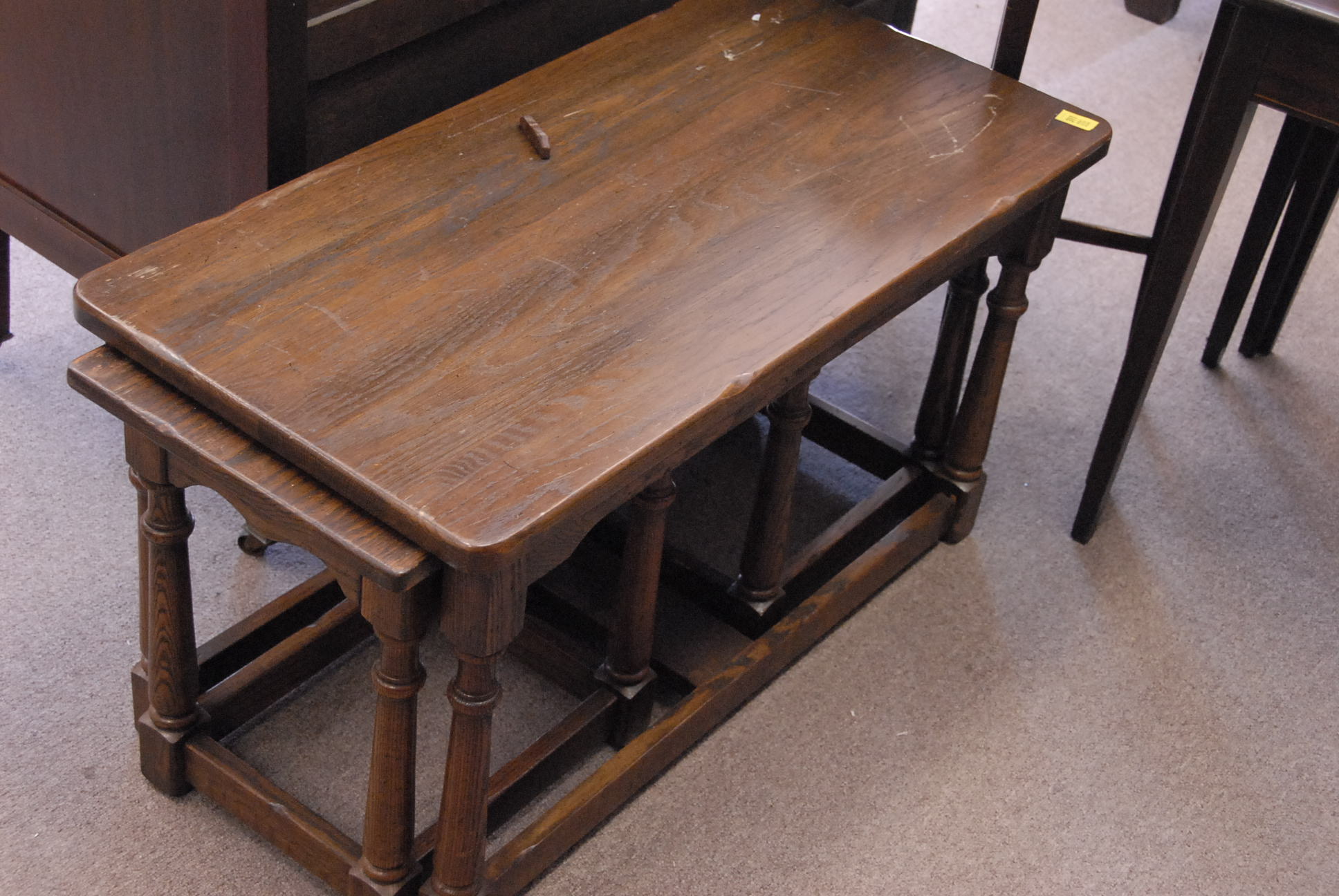 Group lot to include an oak coffee table with 2 pull outs, a mahogany telephone table with a leather pullout and 3 nest mahogany table.