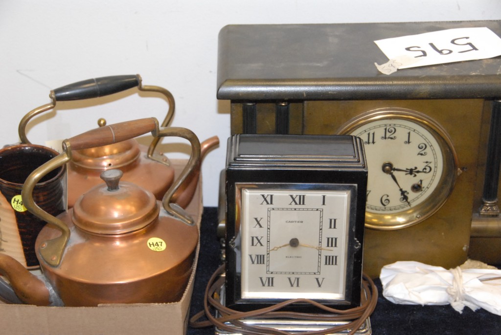 Group lot to include Chinese tong style horses, copper pots, and two clocks.