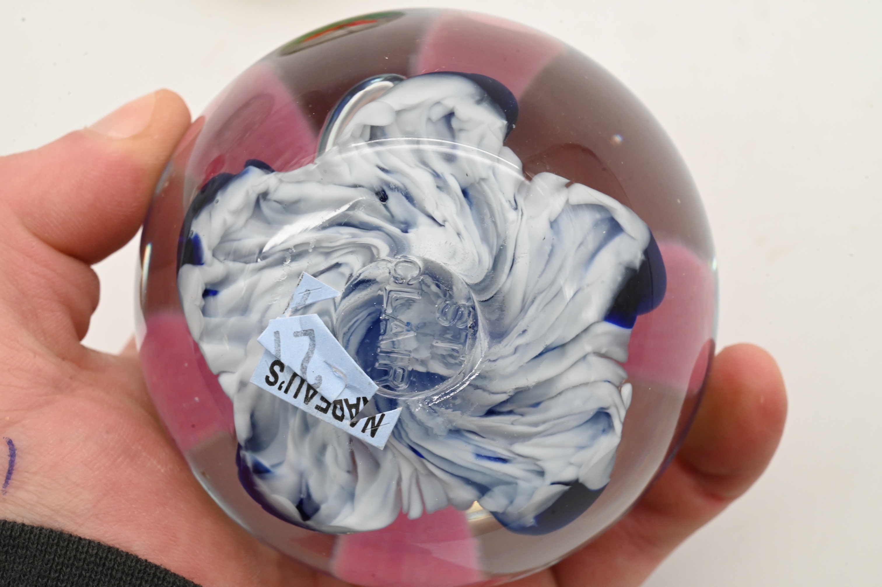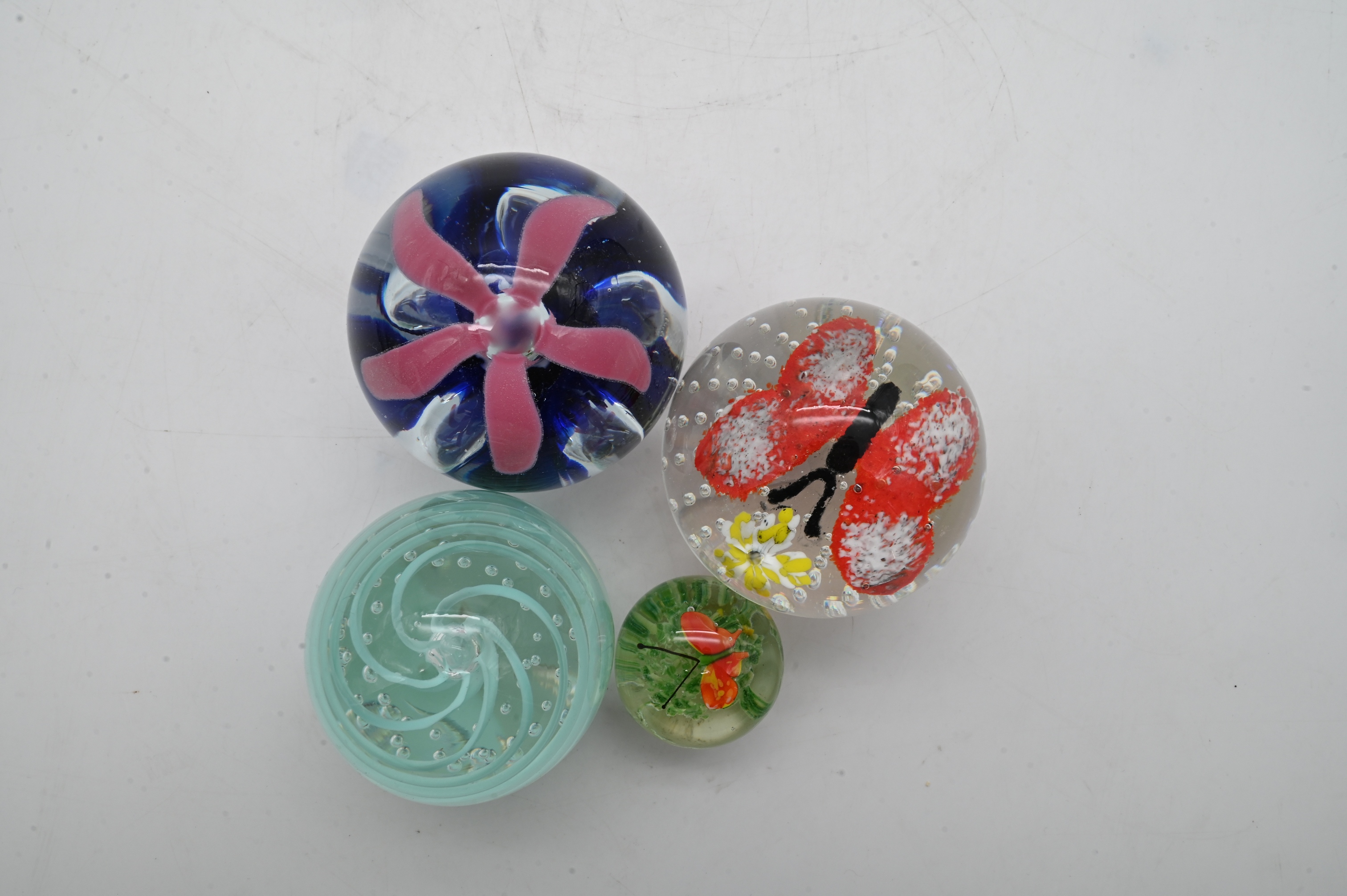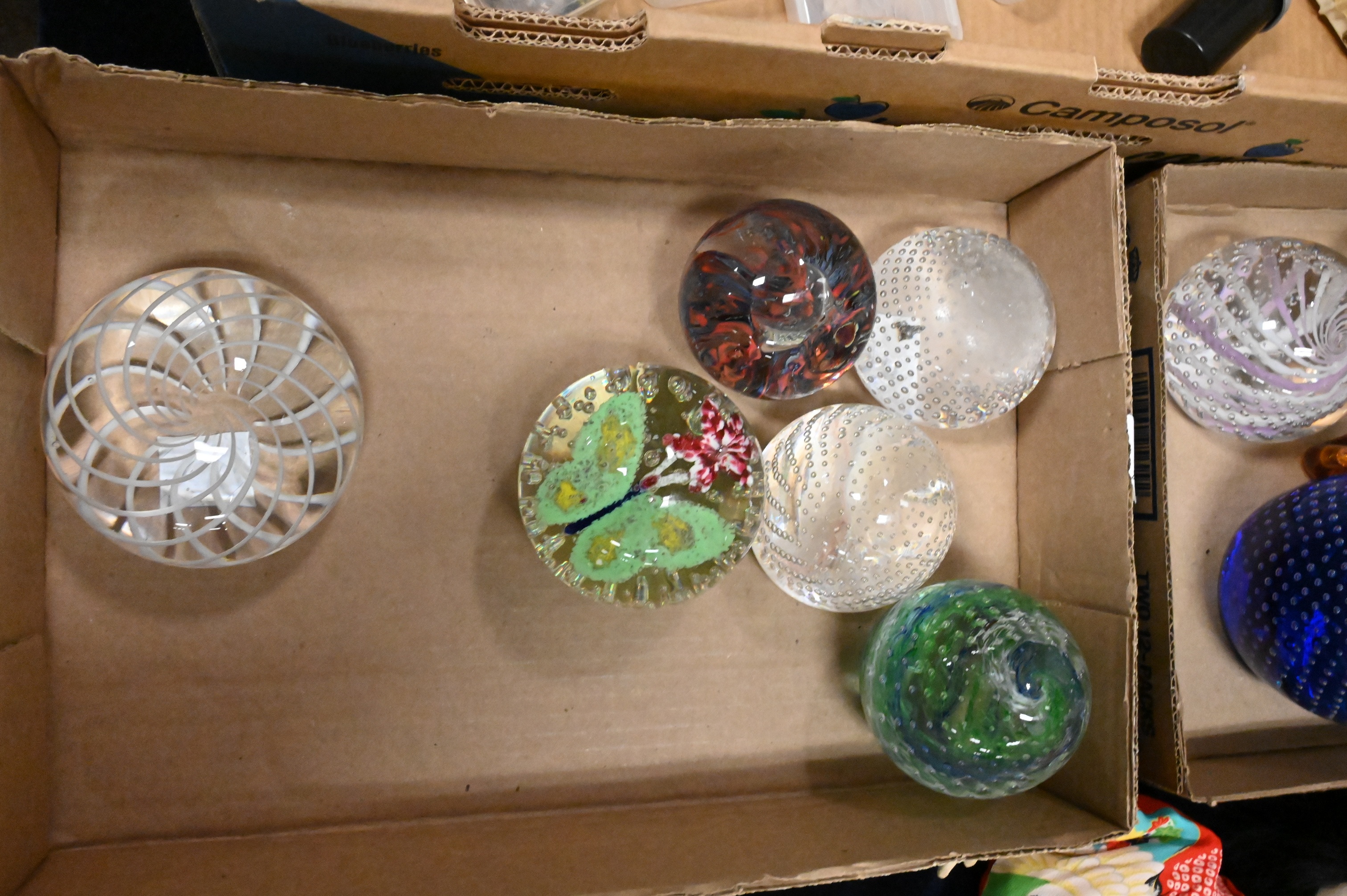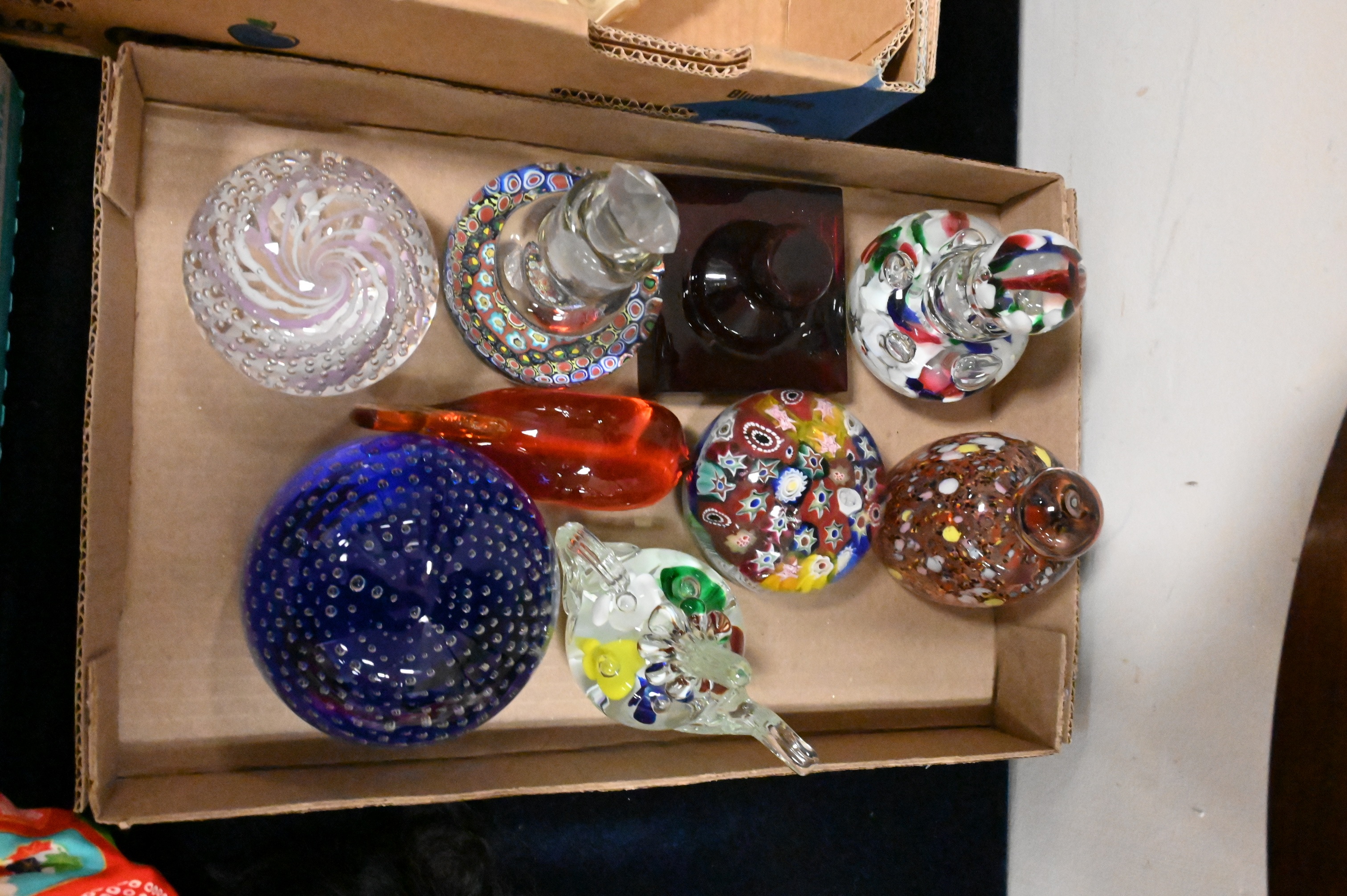 including examples with millefiori decoration controlled bubble interiors, swirl and spiral designs, butterflies, Pilgrim blown glass amber whale, floral inclusions, and abstract multicolor patterns, teapot form, stopper-top perfume bottles, St. Clair, Comprised of clear, cobalt, aqua, cranberry, and multicolored glass